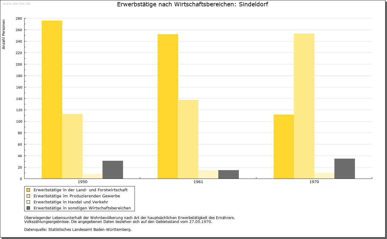 | Wirtschaft und Bevölkerung: | Zu Beginn des 17. Jahrhunderts lebten im Dorf 64 Familien, das heißt zwischen 250 und dreihundert Personen; 1654 waren es 79 Familien (circa 350 Seelen). Im Jahr 1700 wurde über Raumnot in der Pfarrkirche geklagt, in der die sechshundert Pfarrkinder keinen Platz mehr fänden; allerdings erscheint die damals genannte Zahl doch etwas zu hoch gegriffen. Immerhin war die Bevölkerungszunahme offenbar so groß, dass die Ernährung Probleme bereitete, denn 1723/24 wanderten mehrere Familien nach Ungarn aus. Am Ende des Alten Reiches zählte man in Sindeldorf rund 330 Seelen. Haupterwerbsquellen der Bevölkerung waren der Feld-, Obst- und Weinbau sowie Vieh- und Schafzucht. Die alte Kelter ist als großer Steinbau erhalten; an ihrem Dachstuhl sind die Jahreszahl 1698 und das Mainzer Wappen aufgemalt. Im 18. Jahrhundert hatte Sindeldorf zwei Schildwirtschaften und eine Mühle außerhalb des Orts. 1785 gab es auf der Gemarkung (insgesamt 1147 Morgen) 684 Morgen Äcker, 166 Morgen Weinberge und 24 Morgen Gärten; der Viehbestand belief sich im gleichen Jahr auf drei Pferde, ein Paar Ochsen, neunzig Kühe, vierzehn Rinder, vier Ziegen und vierzig Schweine. |