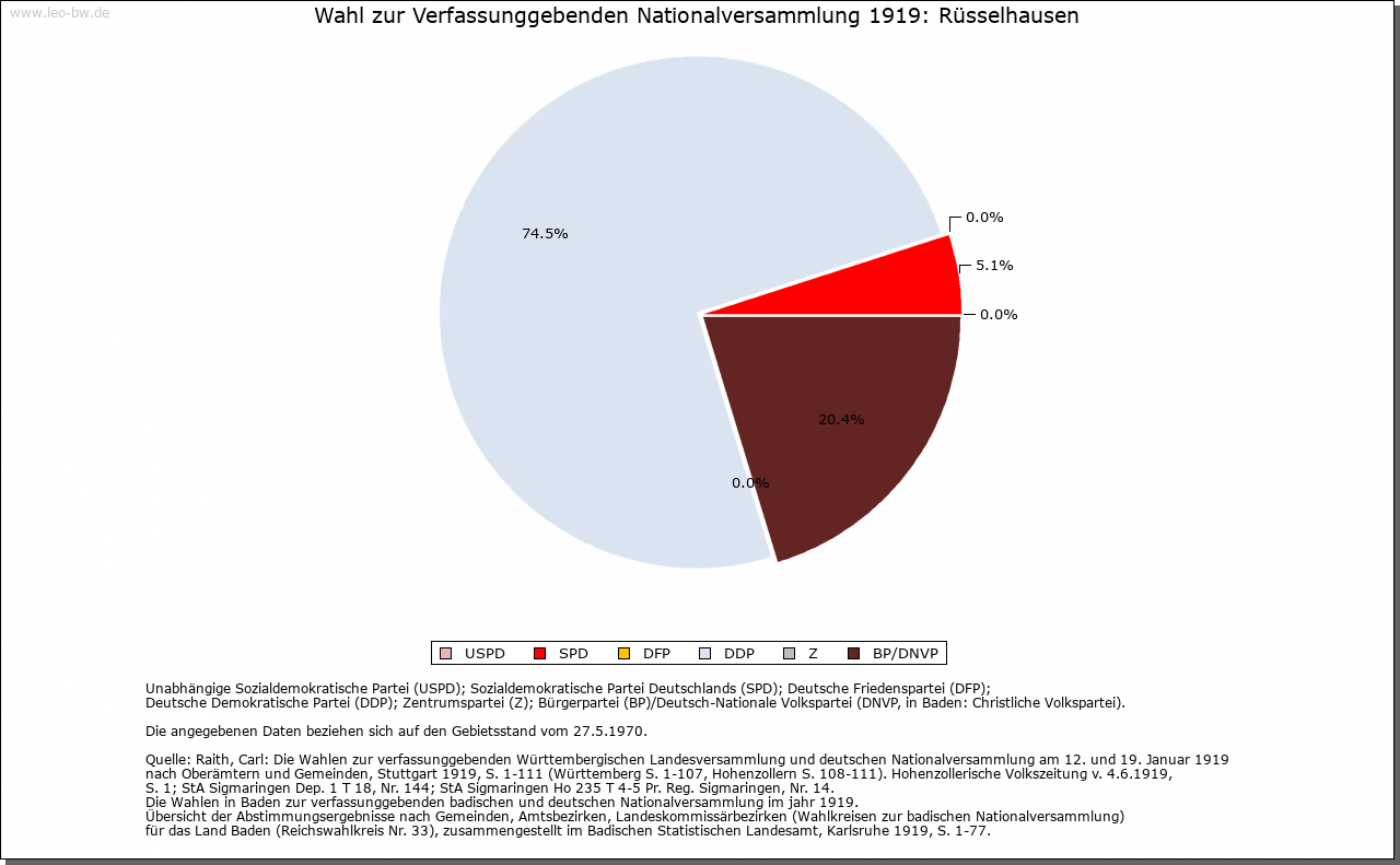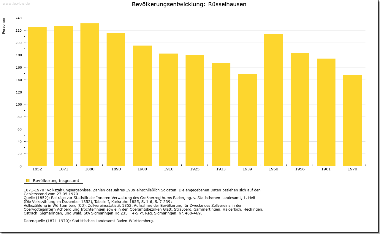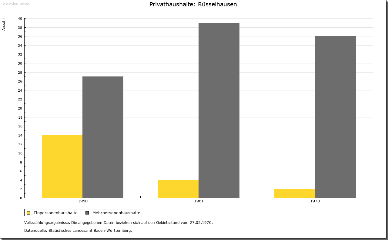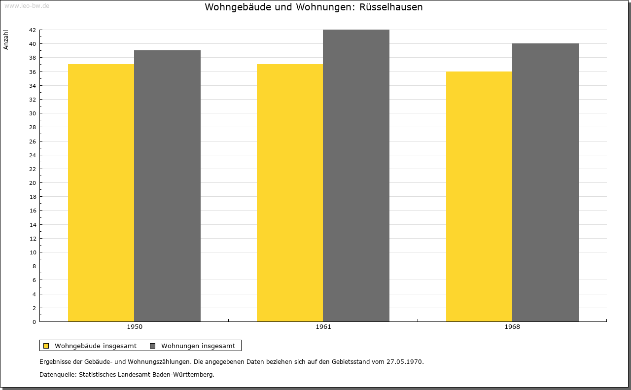 Geschichte: 1272, 1283 Ruesilthusen. Noch frühmittelalterlicher Ausbauweiler von Markelsheim. 1273 —1283 Niederadel von Rüsselhausen im Gefolge der Herren von Dürn. Vor 1410 der Ort wie Herrenzimmern an den Deutschen Orden und durch Albrecht von Hohenlohe vom Lehensnexus befreit. Dann wieder als hohenlohisches Lehen bei den Herren von Uissigheim. 1533 unmittelbar hohenlohisch. Mit dem Amt Pfitzingen 1806 unter württembergische Souveränität, 1809 Oberamt, 1938 Landkreis Mergentheim. Noch 1812 zur Gemeinde Pfitzingen, 1828/31 selbständig.