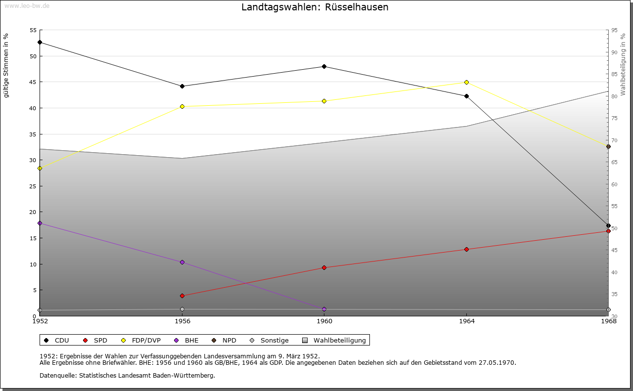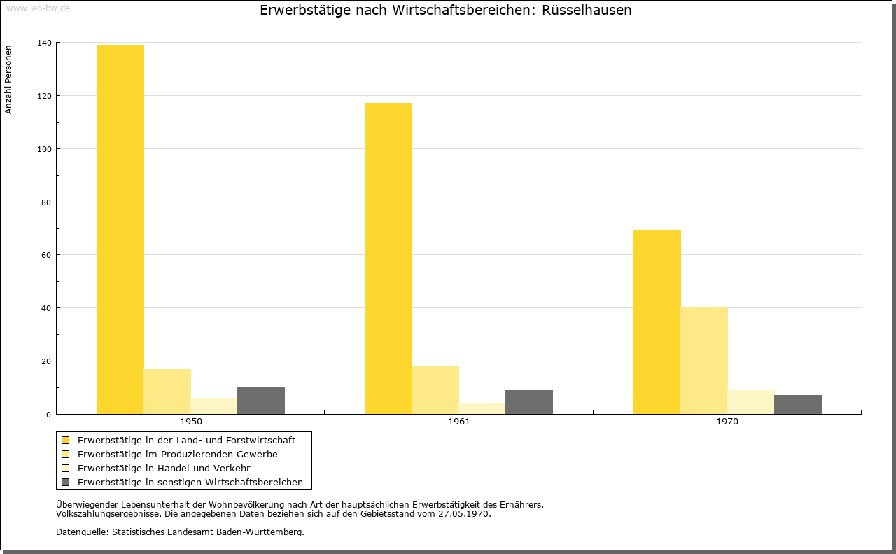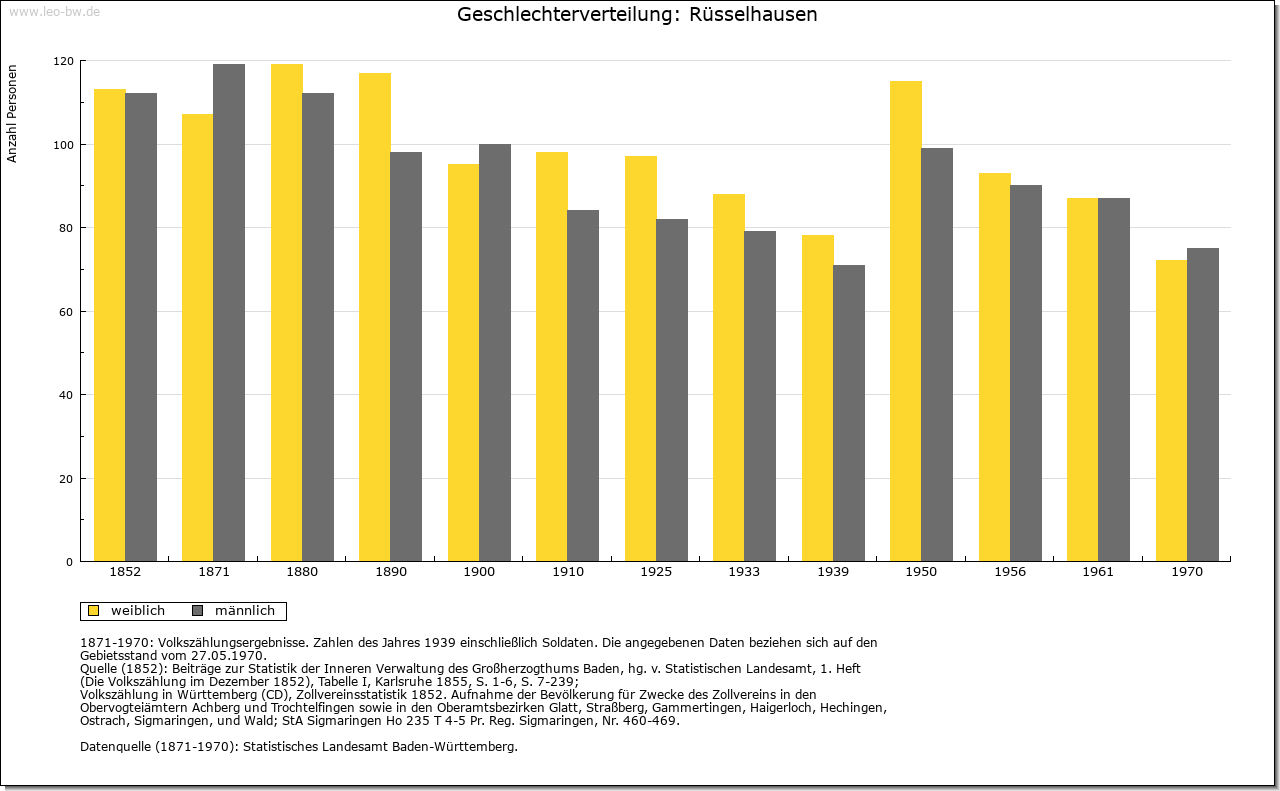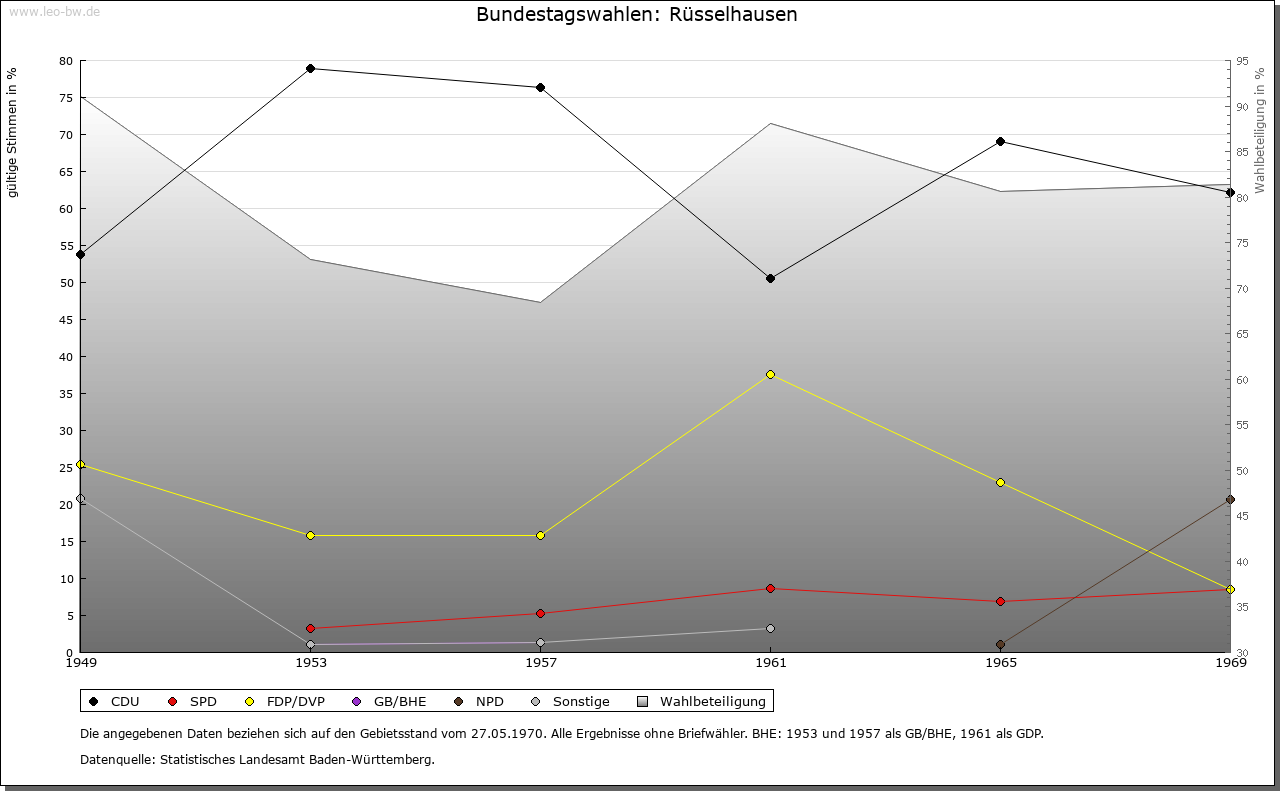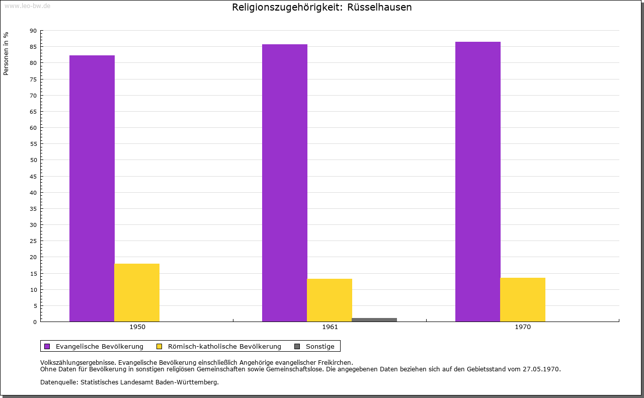 Geschichte: 1272, 1283 Ruesilthusen. Noch frühmittelalterlicher Ausbauweiler von Markelsheim. 1273 —1283 Niederadel von Rüsselhausen im Gefolge der Herren von Dürn. Vor 1410 der Ort wie Herrenzimmern an den Deutschen Orden und durch Albrecht von Hohenlohe vom Lehensnexus befreit. Dann wieder als hohenlohisches Lehen bei den Herren von Uissigheim. 1533 unmittelbar hohenlohisch. Mit dem Amt Pfitzingen 1806 unter württembergische Souveränität, 1809 Oberamt, 1938 Landkreis Mergentheim. Noch 1812 zur Gemeinde Pfitzingen, 1828/31 selbständig.