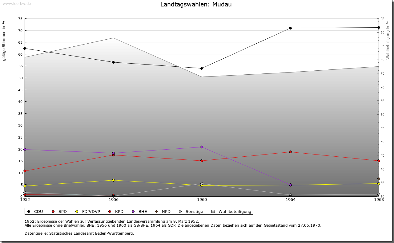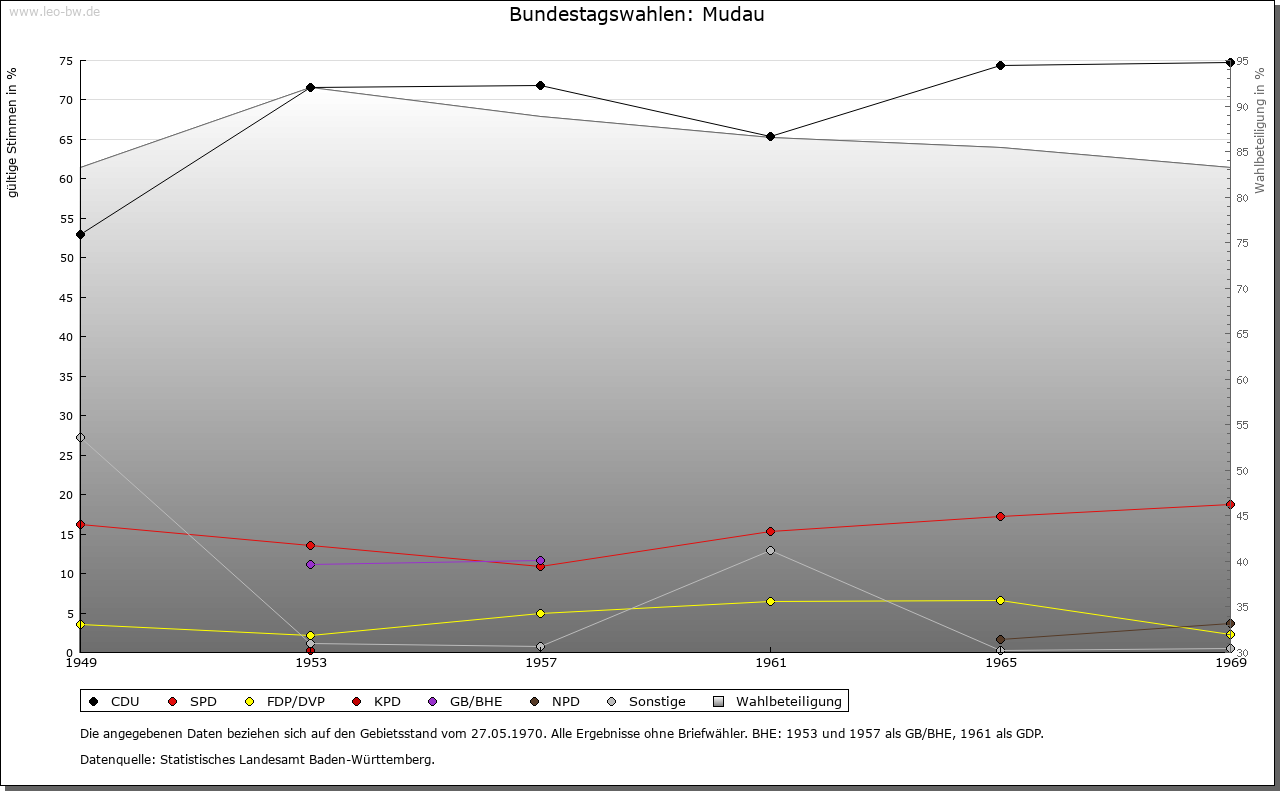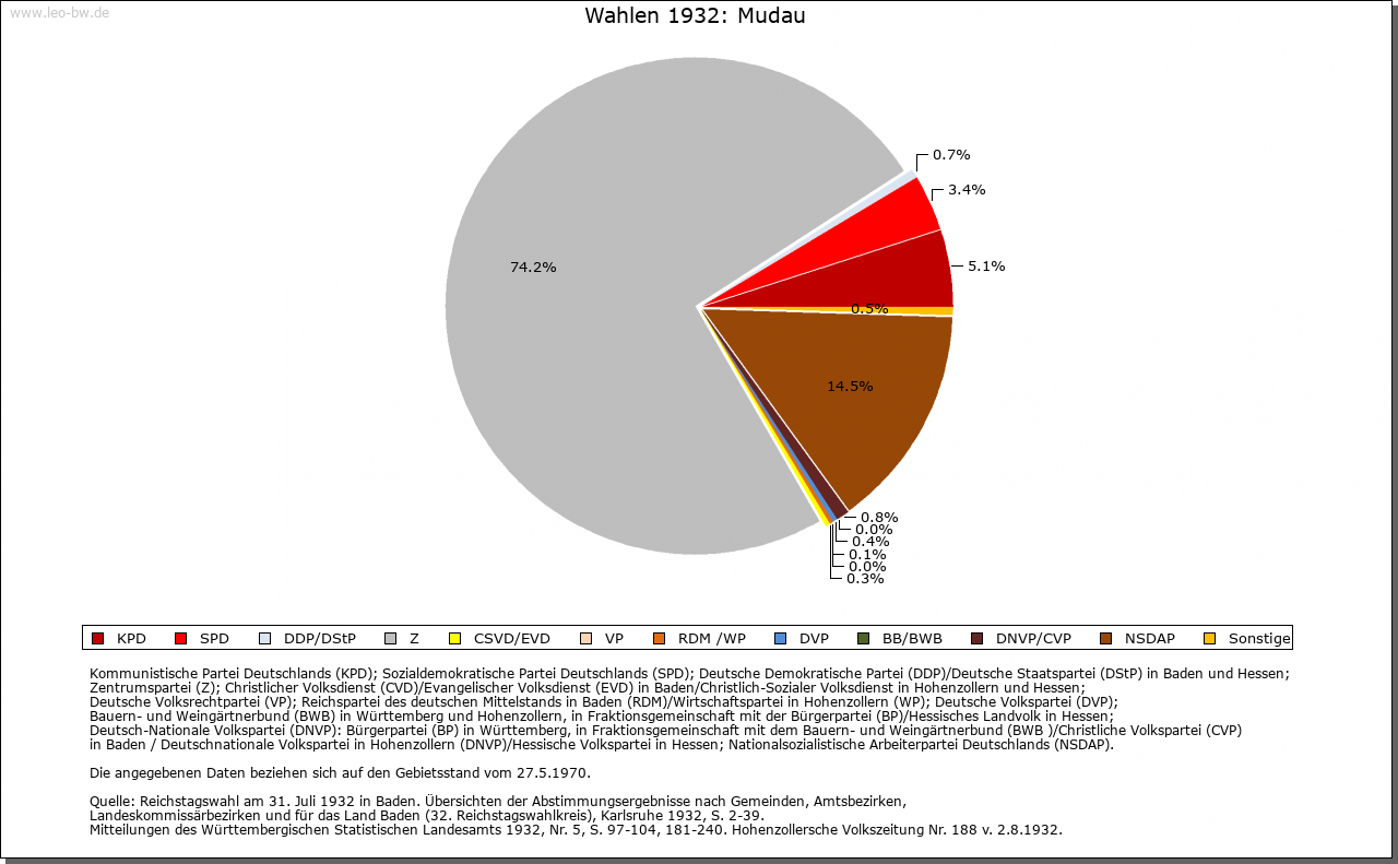 | Geschichte: | 1271 Mudahe, trübes Gewässer. Hochmittelalterlicher Rodungsort in dem zum Kloster Amorbach gehörigen Waldgebiet, in der Neuzeit ummauert, mit 2 Toren. Großbrand 1849. Amorbacher Grundherrschaft. Die Hoheitsrechte mit der Wildenburg verbunden und von den Amorbacher Vögten, den Herren von Dürn, 1271 als Zent Mudau an das Erzstift Mainz verkauft. Endgültig für Mainz erst gesichert, nachdem der Bischof von Würzburg seine ebenfalls von Amorbach herrührenden Ansprüche auf Mudau und die Zent 1303 an den Schenken Eberhard von Erbach und 1318 an den Erzbischof verkauft hatte. Mudau war Sitz einer Amtsvogtei des Oberamtes Amorbach. 1803 an Leiningen, 1806 unter badischer Oberhoheit. Das örtliche Amt 1813 aufgehoben, seither Buchen zuständig. 1935-1945 Großgemeinde mit Langenelz, Mörschenhardt und Donebach. Das Rathaus einst mainzisches Amtshaus aus dem 15. Jahrhundert. |