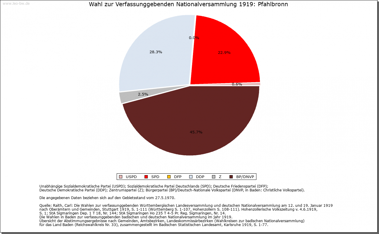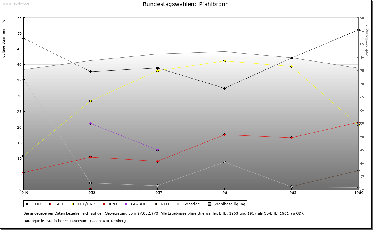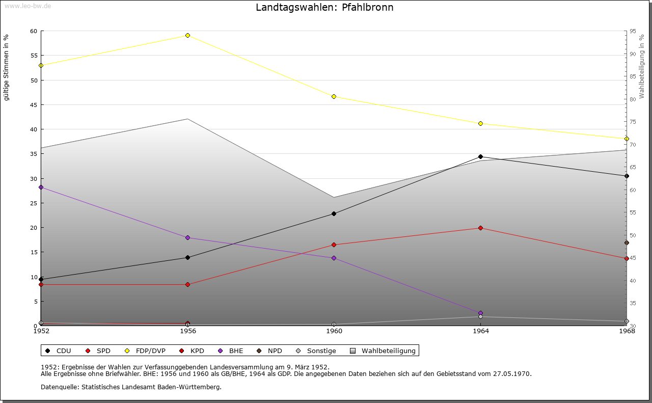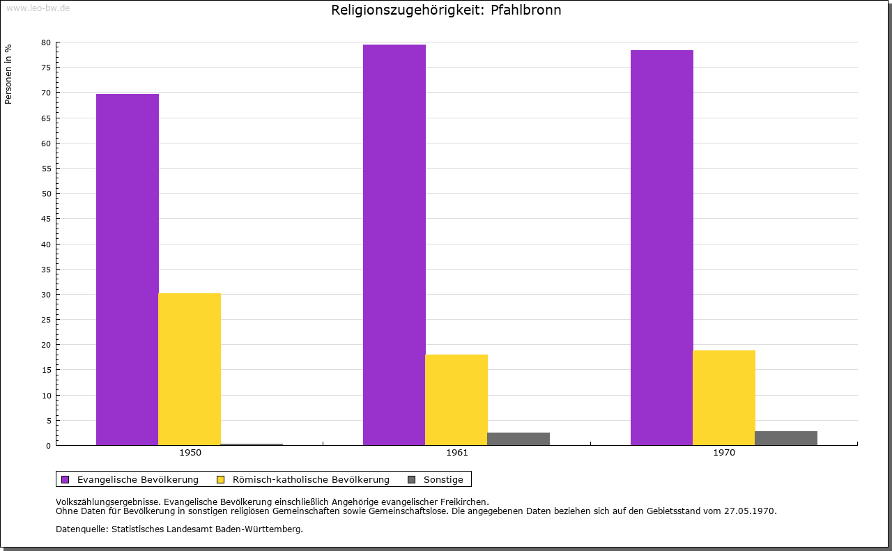 | Geschichte: | 1293 in Pfalbrunen (Pfahl = Limes), merowingerzeitlicher Ort. Der größte Teil des Orts kam schon früh an das Kloster Lorch, wahrscheinlich durch seine Stifter, die Staufer. Das Kloster unterhielt in Pfahlbronn ein Amt. Über einige Güter des Gmünder Predigerklosters übte bis 1803 die Reichsstadt die Vogtei aus. Durch die Reformation kam Pfahlbronn mit Lorch an Württemberg und gehörte bis 1806 zum Kloster-Oberamt Lorch, dann zum Oberamt Welzheim, seit 1938 zum Landskreis Schwäbisch Gmünd. Eselshalden, Krähenhof (unbewohnt), Langenberg, Taubenhof und Vorderhundsberg wurden am 1.1.1969 nach Welzheim eingemeindet. |