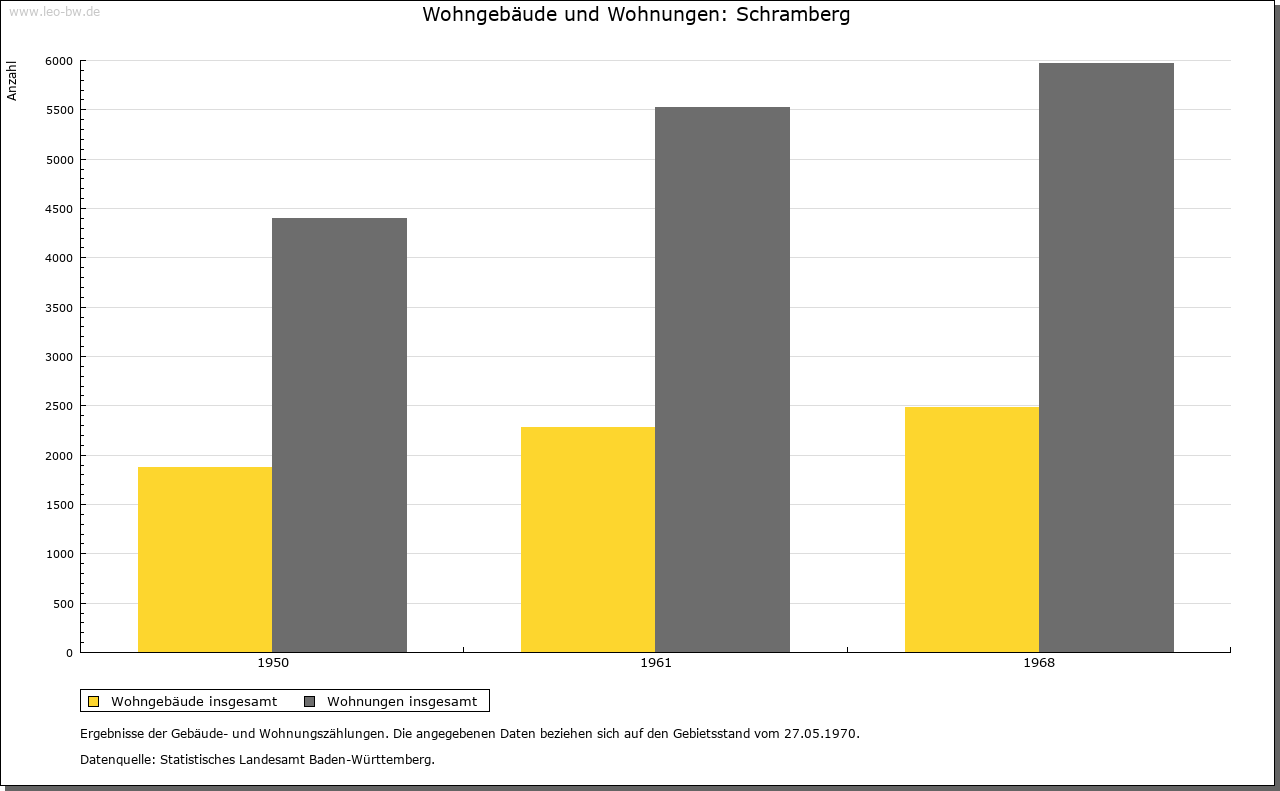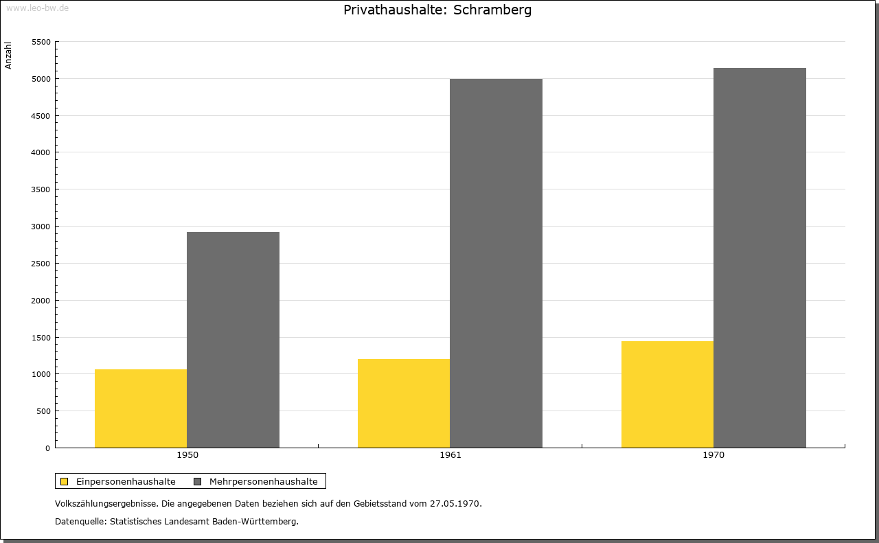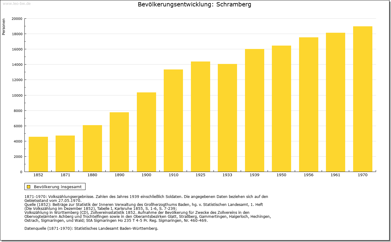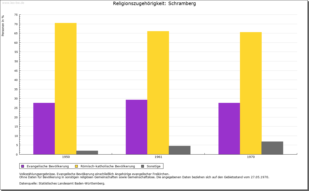 Ortslage und Siedlung (bis 1970): | Erste Hinweise auf Besitzungen innerhalb der späteren Gemeinde Schramberg erhält man aus einer Rottweiler Urkunde von 1304, wonach die Herzöge von Teck den Herren von Schilteck unter anderem ihre Güter im Göttelbachtal (wohl das Glasbachlehen, welches später ein Teil des Haasenhofes bildet) und Schramberg als Mitgift überlassen. Ab der Mitte des 14. Jahrhunderts werden dann die Nachweise dichter. So erwarben die Falkensteiner 1347 von Johann von Tanneck die Burg Schilteck, die Mühle zu Schramberg, die Lehensgüter am Lauterbach, im Göttelbach und auf dem Lienberg. 1353 wurde Schramberg zum ersten Mal als Ort einer Siedlung erwähnt. Im Laufe des 14. Jahrhunderts gelangte diese in den Besitz der Ramsteiner. Das Kernland der Falkensteiner Herrschaft um¬fasste circa 16 Höfe und einen kleinen Weiler (10–15 Häuser) bei der Falkensteiner Kapelle. Der Kern der ersten Siedlung Schramberg lag in nord-südlicher Richtung im Tal zu beiden Seiten der Schiltach. Es handelte sich hierbei um einen typischen Siedlungsausbau des hohen Mittelalters. Das unter Rochus Merz angefertigte Urbar gibt den Stand des Jahres 1547 wieder. Zu Schramberg gehörten somit die Höfe des Göttelbachtales: der Wendelhansenhof, der Haasenhof, das Schwabenhöfle (oder Neefenhof), der Stammelbachhof und das Obermühlhofgut mit der Bannmühle; die Höfe auf dem Schramberger Bauernberg: der Cassiershof (auf dessen Gebiet der von Rochus Merz gegründete Marktflecken entstand), der Ochsenwirtshof (oder Königslehen) und das Bühlehöfle (oder: Hof beim Spital); an der Schiltach: der Schweigerhof und der Vogtshof (oder der Lammwirtshof); die Höfe im Lauterbachtal: der Tösshof vor dem Lauterbach (erst 1558 zu Schramberg, vorher Besitz der Württemberger) und das Amtslehen. Die Höfe waren alle circa zwischen 50–200 Hektar groß. Neben der Viehhaltung, im allgemeinen Hühner und Kühe, wurden auf den Äckern hauptsächlich Roggen, Hafer, Gerste und Wicken angebaut. Die Lehnsbauern mussten jährlich neben den Bodenabgaben (Boden-, Grund- und Martinszins), den Großzehnt an die Kirche und die Schatzung an die Landschaft entrichten. Laut Urbar wurden im Amt Schramberg mit einem Bodenzins belegt: der Friedrichsberg, vier Häuser bei Oberreute, der Imbrand, der Haldenhof, das Häfis (?), der Tischneck, der Hauchenstein, der Töss, die Schilteck, der Finsterbach, der Hottenbach zu Hintersulgen, der Kirnbach in Schramberg, Hintersulgen, der Sulgerberg, Sulgen, Schramberg, der Falkenstein, das Göttelbachtal und das Spital bei Schramberg. In Schramberg wurden außer den Verwüstungen durch Kriegseinwirkung auch Hochwasserkatastrophen für die Jahre 1688, 1702, 1709, 1778 und 1802 sowie verheerende Ortsbrände von 1716 (26 Gebäude und der Kirchturm), 1790 und 1805 (73 betroffene Familien) bezeugt. Siedlungserweiterung teilweise mit Industrieanlagen in drei Seitentälern. Zahlreiche Neubauten in Hanglage. |