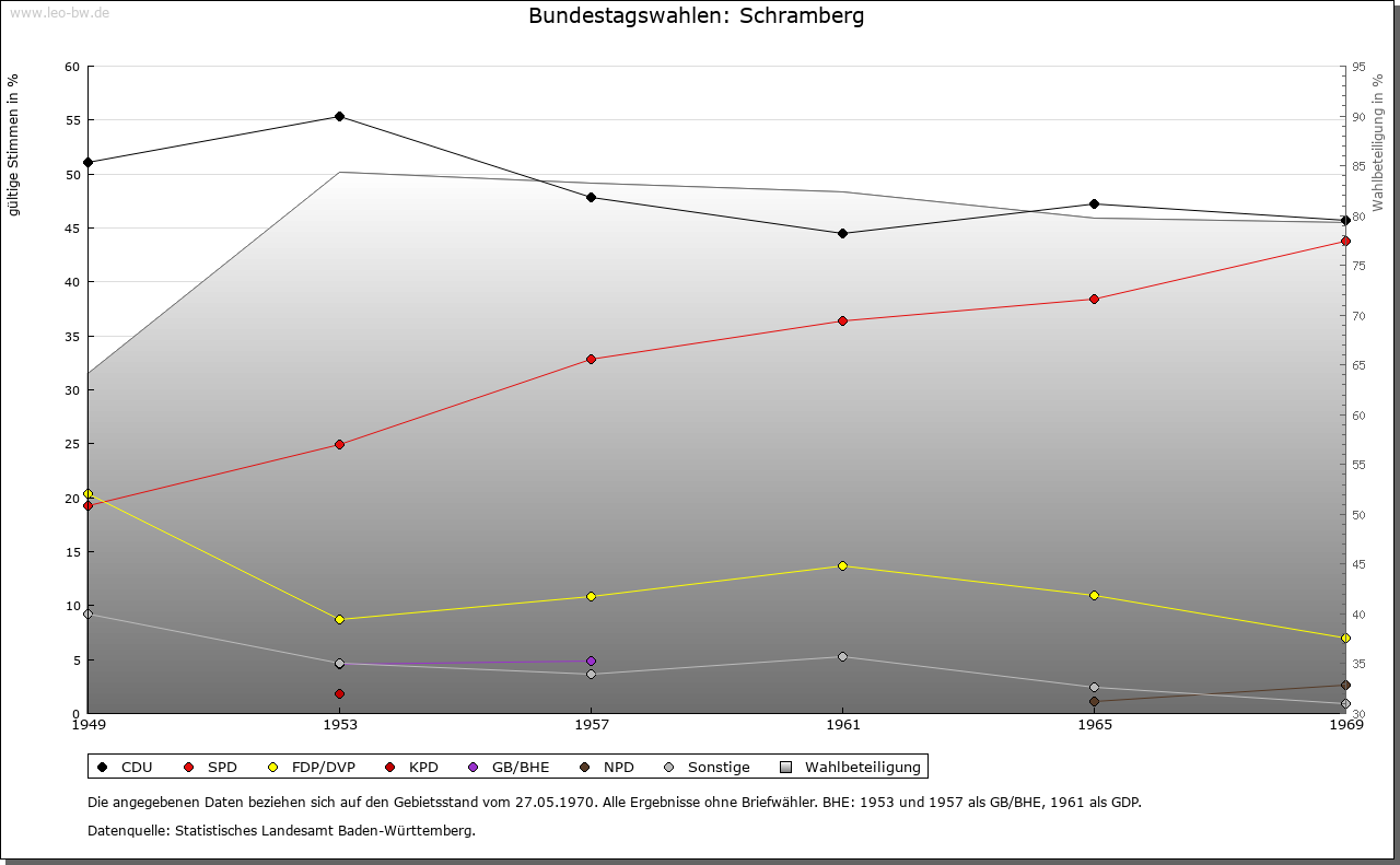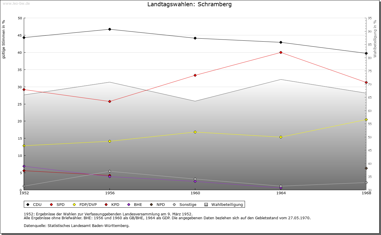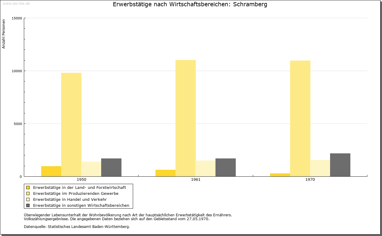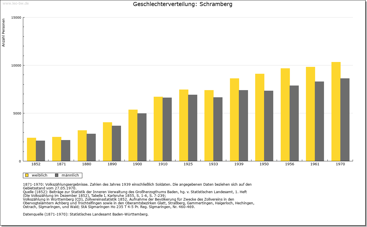 Ortslage und Siedlung (bis 1970): | Erste Hinweise auf Besitzungen innerhalb der späteren Gemeinde Schramberg erhält man aus einer Rottweiler Urkunde von 1304, wonach die Herzöge von Teck den Herren von Schilteck unter anderem ihre Güter im Göttelbachtal (wohl das Glasbachlehen, welches später ein Teil des Haasenhofes bildet) und Schramberg als Mitgift überlassen. Ab der Mitte des 14. Jahrhunderts werden dann die Nachweise dichter. So erwarben die Falkensteiner 1347 von Johann von Tanneck die Burg Schilteck, die Mühle zu Schramberg, die Lehensgüter am Lauterbach, im Göttelbach und auf dem Lienberg. 1353 wurde Schramberg zum ersten Mal als Ort einer Siedlung erwähnt. Im Laufe des 14. Jahrhunderts gelangte diese in den Besitz der Ramsteiner. Das Kernland der Falkensteiner Herrschaft um¬fasste circa 16 Höfe und einen kleinen Weiler (10–15 Häuser) bei der Falkensteiner Kapelle. Der Kern der ersten Siedlung Schramberg lag in nord-südlicher Richtung im Tal zu beiden Seiten der Schiltach. Es handelte sich hierbei um einen typischen Siedlungsausbau des hohen Mittelalters. Das unter Rochus Merz angefertigte Urbar gibt den Stand des Jahres 1547 wieder. Zu Schramberg gehörten somit die Höfe des Göttelbachtales: der Wendelhansenhof, der Haasenhof, das Schwabenhöfle (oder Neefenhof), der Stammelbachhof und das Obermühlhofgut mit der Bannmühle; die Höfe auf dem Schramberger Bauernberg: der Cassiershof (auf dessen Gebiet der von Rochus Merz gegründete Marktflecken entstand), der Ochsenwirtshof (oder Königslehen) und das Bühlehöfle (oder: Hof beim Spital); an der Schiltach: der Schweigerhof und der Vogtshof (oder der Lammwirtshof); die Höfe im Lauterbachtal: der Tösshof vor dem Lauterbach (erst 1558 zu Schramberg, vorher Besitz der Württemberger) und das Amtslehen. Die Höfe waren alle circa zwischen 50–200 Hektar groß. Neben der Viehhaltung, im allgemeinen Hühner und Kühe, wurden auf den Äckern hauptsächlich Roggen, Hafer, Gerste und Wicken angebaut. Die Lehnsbauern mussten jährlich neben den Bodenabgaben (Boden-, Grund- und Martinszins), den Großzehnt an die Kirche und die Schatzung an die Landschaft entrichten. Laut Urbar wurden im Amt Schramberg mit einem Bodenzins belegt: der Friedrichsberg, vier Häuser bei Oberreute, der Imbrand, der Haldenhof, das Häfis (?), der Tischneck, der Hauchenstein, der Töss, die Schilteck, der Finsterbach, der Hottenbach zu Hintersulgen, der Kirnbach in Schramberg, Hintersulgen, der Sulgerberg, Sulgen, Schramberg, der Falkenstein, das Göttelbachtal und das Spital bei Schramberg. In Schramberg wurden außer den Verwüstungen durch Kriegseinwirkung auch Hochwasserkatastrophen für die Jahre 1688, 1702, 1709, 1778 und 1802 sowie verheerende Ortsbrände von 1716 (26 Gebäude und der Kirchturm), 1790 und 1805 (73 betroffene Familien) bezeugt. Siedlungserweiterung teilweise mit Industrieanlagen in drei Seitentälern. Zahlreiche Neubauten in Hanglage. |