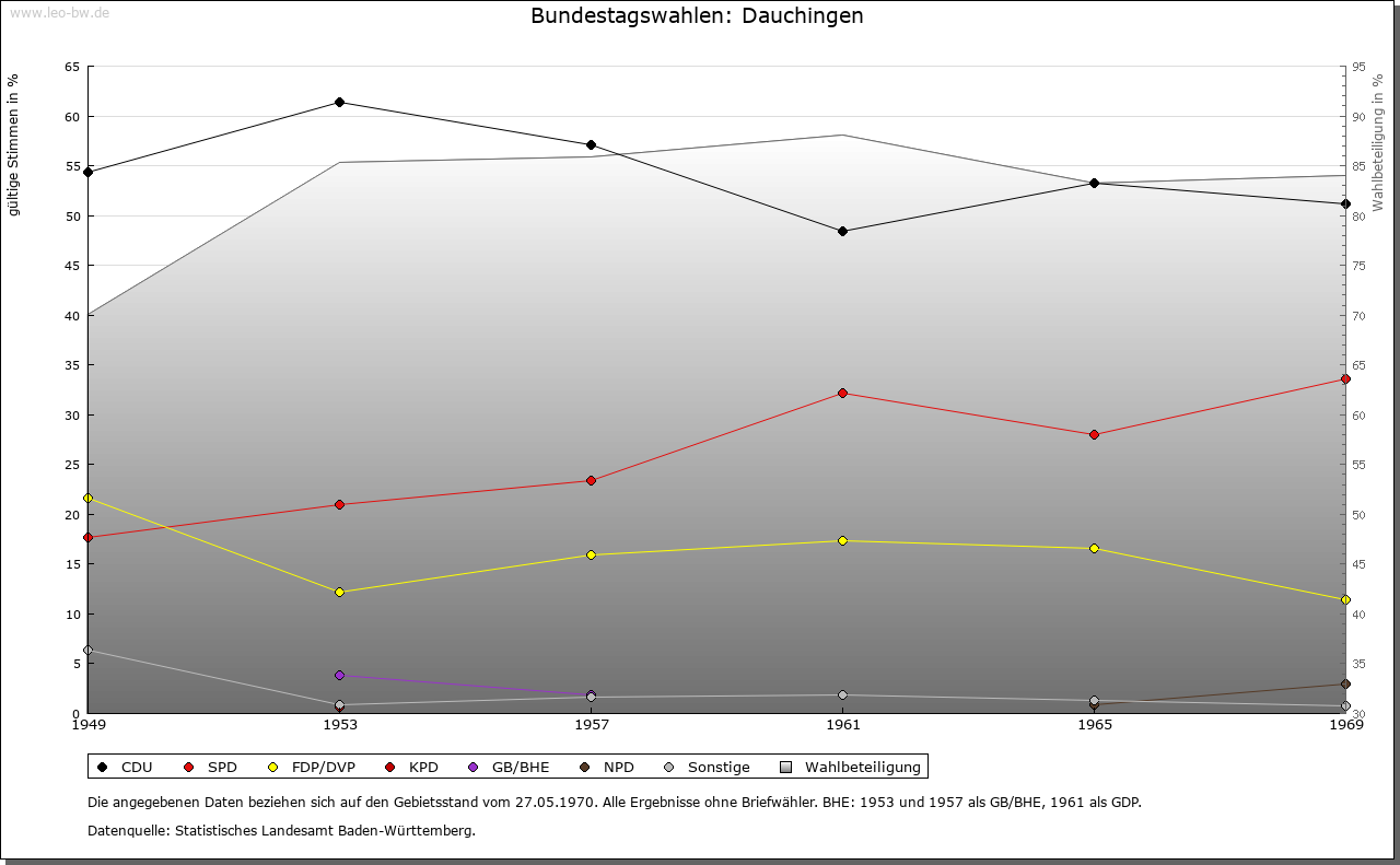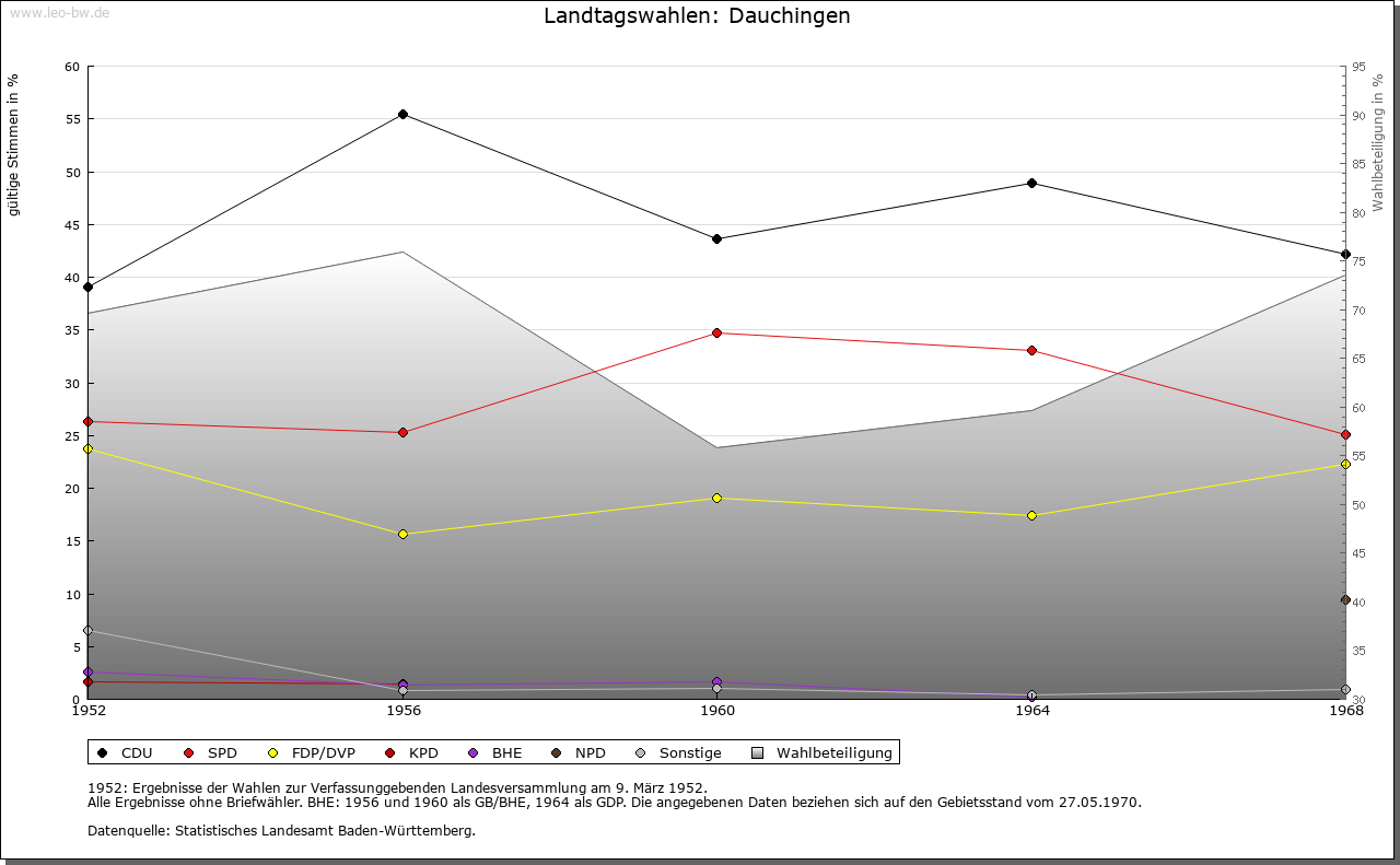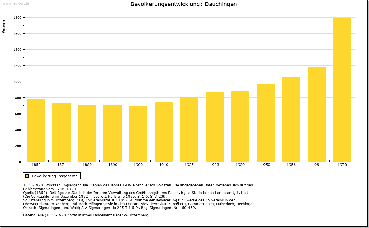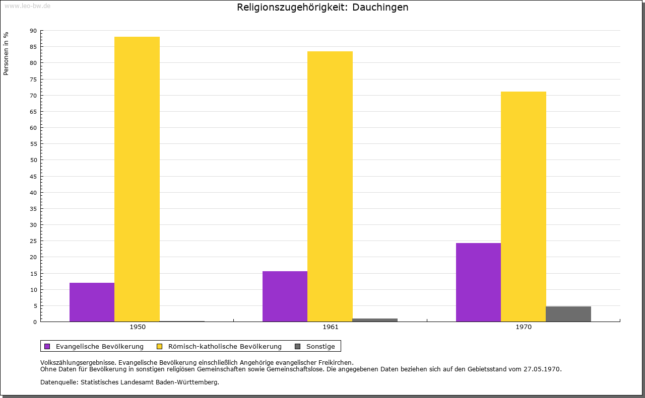 | Geschichte: | 1092 Tuchingen (Корialüberlieferung 16. Jahrhundert), 1281 Tochingen. Siedlung der ältesten Schicht. Das Kloster St. Georgen hatte bereits 1092 Besitz zu Dauchingen, den es in der folgenden Zeit vermehren konnte. Mit Reginhard und dem Ritter Berthold ist für 1094 ein Adelsgeschlecht bezeugt, das sich nach dem Ort nannte und hier auch begütert war. Die Herrschafts- und Eigentumsrechte der Herzöge von Zähringen gingen nach 1218 zunächst auf die Grafen von Urach über und kamen dann an die Grafen von Fürstenberg. Ihnen brachte der Haslacher Erbfolgestreit den Verlust des Dorfes. 1405 verzichteten die Fürstenberger zugunsten der Grafen von Hohenzollern u.a. auf Dauchingen. In der zweiten Hälfte des 15. Jahrhunderts befand sich der Ort im Besitz des in Konstanz ansässigen Gregor von Roggwil, der ihn 1479 an die Bruderschaftspflege in Rottweil verkaufte. 1803 fiel das zum Bruderschaftsoberpflegamt der Stadt Rottweil gehörende Dauchingen an Württemberg und wurde dem Landoberamt Rottweil zugeteilt; 1806/08 zum Oberamt Rottweil. 1810 an Baden vertauscht, Amtssitz stets Villingen. |