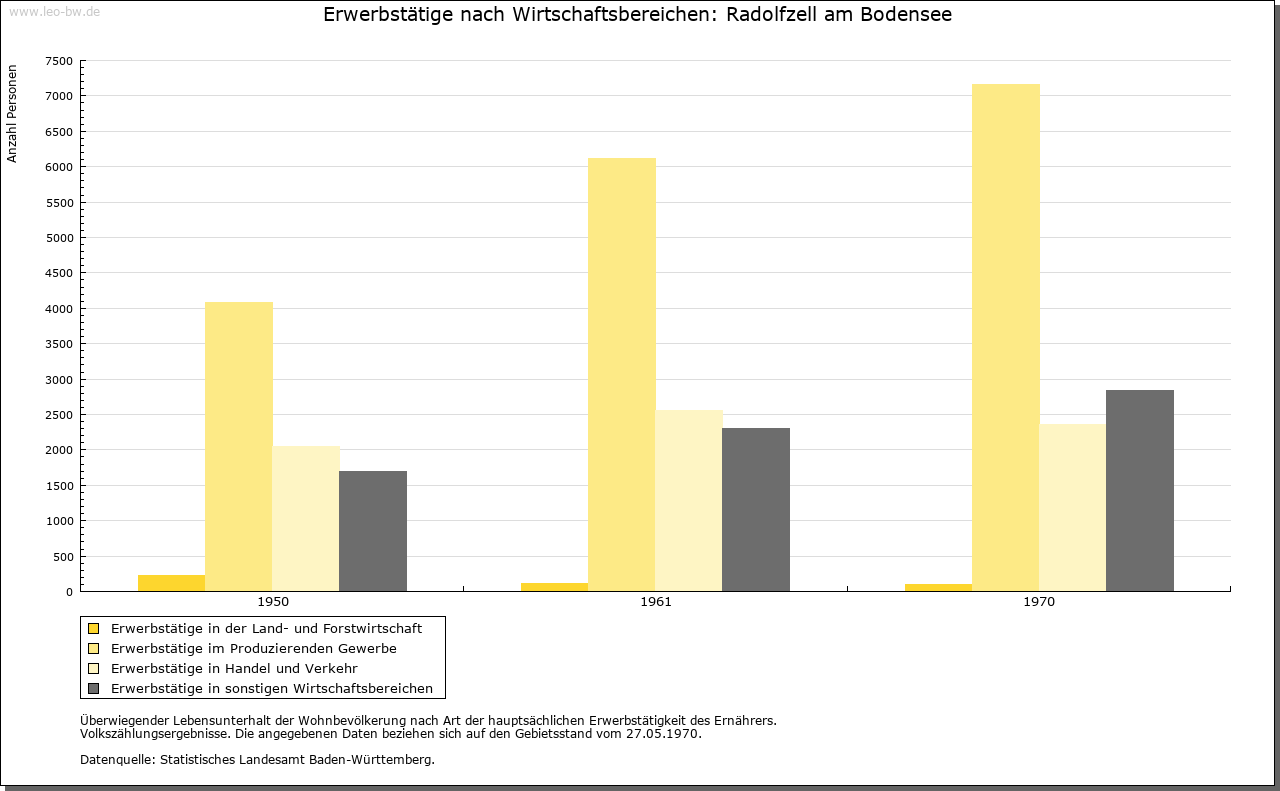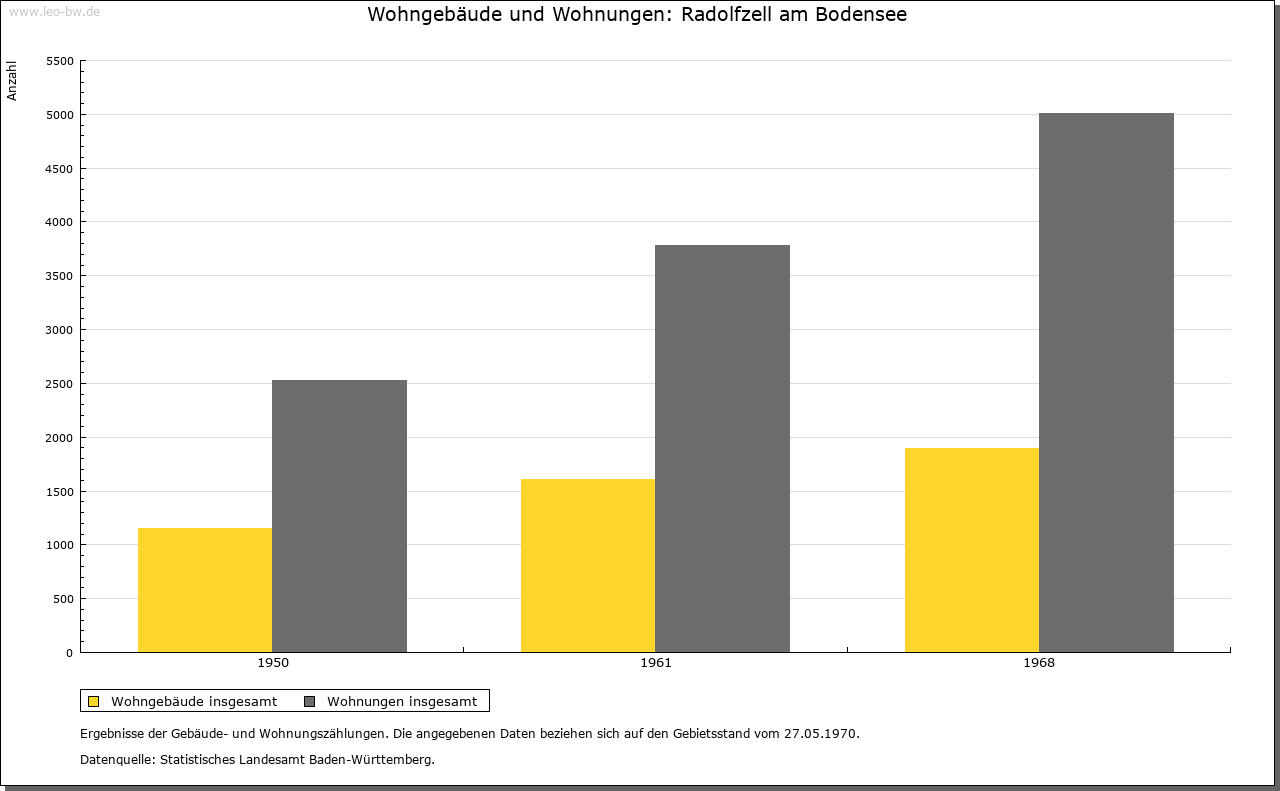 Ortslage und Siedlung (bis 1970): | Kern der Stadtanlage ist die dicht bebaute, im Hochmittelalter mit einem Mauerring umschlossene Altstadt am flachen Hang nordwestlich des Zeller Sees. In der Altstadt mit weitgehend rechtwinkligem Straßennetz am Hang bilden das Münster, das Österreichische Schlößchen, das Ritterschaftshaus und das Rathaus die hervorstechenden, das Stadtbild prägenden historischen Bauten. Dieser historische Stadtkern bildet heute das Verwaltungs- und Geschäftszentrum, um das im Westen, Norden und Nordosten die Neustadt gewachsen ist. Industrie- und Gewerbeflächen dehnen sich darin nördlich des Altstadtkerns westlich der Bahnlinie Radolfzell-Lindau aus. Ausgedehnte Stadterweiterungen der Nachkriegszeit finden sich mit Misch- und Wohnbebauung westlich dieser Industrie- und Gewerbezone. Am westlichen Stadtrand neues Gewerbe-und Industriegebiet. Geschlossene neue Wohngebiete mit teils schematischer und gleichförmiger Wohnblockbebauung sowie Ein- und Zweifamilienhausbebauung erweitern die Stadtfläche nach Norden, Nordosten und Osten. Eine individuelle Bebauung überzieht die östliche Mettnau-Halbinsel. |