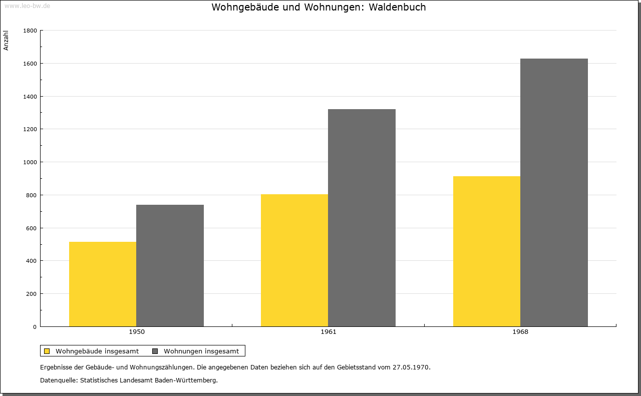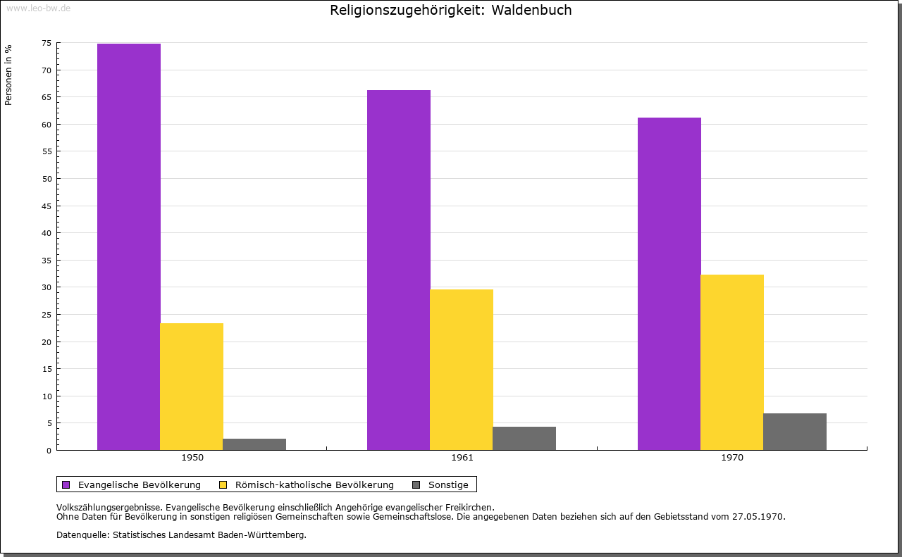 | Kirche und Schule: | Kirchlich war Waldenbuch Filial von Weil im Schönbuch. Um 1360 selbständige Pfarrei, Kirche St. Veit jedoch erst 1455 bezeugt. 1464/65 nochmals als Filialkirche erwähnt, 1468 und 1472 endgültig Pfarrkirche. Der Kirchensatz, wie in Weil dem Kloster Bebenhausen gehörend, kam durch die Reformation an Württemberg. Evangelische Stadtkirche, chorloser Rechteckbau, 1605/07 erbaut; ein Chorturm der alten Kirche des 15. Jahrhunderts übernommen und 1707 im Barockstil umgebaut und erhöht. Katholische Kirche St. Meinrad von 1949/50, Pfarrei seit 1961. |