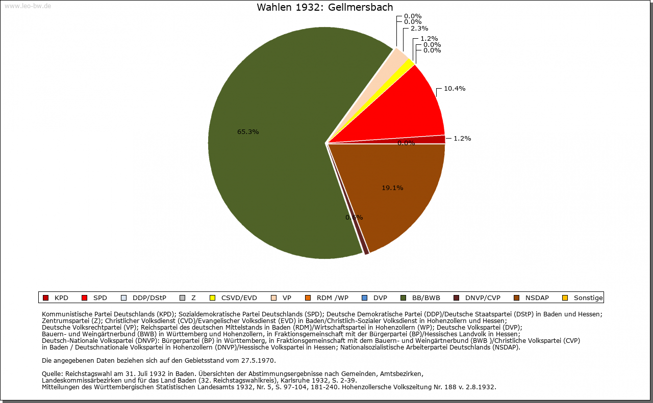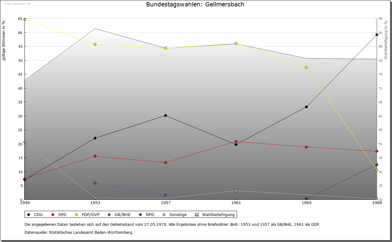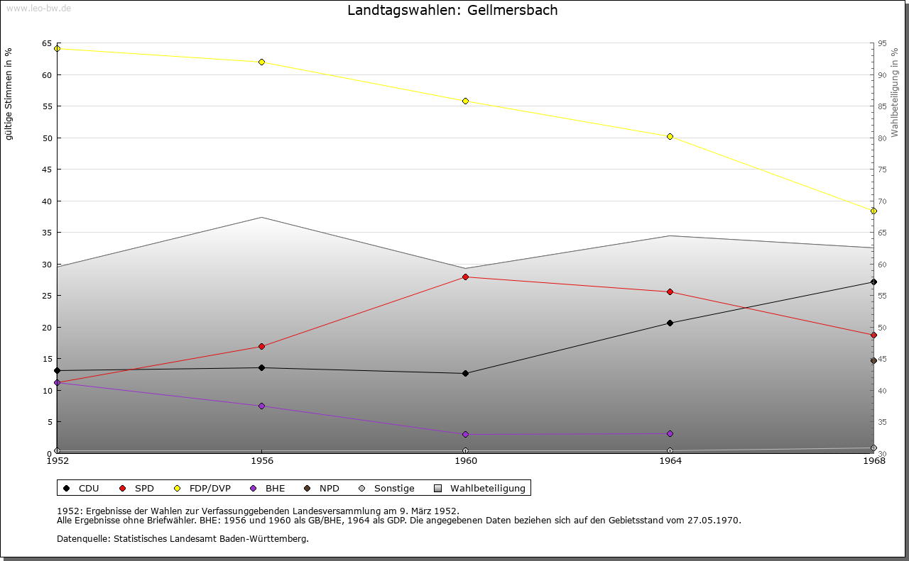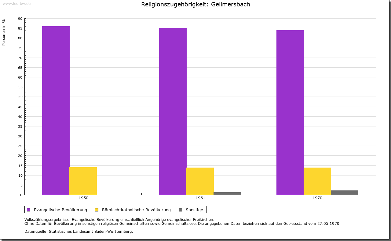 | Geschichte: | Ursprünglich der Herrschaft Weinsberg zugehörig, kam Gellmersbach 1335 durch Kauf zur Hälfte an Kurmainz. Durch Tausch gelangte diese Hälfte 1484 an den Deutschen Orden, dem sie bis 1805 gehörte (Amt Scheuerberg). Die zunächst den Herren von Weinsberg verbliebene Hälfte kam nach mehrfachen Verpfändungen 1412 an Kurpfalz und 1504 zusammen mit dem Amt Weinsberg dauerhaft an Württemberg. Im Dreißigjährigen Krieg war der Ort vorübergehend dem Grafen Maximilian von Trautmansdorff zugewiesen (1635/46). Erst 1805 konnte Württemberg im Zuge der Säkularisation auch die Hälfte des Deutschen Ordens an sich bringen. Bedeutende Grundbesitzer waren die Klöster Schöntal, Lauffen und St. Klara in Heilbronn sowie die beiden Ortsherren. Der Zehnt stand ursprünglich dem Hochstift Würzburg zu. 1730 teilten sich darein das Stift Oberstenfeld (3/4) sowie die von Berlichingen (4/15 eines Viertels), das Kloster Lichtenstern (8/15 eines Viertels) und die Geistliche Verwaltung Weinsberg (3/15 eines Viertels). 1303 ist erstmals ein Schultheiß bezeugt. Seit der Teilung im 14. Jahrhundert hatte jede Herrschaft einen eigenen Schultheißen. Das Gericht, das in der frühen Neuzeit auch als Rat fungierte, war von beiden Seiten mit je fünf Schöffen besetzt. 1791 wurde ein Rathaus errichtet; davor diente vielleicht das »gemein Herren Haus« (1525) als Versammlungsort. Ab 18.3.1806 Oberamt Weinsberg, ab 1.4.1926 Oberamt Heilbronn (30.1.1934 Kreis), ab 1.10.1938 Landkreis Heilbronn. Wurde 1525 wegen Teilnahme an der Weinsberger Bluttat niedergebrannt. |