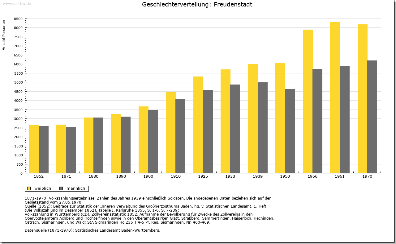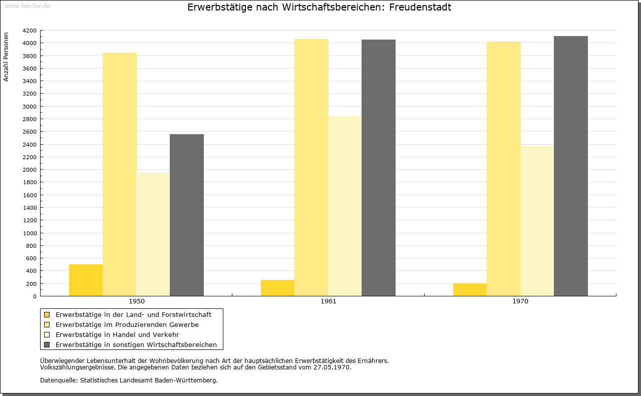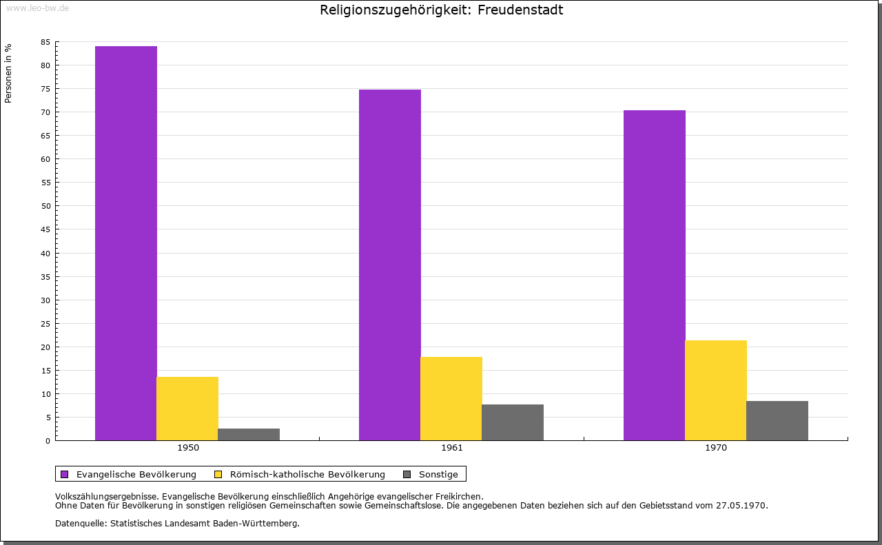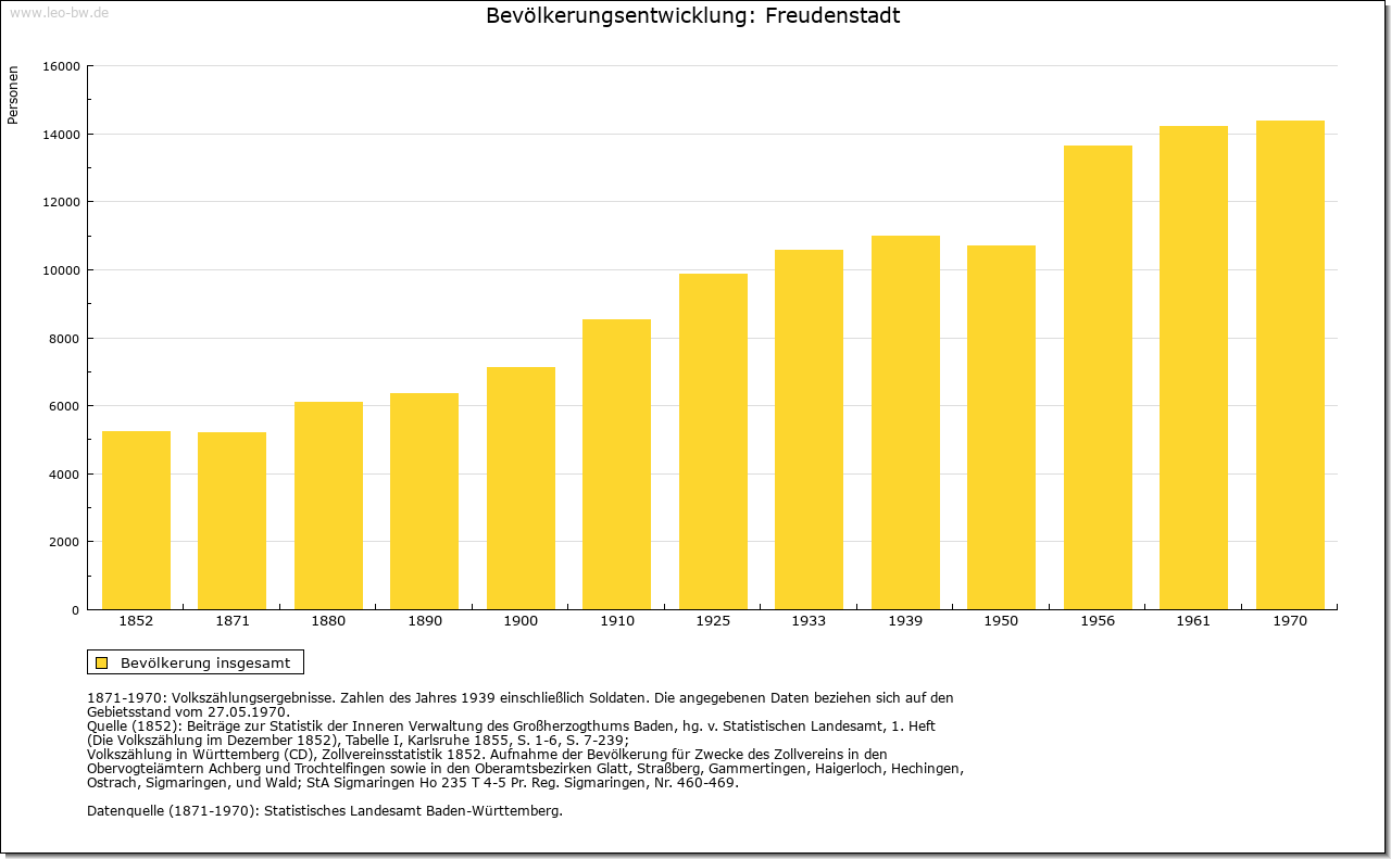| Wirtschaft und Bevölkerung: | Nach dem Niedergang des Bergbaus in Christophstal konnte sich in Freudenstadt nur ein geringes Wirtschaftsleben entfalten; einzig der Handel mit Wein, Getreide und Salz hatte, besonders in der Zeit der Pfandschaft Oberkirchs, einige Bedeutung. Seit 1737 kleine Garnison als Etappenort für Kehl. Erst das 19. Jahrhundert brachte Freudenstadt mit neuen Straßen, dem Eisenbahnanschluß 1879 und dem Beginn der Kureinrichtungen um 1890 die Grundlagen seiner Entwicklung zur Kur- und Fremdenverkehrsstadt. |