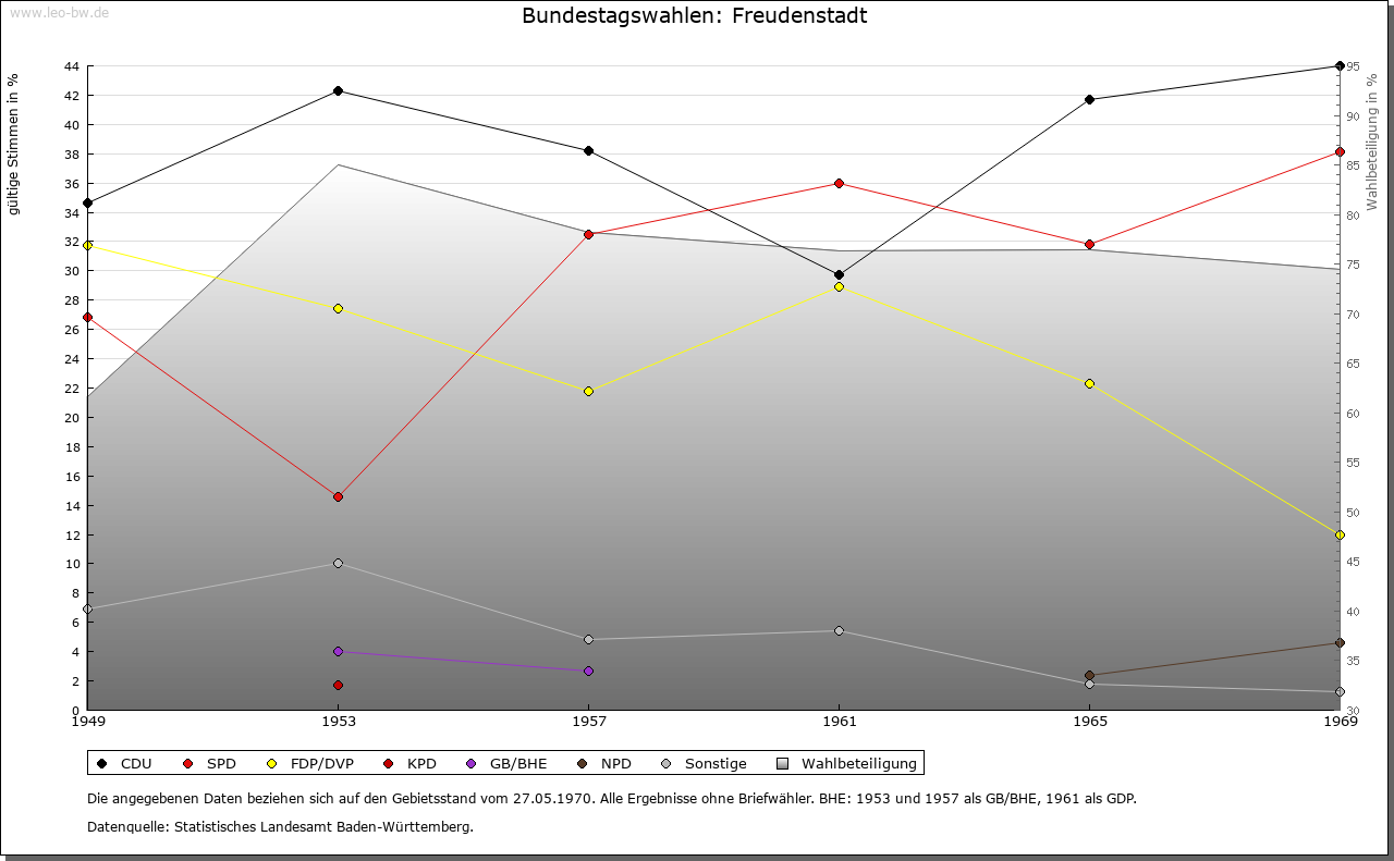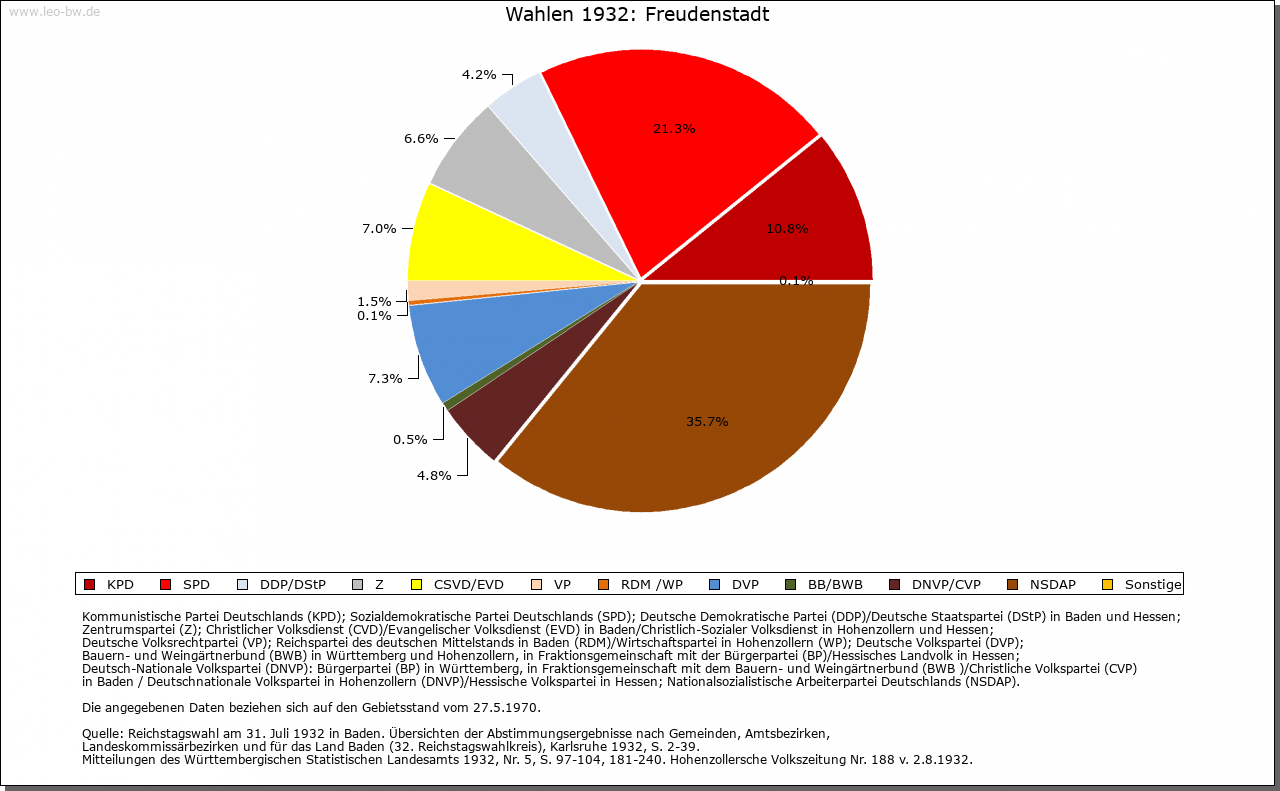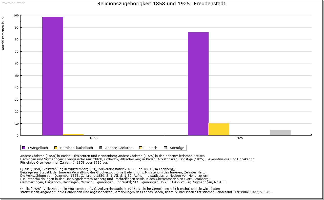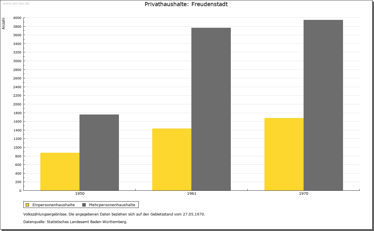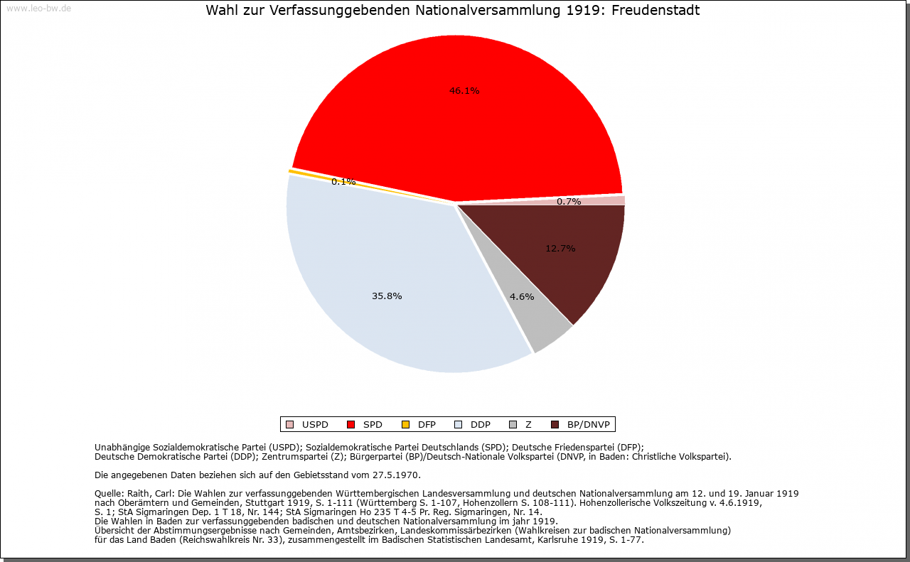 | Wirtschaft und Bevölkerung: | Nach dem Niedergang des Bergbaus in Christophstal konnte sich in Freudenstadt nur ein geringes Wirtschaftsleben entfalten; einzig der Handel mit Wein, Getreide und Salz hatte, besonders in der Zeit der Pfandschaft Oberkirchs, einige Bedeutung. Seit 1737 kleine Garnison als Etappenort für Kehl. Erst das 19. Jahrhundert brachte Freudenstadt mit neuen Straßen, dem Eisenbahnanschluß 1879 und dem Beginn der Kureinrichtungen um 1890 die Grundlagen seiner Entwicklung zur Kur- und Fremdenverkehrsstadt. |