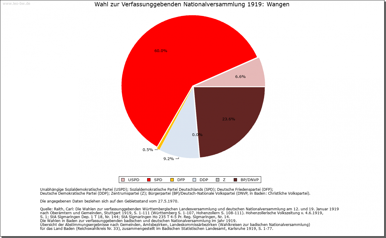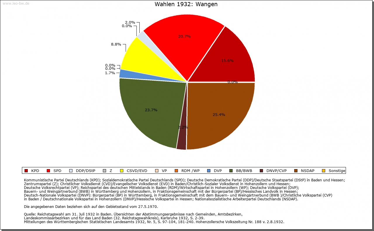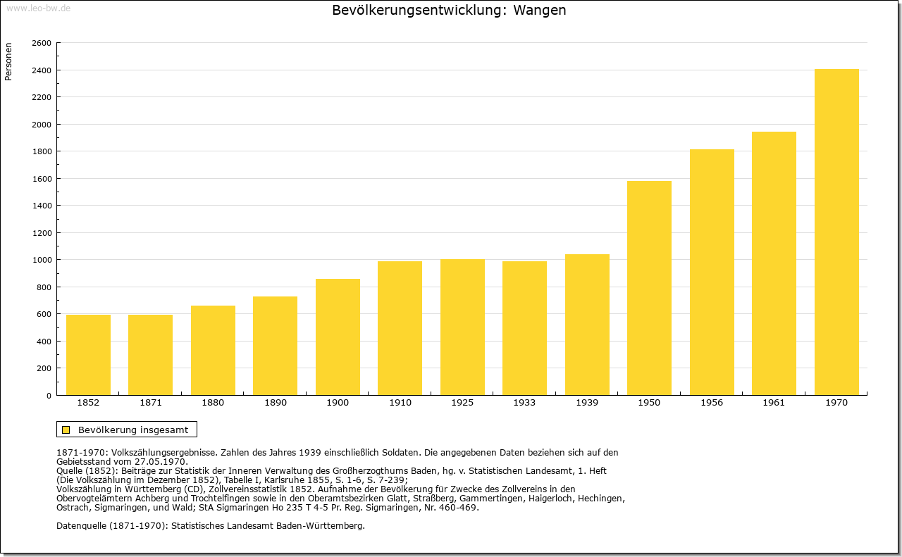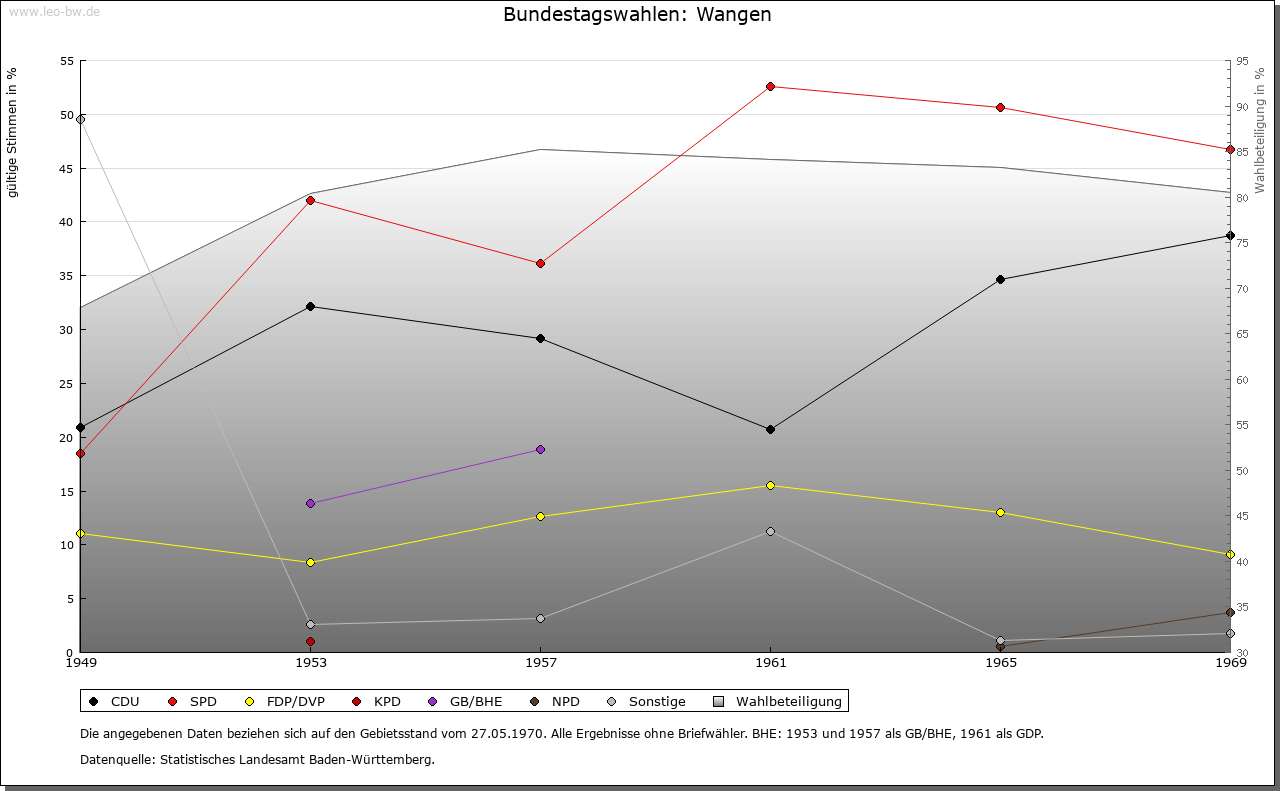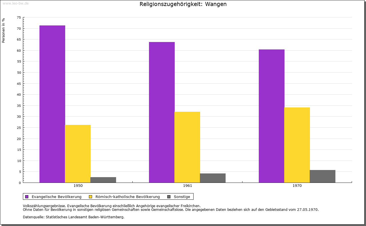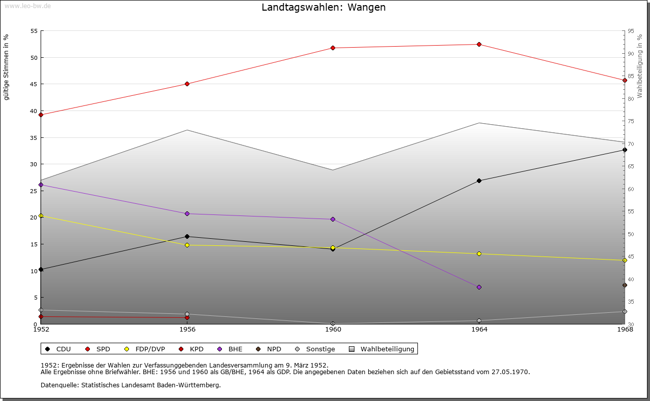 | Geschichte: | 1274 Wangen (wang = Feldstück), wohl in der jüngeren Ausbauzeit des 9.-12. Jahrhunderts entstanden. Schon 1327 hatte Württemberg Rechte, die es wohl mit Göppingen erworben hatte. Ein größerer Teil an Vogtei und des Grundbesitzes kam früh an das Kloster Adelberg, so 1274 von den von Staufeneck; ein anderer stand den Herren von Rechberg zu Rechberghausen zu. Württemberg hatte 1530 die hohe Obrigkeit allein, während am Niedergericht Württemberg mit dem Stift Faurndau die Hälfte, Kloster Adelberg und Herrschaft Rechberghausen je ein Viertel zustand. Wangen gehörte seit dem Spätmittelalter zum Amt bzw. Oberamt, seit 1938 Landkreis Göppingen. |