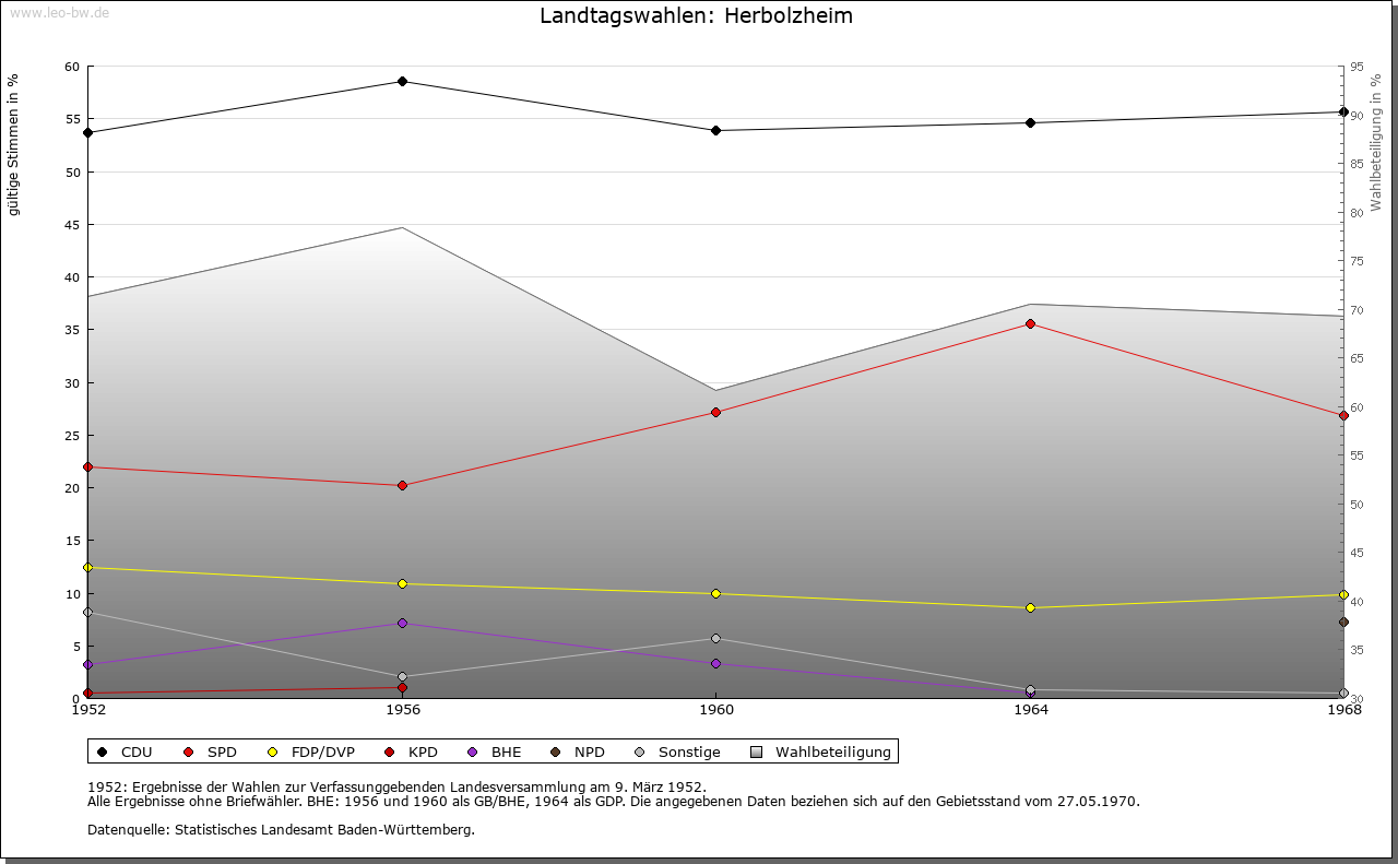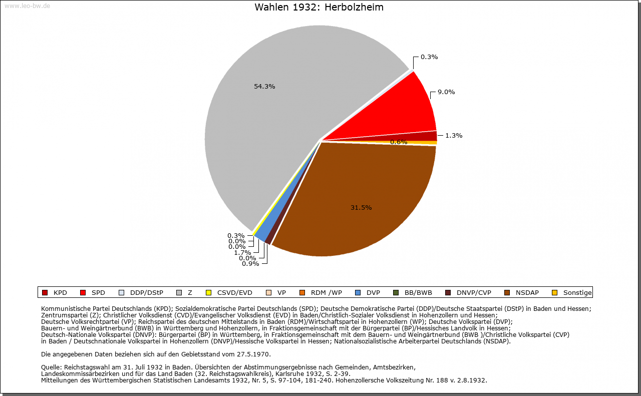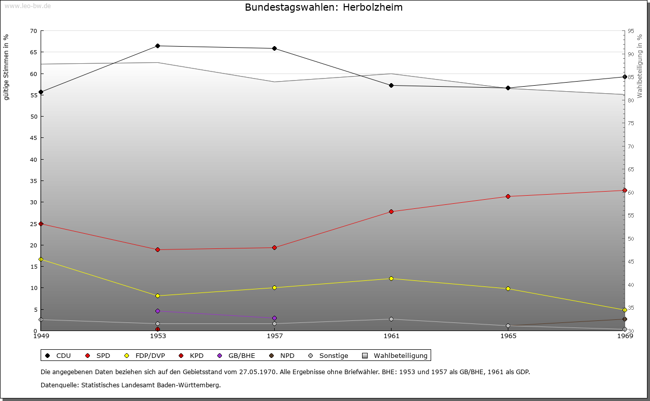 | Geschichte: | 1184 (Корialüberlieferung Ende des 13. Jahrhunderts) Herbotsheim, 1244 Herboltshein. Von Personenname Heribot. Siedlung der ältesten Schicht mit Reihengräberfriedhof im Ortsbereich. Die Grafen von Nimburg verkauften 1200 zusammen mit anderen Besitzungen einen Hof zu Herbolzheim an den Bischof von Straßburg. Herren von Herbolzheim sind zwischen 1108/22 und 1179 bezeugt. Der zwischen 1256 und 1284 auftretende Friedrich von Herbolzheim war üsenbergischer Ministeriale. Osenberg besaß den Ort als Lehen vom Bistum Straßburg seit der Mitte des 13. Jahrhundert. Über Seitenlinien der Üsenberger gelangte er 1357 im Tausch an Graf Hugo von Fürstenberg. Bis 1386 blieb Herbolzheim bei Fürstenberg. Nachdem Johann von Fürstenberg bei Sempach gefallen war, zog der Bischof das Dorf als erledigtes Lehen ein. Die Markgrafen von Hachberg konnten ihre Ansprüche, die sie seit der Belehnung 1352 durch Osenberg hatten, ebenfalls nicht durchsetzen. Herbolzheim kam schließlich an Österreich, das 1586 Marktrecht gewährte. Der Ort gehörte zur Landgrafschaft Breisgau und kam 1805 an Baden und wurde 1810 Stadt. 1807 Oberamt Kenzingen, 1872 Вezirksamt Ettenheim, 1879 Bezirksamt Emmendingen. Aus Herbolzheim stammte Bernhart Galura, Fürstbischof von Brixen (* 1764, † 1856). |
