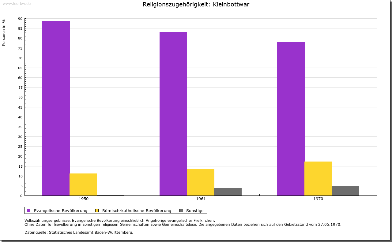 | Kirche und Schule: | Kirchlich war Kleinbottwar bis Ende des 15. Jahrhunderts in einen zur Pfarrei Großbottwar und einen zur Pfarrei Steinheim gehörenden Ortsteil aufgespalten. Die Plieningen erreichten 1499 die kirchliche Verselbständigung des Dorfes. An der Stelle der 1443 genannten Kapelle erbauten sie als Chorseitenturmanlage die dem Hl. Georg geweihte Pfarrkirche, die heutige evangelische Kirche. In der Kirche Schnitz- und Flügelaltar um 1520, Grabmäler von Angehörigen der Familien von Plieningen und von Gaisberg (15.-18. Jahrhundert). Katholiken nach Steinheim an der Murr eingepfarrt. |