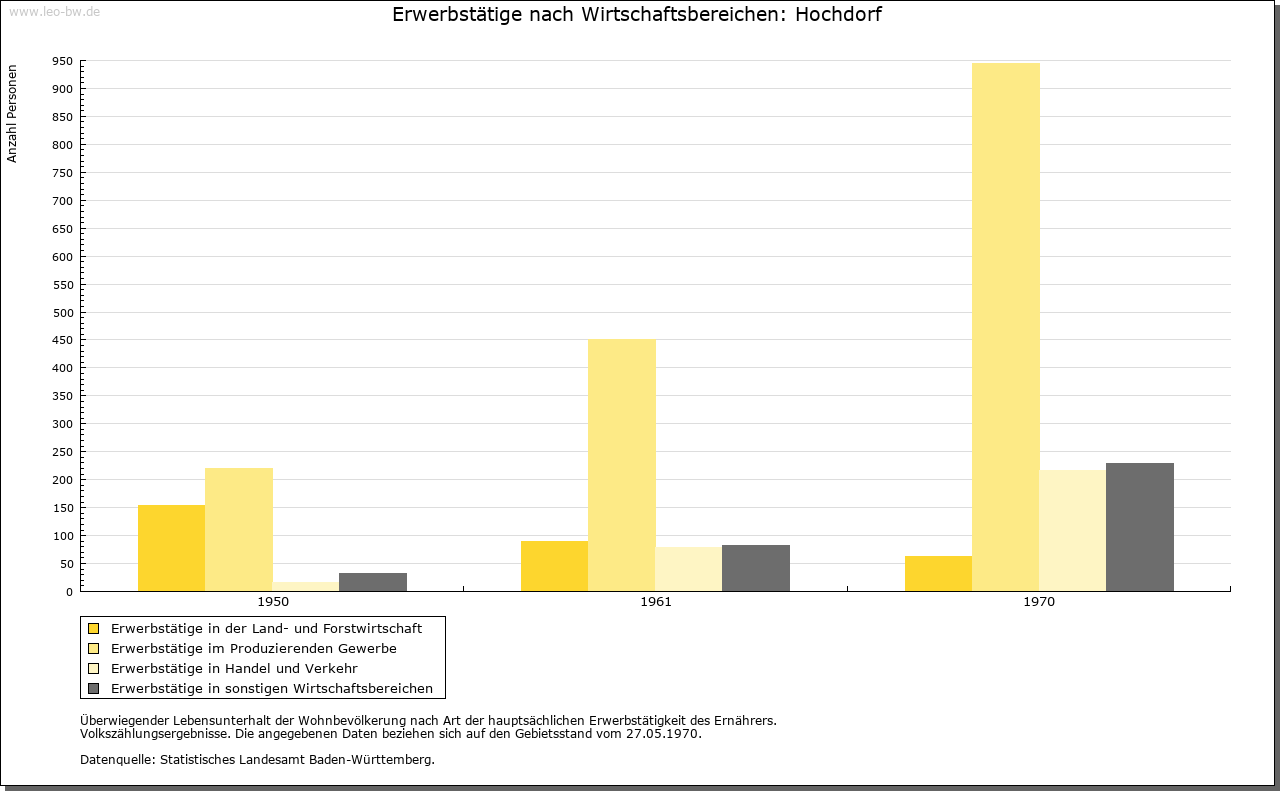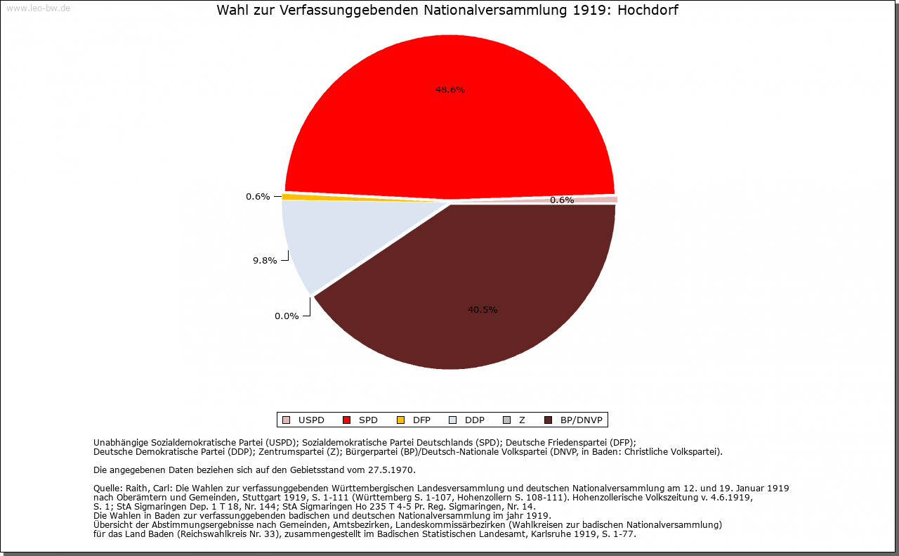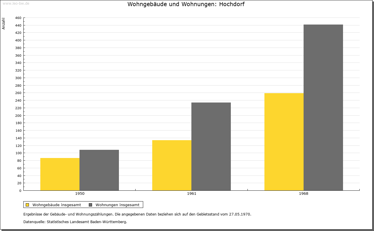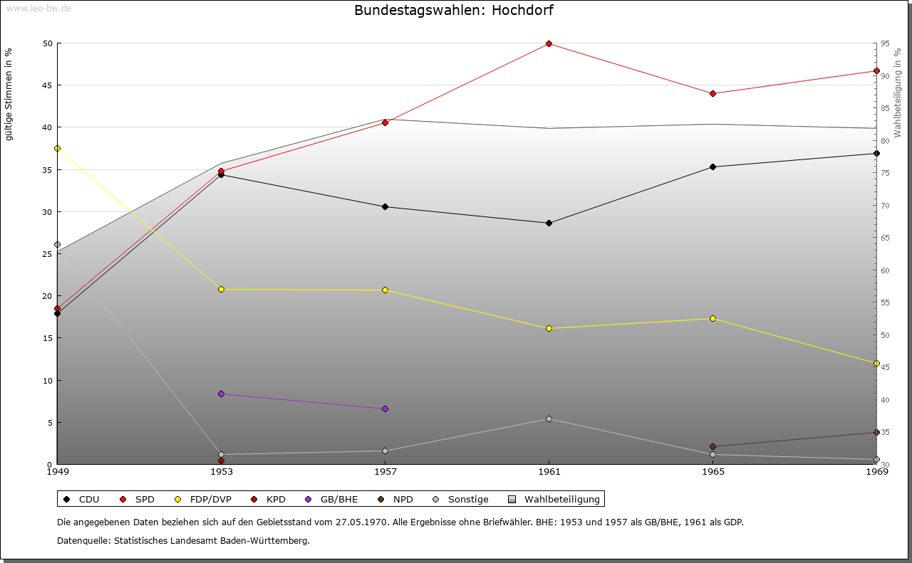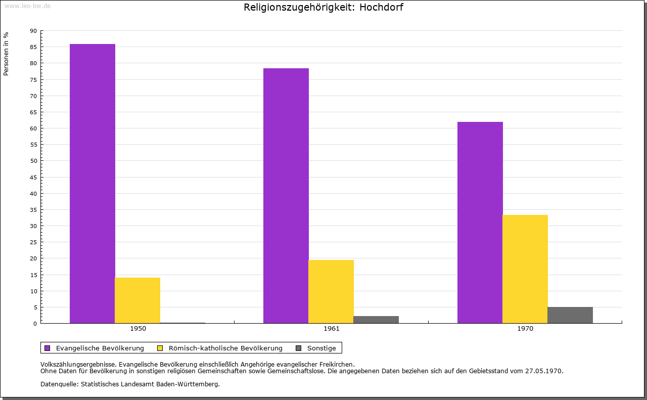 | Kirche und Schule: | Das Patronat an der 1275 erstmals genannten, dem Hl. Wendelin geweihten Pfarrkirche besaß Kloster Lorch. Im 17. Jahrhundert war Hochdorf zeitweise kirchliches Filial von Hochberg (1637-1661 und 1666-1668) und von Bittenfeld (1662-1666). Die gotische evangelische Pfarrkirche, zumindest aber ihr am Ostende des Schiffs über Eck gestellter Chorturm, war in die Burgbefestigungsanlage einbezogen. Katholische St.-Franziskus-Kirche von 1976, zur Pfarrei Hochberg gehörig. |