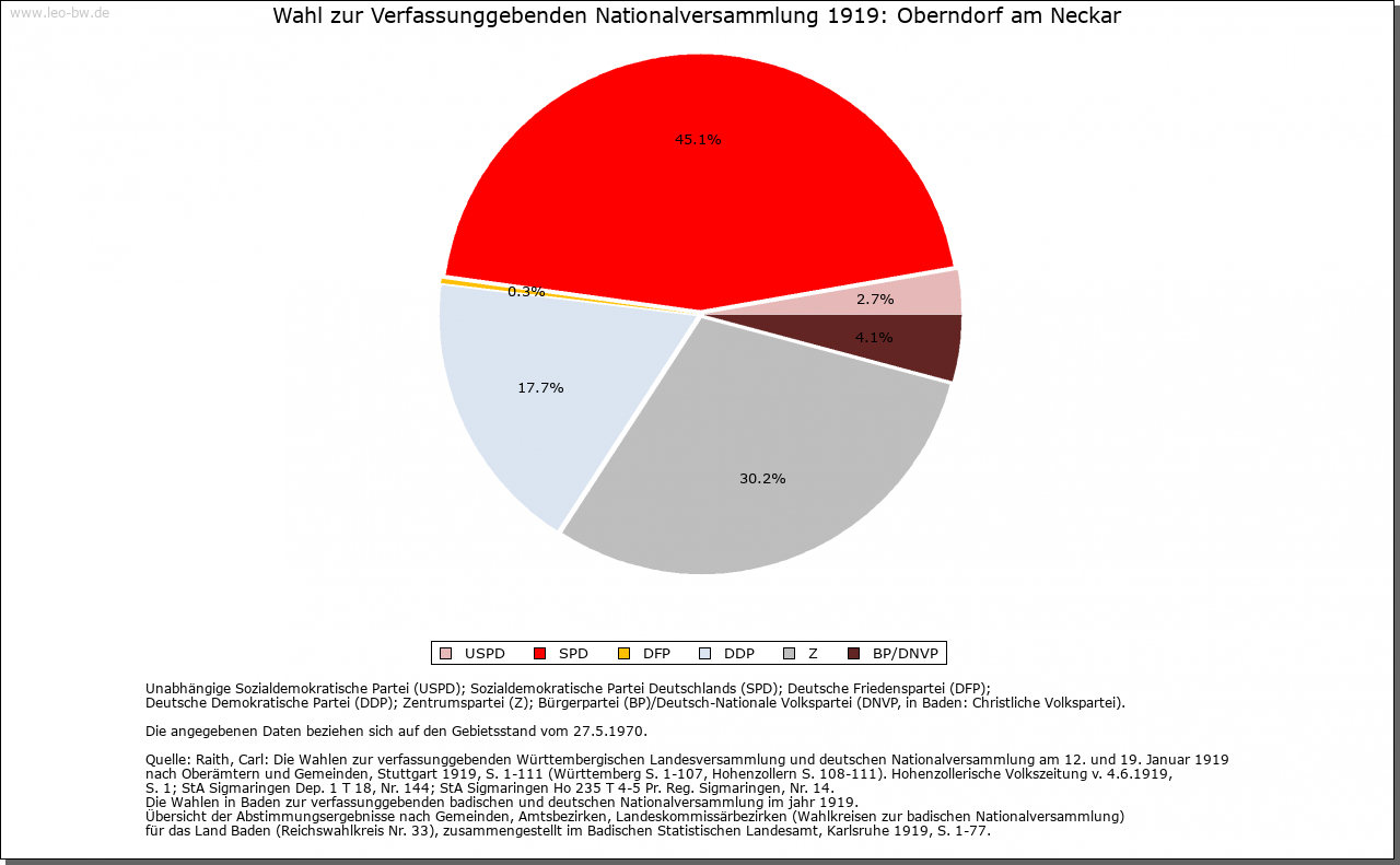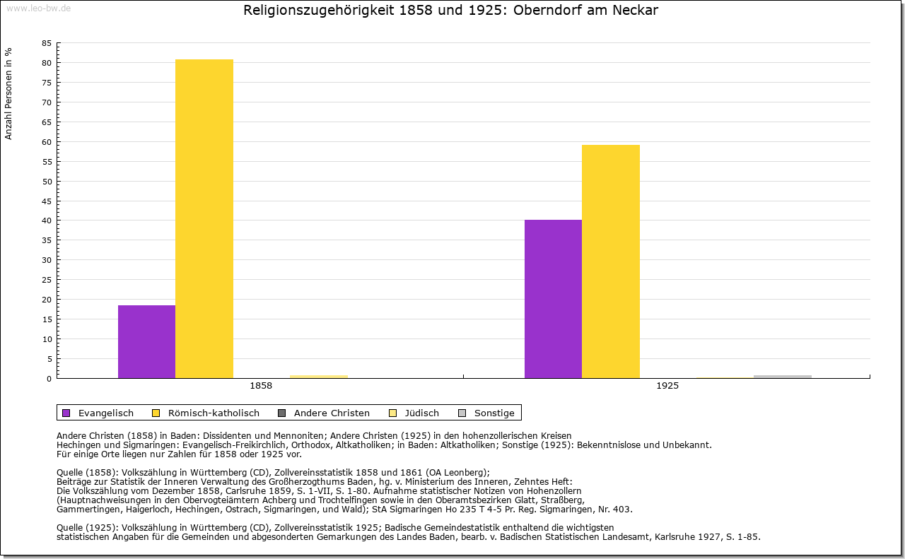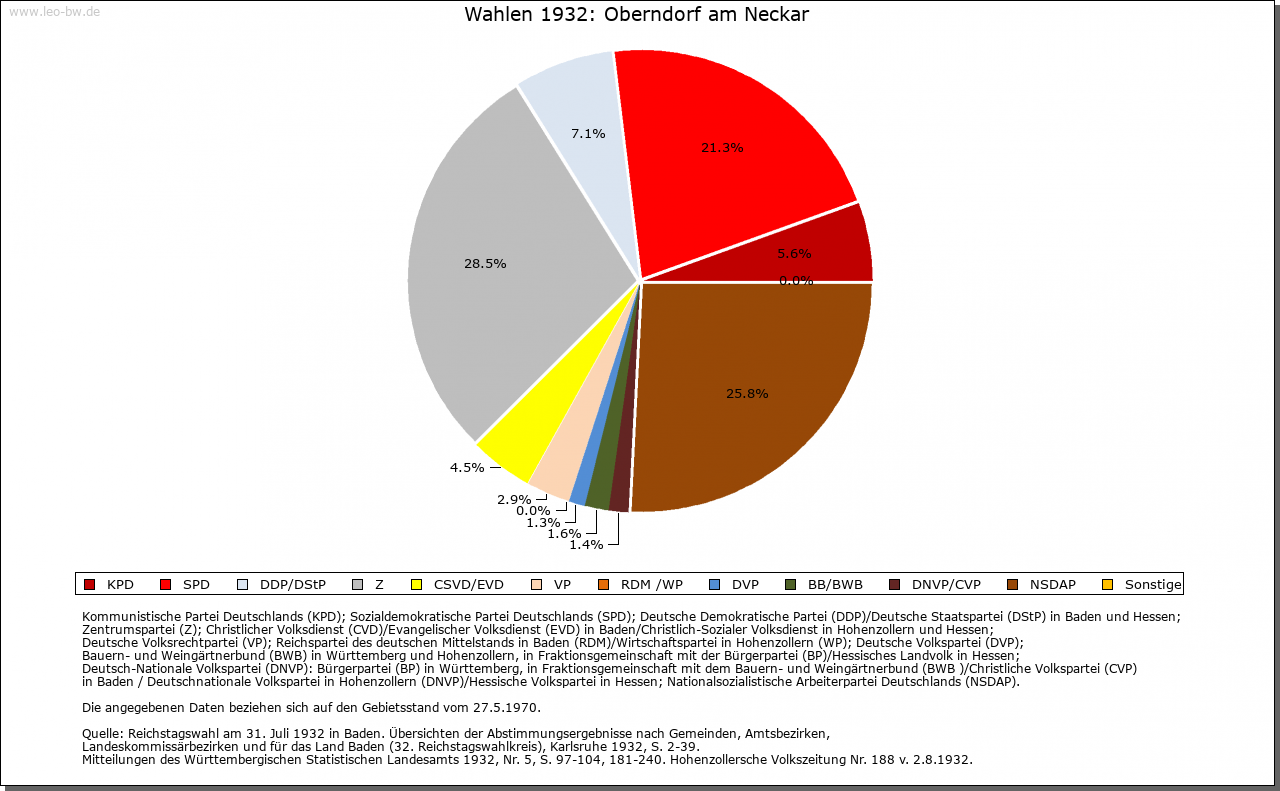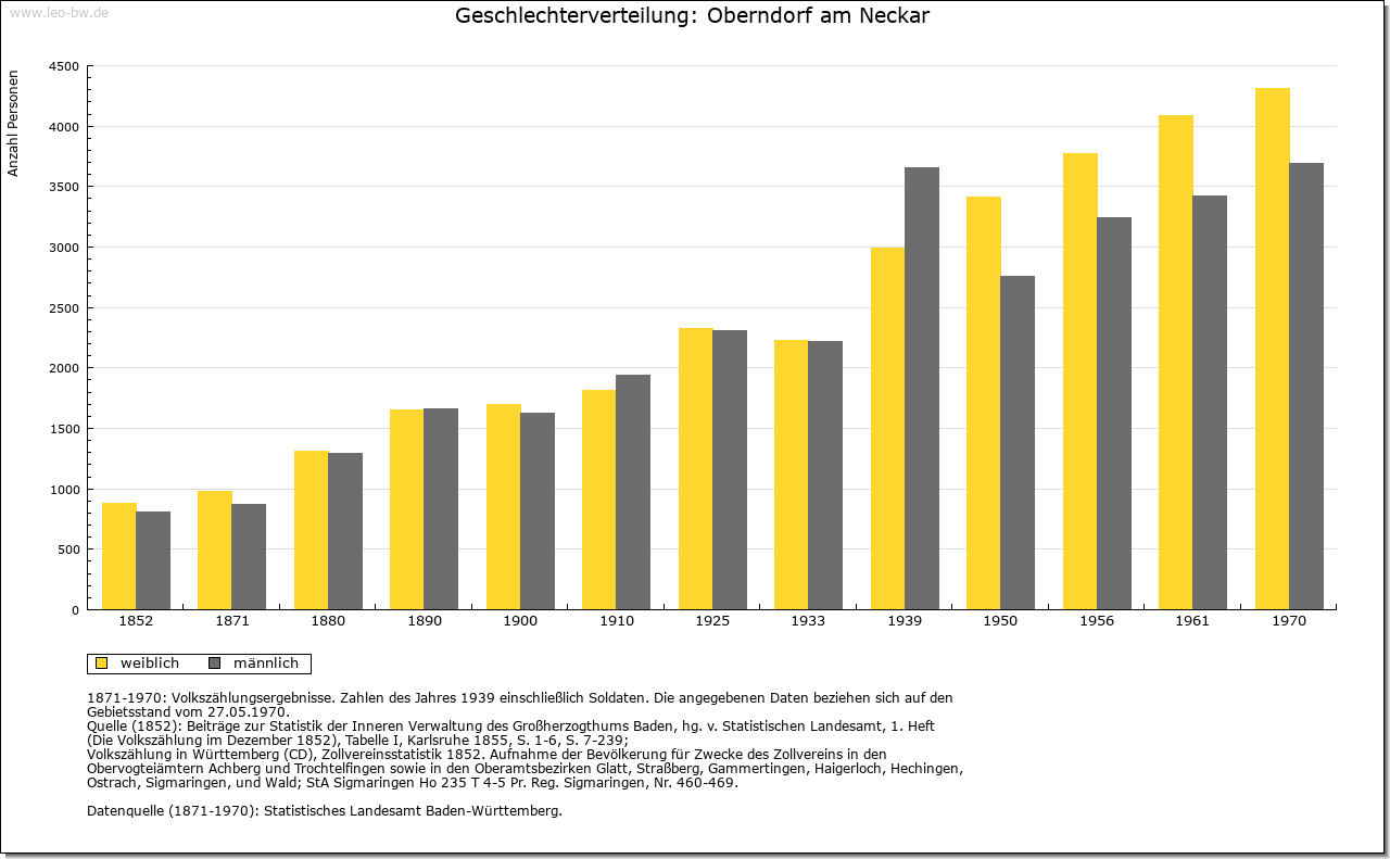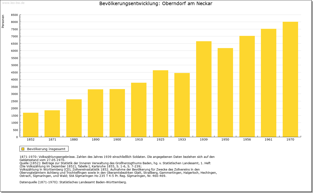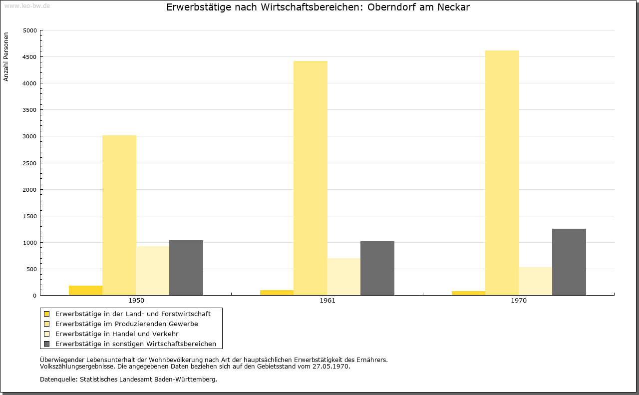 | Wirtschaft und Bevölkerung: | Erst in der Neuzeit lassen die Quellen vereinzelt Rückschlüsse auf die Einwohnerzahl zu, für das Mittelalter liegen nur Schätzungen für benachbarte Städte vor. Wagt man einen Vergleich, so könnten im 15. Jahrhundert in der Stadt 500 bis 600 Menschen gelebt haben. Um 1630 hatte die Stadt rund 600 Einwohner (136 Steuerpflichtige). Die folgenden Kriegsereignisse dürften die Bevölkerung um rund ein Viertel reduziert haben, bevor sie bereits im letzten Viertel des 17. Jahrhunderts den Vorkriegsstand wieder erreicht hatte. Ein deutliches Wachstum ist dann erst Ende des 18. Jahrhunderts zu verzeichnen, als rund 1000 Einwohner gezählt wurden. Im Mittelalter bestand die Oberschicht aus rund zehn Familien, von denen größtenteils die städtischen Gremien besetzt wurden und die häufig mit dem niederen Adel versippt und auch Amtsträger der Herrschaft waren. Neben der Familie Hack sind hier beispielsweise die Bernhart, Hutneck und Winmann zu nennen, die auch in umliegenden Orten zum Teil bedeutende Besitzungen an sich brachten. Enge Verbindungen dieser Oberschicht bestanden zu führenden Rottweiler Familien. Daneben gab es eine große Zahl von Bürgern, die einer Tätigkeit als Handwerker oder Bauer nachgingen, aber durchaus auch über eigenen Besitz verfügen konnten; einige Berufe sind bereits im 13. Jahrhundert genannt. Über die Handwerker und die unterbürgerlichen Schichten geben erst Quellen der Neuzeit besseren Aufschluss. 1626 galten nur sieben von 136 Bürgern als vermögend. Mehrere Faktoren hatten diese schlechte wirtschaftliche Situation, die bis ins 18. Jahrhundert anhielt, verursacht. Durch die Lage der Stadt zwischen den Territorien Rottweils und Württembergs und hohe Zollschranken hatte sich ihr Hinterland und damit die Arbeits- und Erwerbsmöglichkeiten der Handwerker und Händler mehr und mehr verkleinert. Die meisten der zahlreichen Gewerbetreibenden übten daher mehrere Berufe aus. Zudem floss der Verkehr inzwischen an der Stadt vorbei, der seit dem Mittelalter vor allem in West-Ost-Richtung den Neckarübergang passiert hatte, wodurch auch der Marktort an Bedeutung verlor. Im Mittelalter reichte sein Einzugsgebiet rund 10 Kilometer im Umkreis, wie die Verbreitung des Oberndorfer Getreidemaßes nahelegt. Erst seit dem 17. Jahrhundert sind die einzelnen Märkte nachweisbar. Neben dem Wochenmarkt fanden 1605 zwei Jahrmärkte an St. Margarethen und an Michaeli statt. Seit 1657 traten daneben weitere Jahrmärkte an Bartholomäi, Heilig Kreuz (1658) und an Martini (1704). Aus der schmalen, vermögenden Oberschicht, teilweise von außerhalb, wurde auch in der Neuzeit das Amt des Bürgermeisters besetzt. Vor allem die Wirte und einige Händler zählten im 18. Jahrhundert zu den wenigen Reichen am Ort. Erst gegen Ende des 18. Jahrhunderts etablierte sich mit dem Wachstum der Stadt und ihren strengen Bürgeraufnahmekriterien eine relativ breite bürgerliche Mittelschicht, während noch bis zur Mitte des 18. Jahrhunderts die größte Zahl der Bürger zu den Armen gerechnet werden musste. Handwerksordnungen sind erstmals von 1625 für Bäcker, Färber, Fischer, Kürschner, Metzger und Müller überliefert; das städtische Schlachthaus ist bereits 1577 belegt. Einige der Zunftordnungen orientierten sich an Vorbildern aus Rottenburg, viele wurden im 18. Jahrhundert neu erarbeitet. 1730 gab es in der Stadt 137 Meister, die elf verschiedenen Zünften angehörten. Der Bereich dieser Zünfte erstreckte sich nicht nur auf die Stadt, sondern auf die gesamte Herrschaft mit den zugehörigen vier Dörfern. Bedeutendste Gewerbezweige waren neben den Wirten seit dem 17. Jahrhundert die Gerber (vor allem Rotgerber) und die Tuchmacher. 1681 zählte man 17 Wirte, davon acht Schildwirte. Ihre Zahl nahm im Lauf des 18. Jahrhunderts weiter zu. Als Mühlenstandort hatte die Stadt bereits im Mittelalter Bedeutung. Innerhalb der Stadt bestanden Ende des 14. Jahrhunderts drei Mühlen, einige weitere in unmittelbarer Nähe. Neben dem Kloster Alpirsbach, dessen Mühle bereits 1277 belegt ist, verfügte auch das Augustinerkloster über eine eigene Mühle. 1577 gab es acht Mühlen, darunter auch eine Säge und eine Walke. Im 17. Jahrhundert wurde zudem eine Papiermühle eingerichtet, die bis ins 18. Jahrhundert arbeitete. Um 1800 zählte man sechs Mahlmühlen, drei Säge-, zwei Öl-, drei Loh- und zwei Walkmühlen. Eine Ziegelhütte in der oberen Vorstadt ist seit 1577 nachweisbar, dürfte aber bereits im Mittelalter bestanden haben. Die Wirtschaft der Stadt erfuhr ihren Aufschwung durch die Errichtung der staatlichen Gewehrfabrik im Jahr 1812. 1872 Gründung einer Waffenfabrik durch die Gebrüder Mauser. |