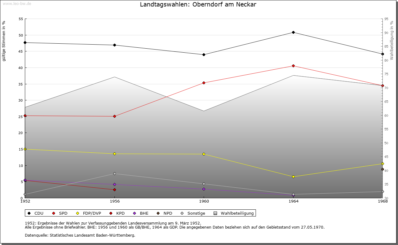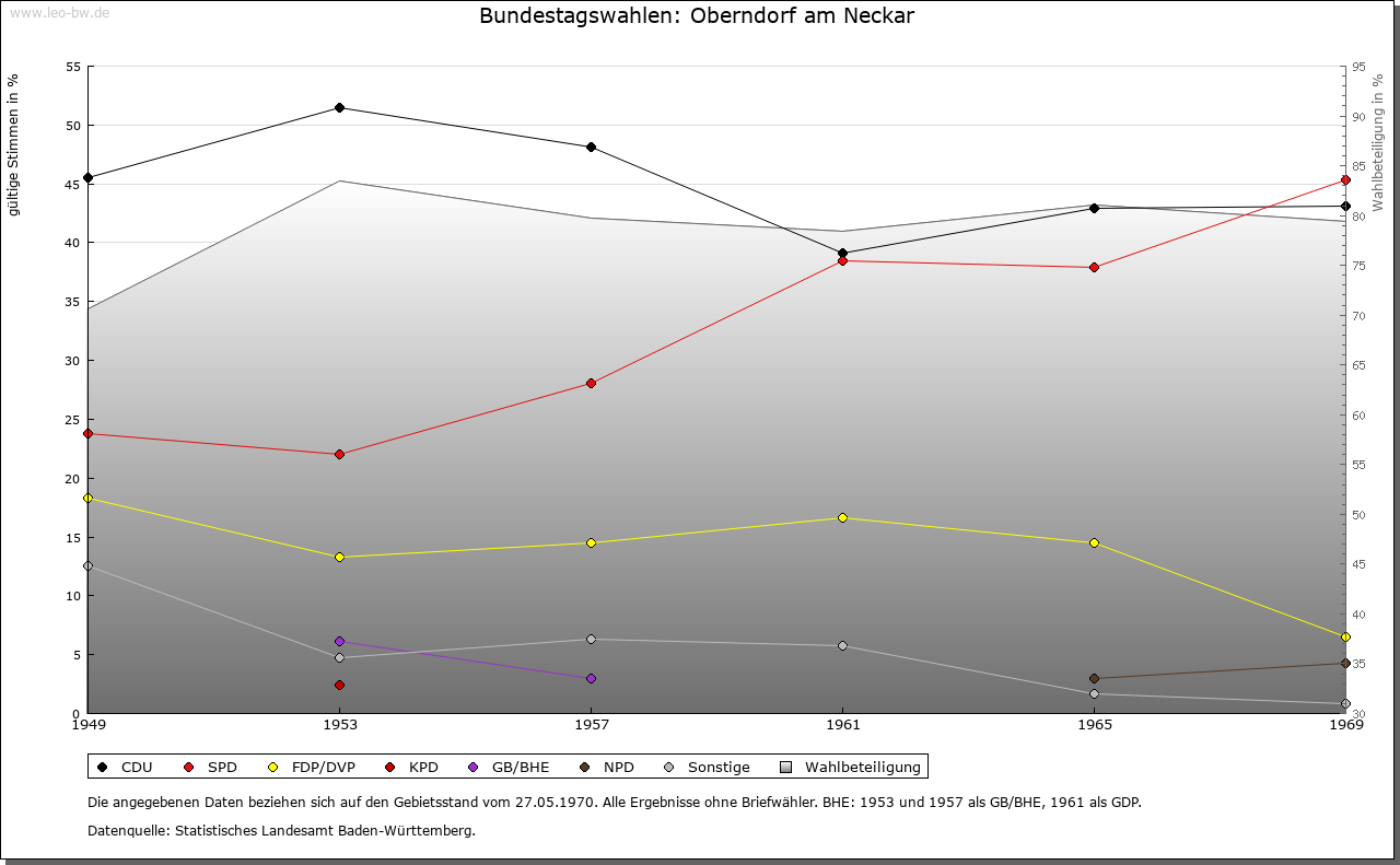 Ortslage und Siedlung (bis 1970): | Bereits in der La-Tène-Zeit besiedelt war der Bergsporn über dem Neckartal, auf dem im Mittelalter die Stadt gegründet wurde. Eine vermutlich zur Siedlung im Stadtbereich gehörende keltische Viereckschanze von 79 x 77 Meter Fläche befindet sich im Aichwald westlich des Unteraichhofes. Eine Siedlungskontinuität von keltischer über römische bis in alemannische Zeit ließ sich an dieser Stelle jedoch bislang nicht nachweisen, obwohl die Gegend durch umliegende Kastelle und Gutshöfe sowie vorbeiführende Straßen eng in das römische Herrschaftssystem eingebunden war. Der älteste Kern der mittelalterlichen Siedlung lag vielmehr jenseits des Neckars im Bereich des Friedhofs, wo südlich des Platzes der abgetragenen Pfarrkirche Spuren frühmittelalterlicher Grubenhäuser entdeckt wurden. Etwas weiter nördlich bei der Boller Steige, wo ein Grab der Merowingerzeit bekannt wurde, ist der Friedhof dieser Siedlung zu vermuten. Um die Pfarrkirche St. Remigius und einen nahebei gelegenen Herrenhof, der zumindest zeitweise in königlichem Besitz war, hat sich im Frühmittelalter eine Siedlung entwickelt. Der Ortsname ist aus dem Grundwort -dorf und dem Bestimmungswort Ober-, Obern- (althochdeutsch »obaro«) gebildet, das wohl als Ortsangabe zur Unterscheidung von anderen nahegelegenen -dorf-Orten diente; ein Personenname als Bestimmungswort scheidet aus. Bei der frühesten Nennung als Ausstellungsort von Urkunden 782 (»Obarindorf«) kann allerdings nicht zwischen der erwähnten Siedlung beim Herrenhof und dem gleichnamigen, neckaraufwärts gelegenen, später Altoberndorf genannten Ort unterschieden werden. Es ist vorstellbar, dass die zum Herrenhof gehörenden Bauernstellen in Altoberndorf angelegt wurden und sich dort bis zum Hochmittelalter das eigentliche Dorf entwickelt hat. Erst im Laufe oder gegen Ende des 12. Jahrhunderts entstand eine weitere Siedlung auf der Tuffterrasse links des Neckars, wie archäologische Funde nahelegen. Die Anlage dieser von Beginn an als Stadt geplanten Siedlung ging auf herrschaftlichen Einfluss zurück. Am Nordrand des Plateaus, im Bereich der so genannten Pfalz, lassen archäologisch dokumentierte Mauerreste einen frühen Herrschaftssitz vermuten, der später mit der Stadtmauer überbaut wurde. Die gesamte Fläche der Tuffterrasse von rund 5,5 Hektar wurde im 13. Jahrhundert auf rund 1 Kilometer Länge mit der Mauer umgeben. Die Vorstadt im Tal links des Neckars bestand bereits im 14. Jahrhundert. Die Dichte und der Ablauf der Bebauung innerhalb des Mauerrings lassen sich bis ins 16. Jahrhundert nicht erschließen, da bereits im 15. Jahrhundert mehrere Stadtbrände zahlreiche Gebäude zerstörten und nur vereinzelte archäologische Nachweise vorliegen, diese aber flächig über das Stadtgebiet verteilt. 1644 zählte man 98 Gebäude, 1681 118 Häuser und 1772 141. Immer wieder veränderten Brandkatastrophen das Stadtbild, so nachweislich 1612, 1699 und 1780. 1612 fielen rund 30 Gebäude samt dem Rathaus den Flammen zum Opfer, 1699 hatten wiederum das Rathaus sowie Kirche, Schul- und Pfarrhaus unter dem Brand gelitten. Der große Brand vom Juni 1780 zerstörte mit 80 Gebäuden den größten Teil der Stadt. Die rund 1100 Hektar große Markung der Stadt entwickelte sich aus verschiedenen, zu mehreren Siedlungen gehörenden Flächen. Als Siedlung bereits früh verschwunden ist das 769 erstmals anlässlich einer Schenkung an St. Gallen genannte Lautenbach im Norden der Markung, das im 14. Jahrhundert als Gut genannt ist, 1352 gab es dort noch eine Mühle, die dem Kloster St. Blasien zinsbar war. Die Siedlung Reute (Reutin) nordwestlich der Stadt ist dagegen noch Anfang des 15. Jahrhunderts genannt, scheint aber wenig später weitgehend in Abgang geraten zu sein und bestand nur noch aus drei Höfen. Die übrigen Flächen wurden als Güter ohne Hofstätten verliehen. Das Dorf gehörte stets zur Stadt, seine Einwohner waren Bürger. Die 1251 erstmals genannte Adelsfamilie von Rüti, Dienstadel der Herzöge von Teck, dürfte sich nach diesem Ort genannt haben. Einen eigenen Bezirk bildete darüber hinaus das Wirtschaftsland des Wasenecker Hofs im Süden der Markung. Bei der Bewirtschaftung der Flächen auf der Stadtmarkung wurde zwar die übliche Fruchtfolge eingehalten, jedoch keine Zelgenwirtschaft betrieben. Dies könnte bestätigen, dass die ursprünglich zur Stadt selbst gehörende Fläche sehr gering war und sich die Markung bis zum Ende des Mittelalters aus mehreren Markungen und geschlossenen Güterkomplexen entwickelte, welche nach und nach im Besitz zerstückelt wurden. Eine geregelte Dreifelderwirtschaft war dadurch nicht möglich. Oberndorf verfügt über eine Erweiterungsachse in ein erstes Seitental des Neckars. Industrie- und Gewerbegebiet zwischen Bahnlinie und Neckar. |