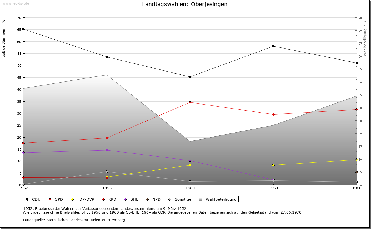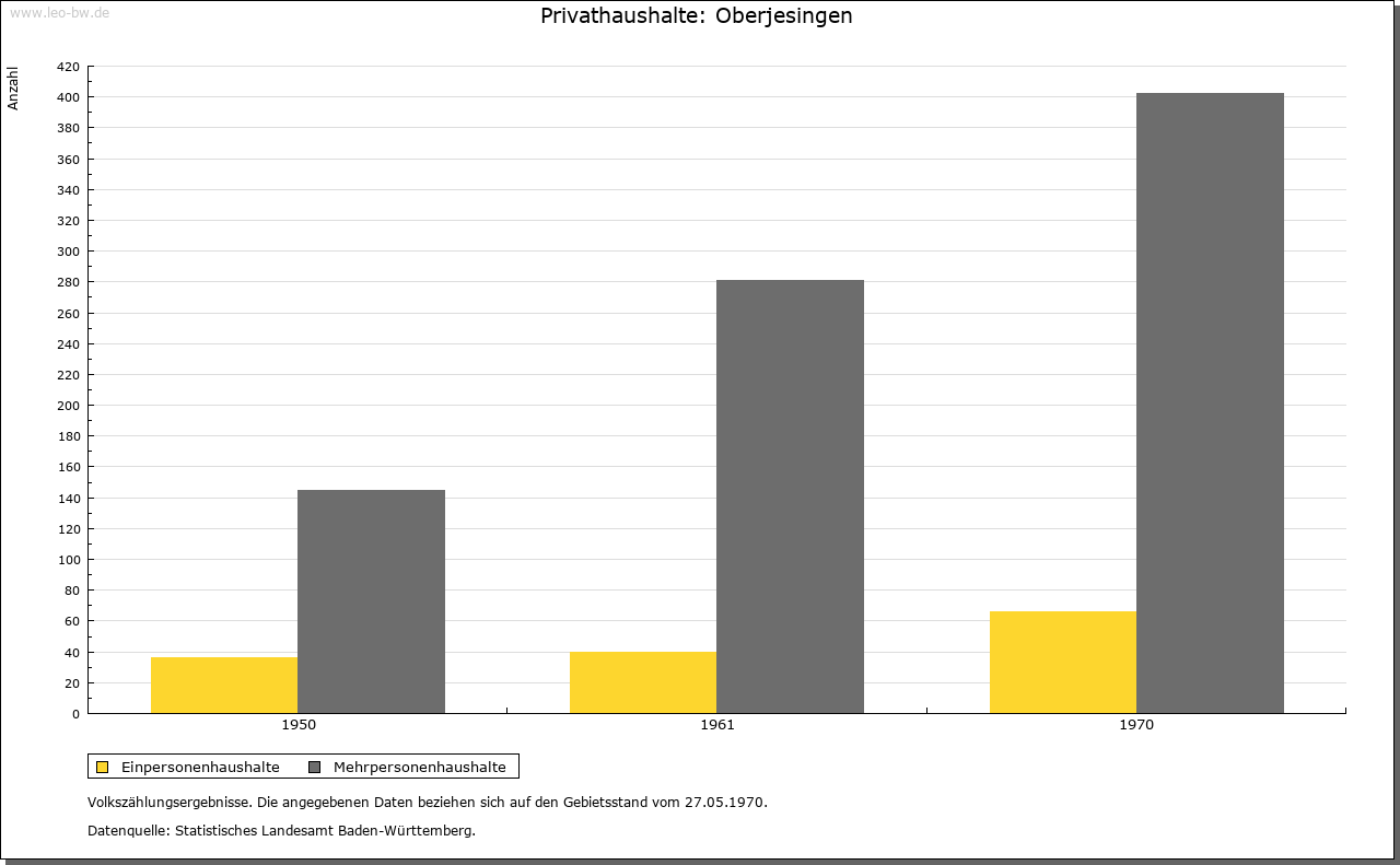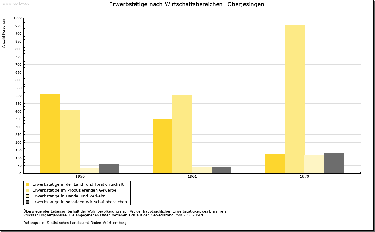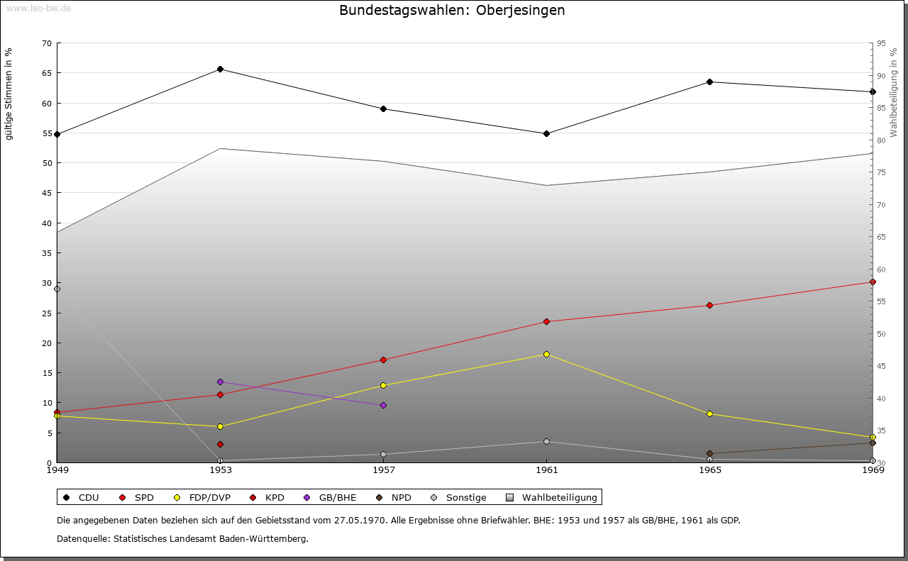 | Ortslage und Siedlung (bis 1970): | Trotz seines noch erhaltenen bäuerlichen Einschlags entwickelt sich Oberjesingen – auf einem flachen Rücken aus Lettenkeuper an der Bundesstraße 296 gelegen – seit 1945 zur Wohngemeinde. Ein ausgedehntes Neubaugebiet, in dem Ein- und Zweifamilienhäuser überwiegen, schließt sich seit 1954/74 im Osten (Rems-Murrstraße) und vor allem im Westen (Sturmerweg, »Mahden«, »Schwärzung«, Donaustraße) an den alten Ort an. Industrie ließ sich 1963/64 im Südosten (»Melcherle«) nieder. |