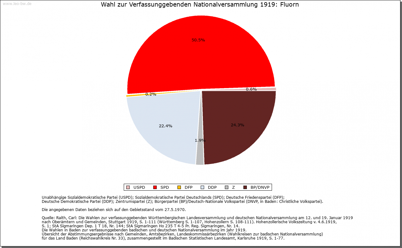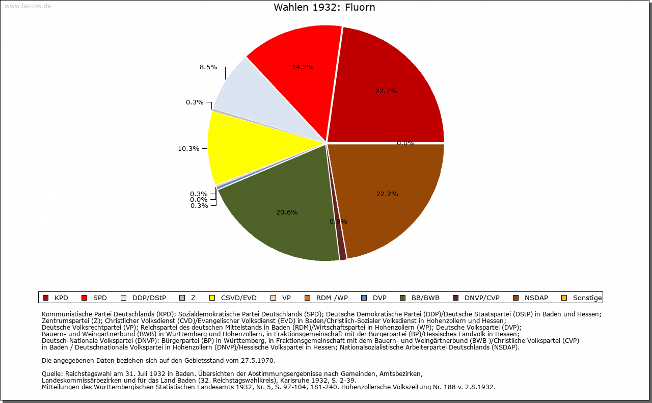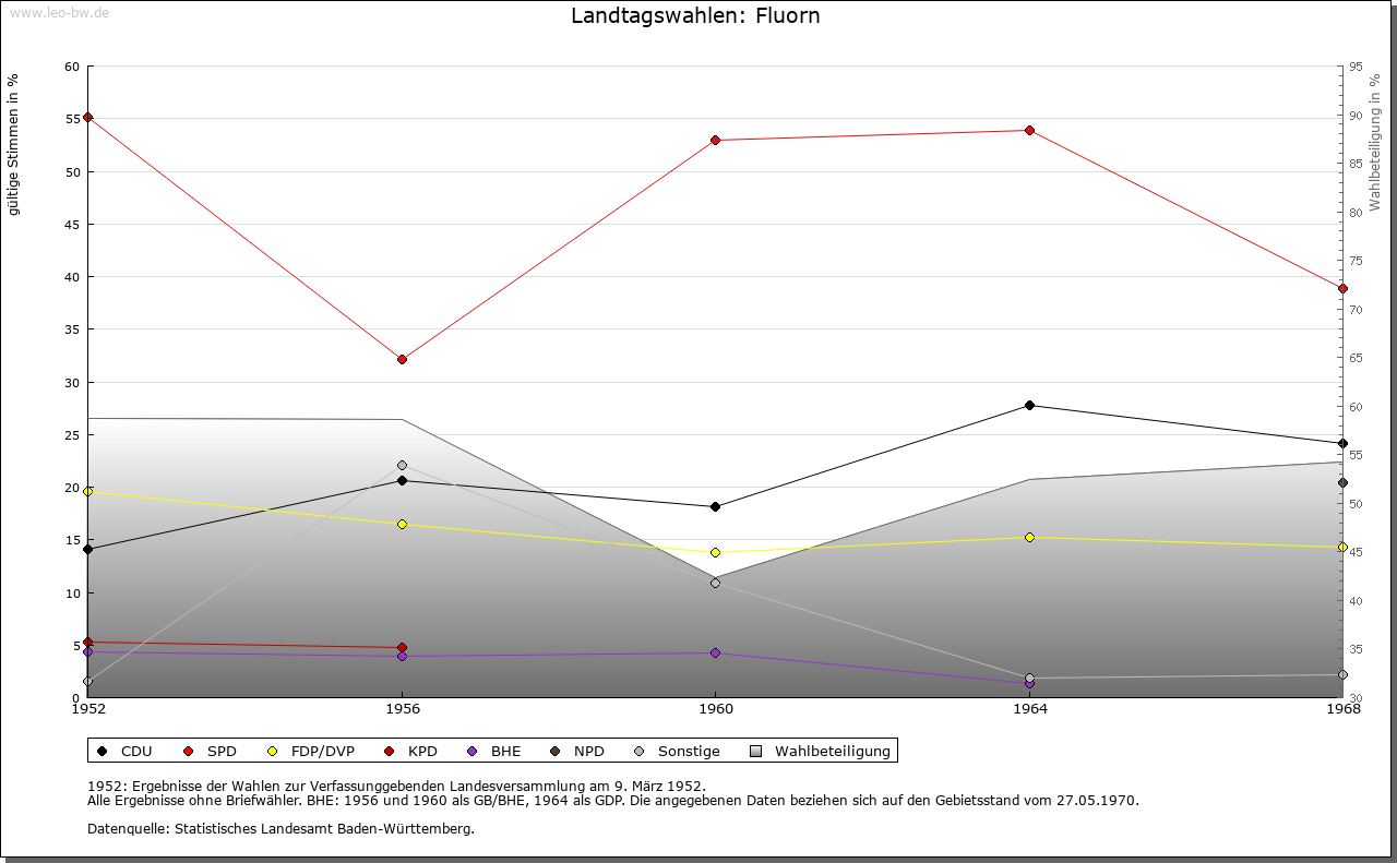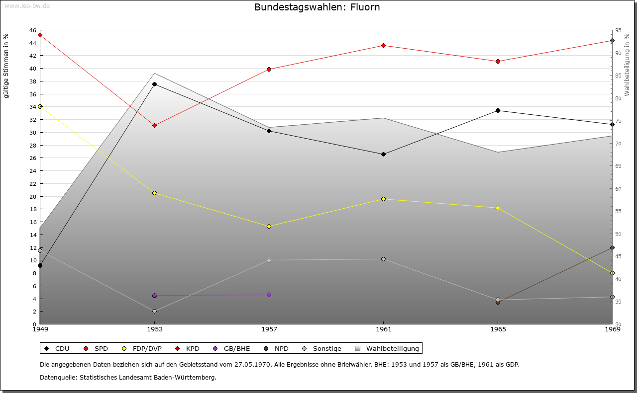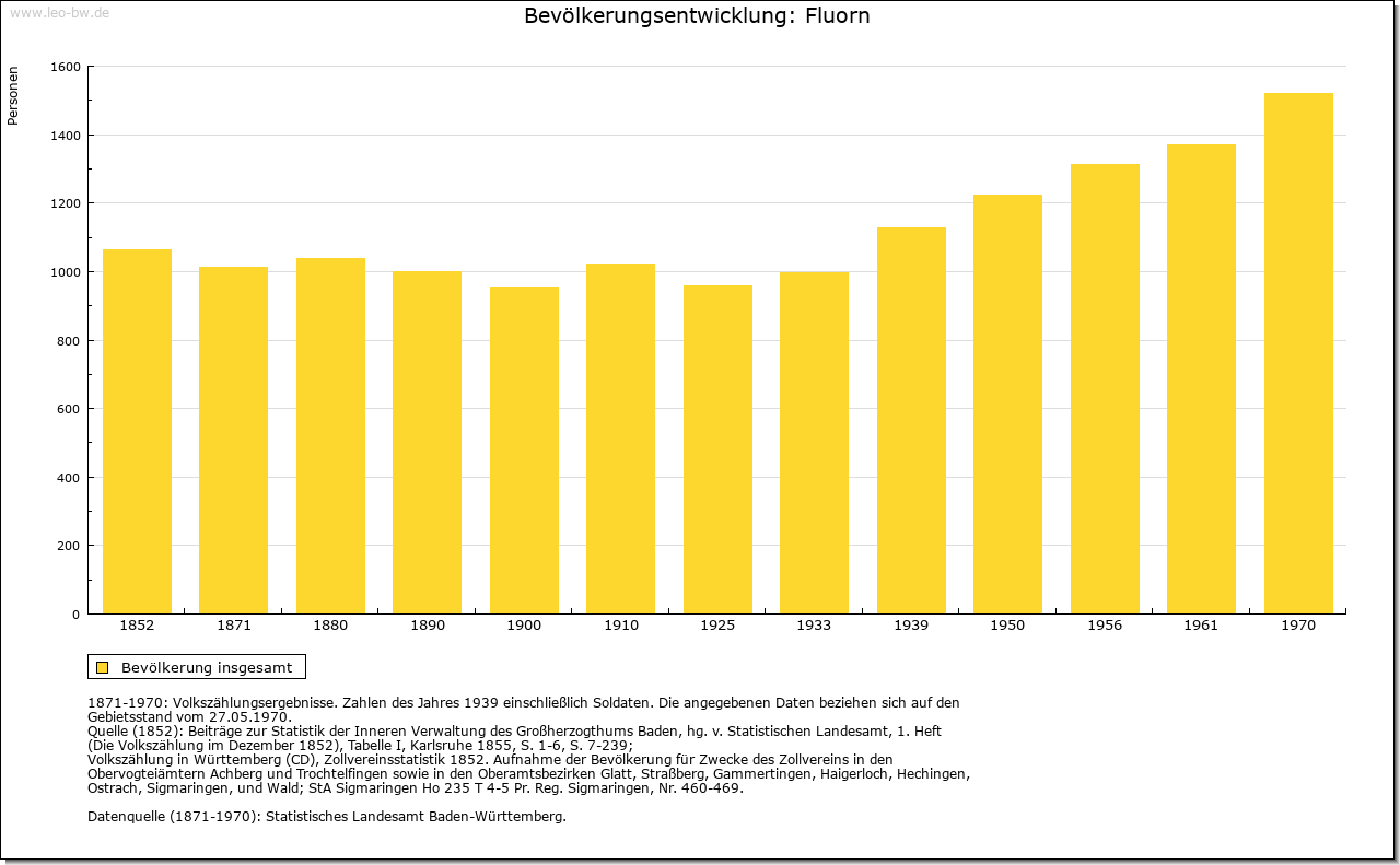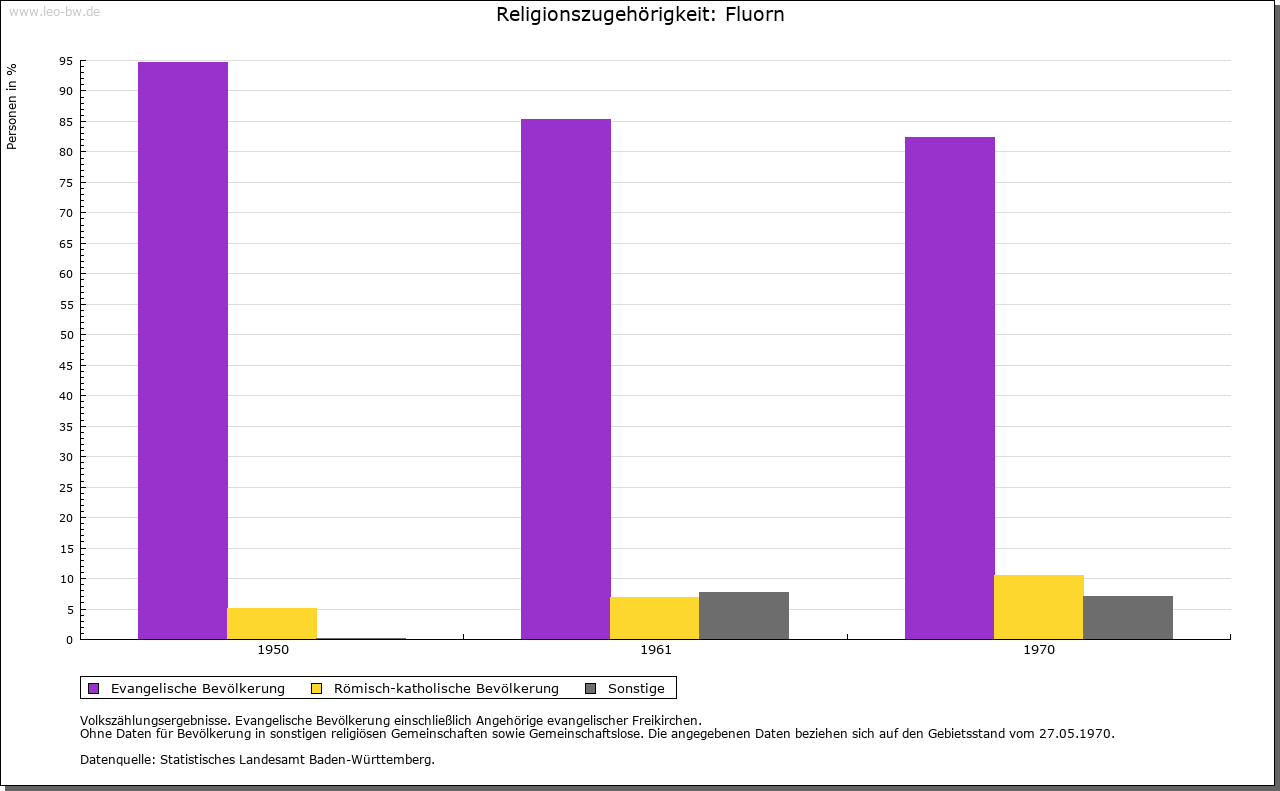 | Geschichte: | Der Ortsadel wurde erstmalig um 1099 im Zusammenhang mit der Stiftung des Klosters Alpirsbach erwähnt, als der Edelfreie (»liber homo«) Bernhard »de Vlorin« von den Stiftern, darunter Graf Alwig von Sulz, mit der Verwaltung des Stiftungsguts betraut wurde. Das 1401 letztmalig nachweisbare Geschlecht hatte seine Burg im oberen Ortsteil an der Stelle des heutigen Pfarrhauses. Als Wappen führte es das Andreaskreuz. Von den Grafen von Sulz, welche die gräflichen Rechte im Ort besaßen, ging Fluorn zwischen 1222 und 1267 als Erbschaft auf die Herren von Geroldseck über, die als Linie Sulz eine eigenständige Herrschaft einrichteten. 1471/73 erzwang der württembergische Graf Eberhard im Bart den geroldseckischen Verzicht auf die Herrschaft Sulz und damit auch Fluorns. Während der Vertreibung Herzog Ulrichs von Württemberg 1519–34 wurde die geroldseckische Herrschaft kurzfristig wiederaufgerichtet, wobei jedoch die grundherrlichen Rechte im Ort bei der von Habsburg dominierten Herrschaft Württemberg verblieben. Verwaltungstechnisch kam Fluorn nach dem Übergang an Württemberg an das Amt (später Oberamt) Sulz, bis es 1810 dem Oberamt Oberndorf zugewiesen wurde. Während der kurzfristigen Wiederaufrichtung der geroldseckischen Herrschaft wurden die grundherrlichen Rechte Württembergs in Fluorn von Dornhan aus verwaltet. Im 14. Jahrhundert waren die Herzöge von Teck, die Klöster Oberndorf und Wittichen, die Herren von Falkenstein sowie die Herren von Rüti nachweislich im Ort begütert. Ebenso hatte im darauffolgenden Jahrhundert das Kloster Alpirsbach Besitz in Fluorn. Die Herrschaft Württemberg schließlich verfügte 1527 als Besitznachfolger der Geroldsecker über sechs Lehnshöfe. Die ursprünglich dem Kloster Alpirsbach gehörenden Zehnten gingen 1527 an die Fluorner Kirche über. Der Neubruchzehnt gehörte seit 1553 der Herrschaft Württemberg. Strukturen einer Gemeinde lassen sich erstmals 1561 mit der Nennung von Mitgliedern des Dorfgerichts sowie des Rathauses und der Gemeinde 1590 erkennen. Fluorn kam 1938 zum Landkreis Rottweil. |