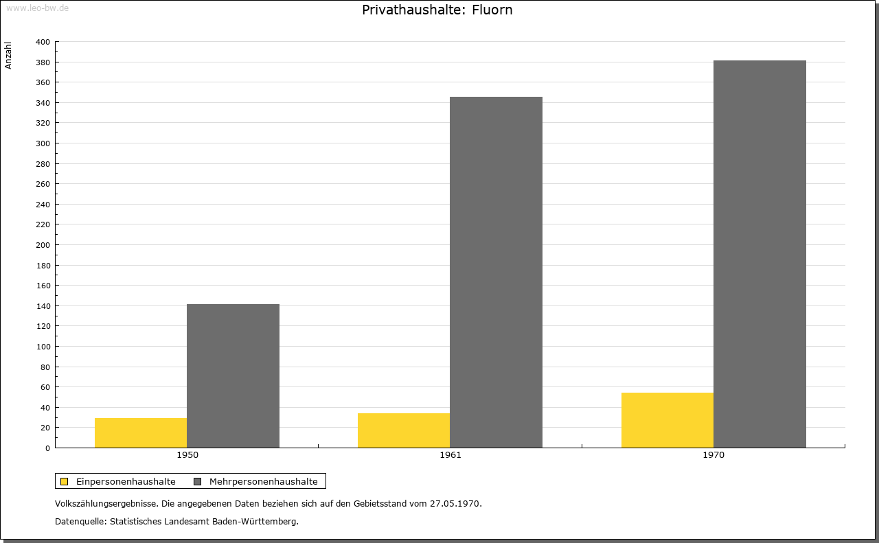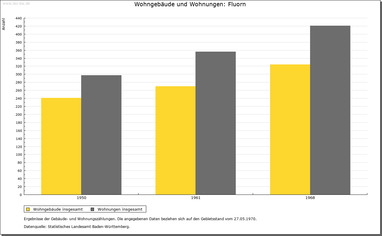 | Ortslage und Siedlung (bis 1970): | Der um 1099 erstmals bezeugte Namen »Vlorin« (mittelhochdeutsch »fluor« entspricht Feldflur, Saatfeld) lässt auf einen frühmittelalterlichen Ausbauort schließen. Darauf verweisen auch Grabfunde aus der alemannischen Zeit in der Nähe des Pfarrhauses und südlich des Orts. Schon für 1600 lässt sich die Benennung der nördlichen Ortshälfte in Unter- und der südlichen Ortshälfte in Oberfluorn nachweisen. Der südliche Siedlungsteil ist dabei wegen der archäologischen Funde der dort auf einem Hügel gelegenen ehemaligen Wehrkirche und der in früheren Zeiten unmittelbar südlich davon gelegenen Burg als Keimzelle Fluorns anzusehen. Als Folge des 30jährigen Kriegs sank die Zahl der Gebäude von 38 (1634) auf 23 (1655). 1730 war dann der Vorkriegstand mit 63 Häusern, darunter 57 mit einer Scheuer unter dem Dach, weit überschritten. Der 1408 erstmals nachweisbare, später abgegangene alpirsbachische Hof »Razenwiler« lag vermutlich in der nördlichen Gemarkung. In Fluorn besteht ein planmäßiges Neubaugebiet im Südosten. |
