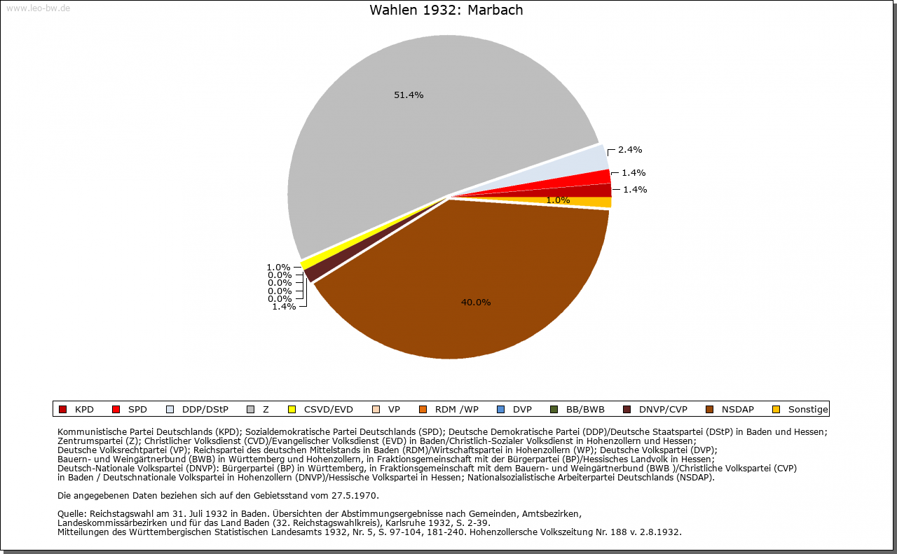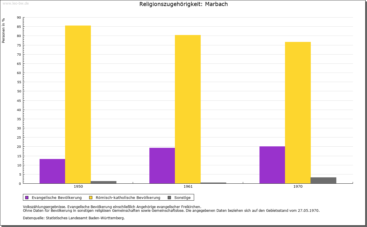 | Kirche und Schule: | Kirchlich stets zur Pfarrei Kirchdorf. Filialkirche St. Jakobus der Ältere, 1710 gebaut und 1935 erweitert; barock. Die Evangelischen bis 1976 nach Bad Dürrheim; seither Sitz einer evangelischen Pfarrei, die zur Gesamtkirchengemeinde Villingen zählt. Der Sprengel der Pfarrei Marbach umfaßt auch Kirchdorf, Klengen, Pfaffenweiler, Rietheim, Uberauchen, Herzogenweiler und Tannheim. Kirche von 1970. |