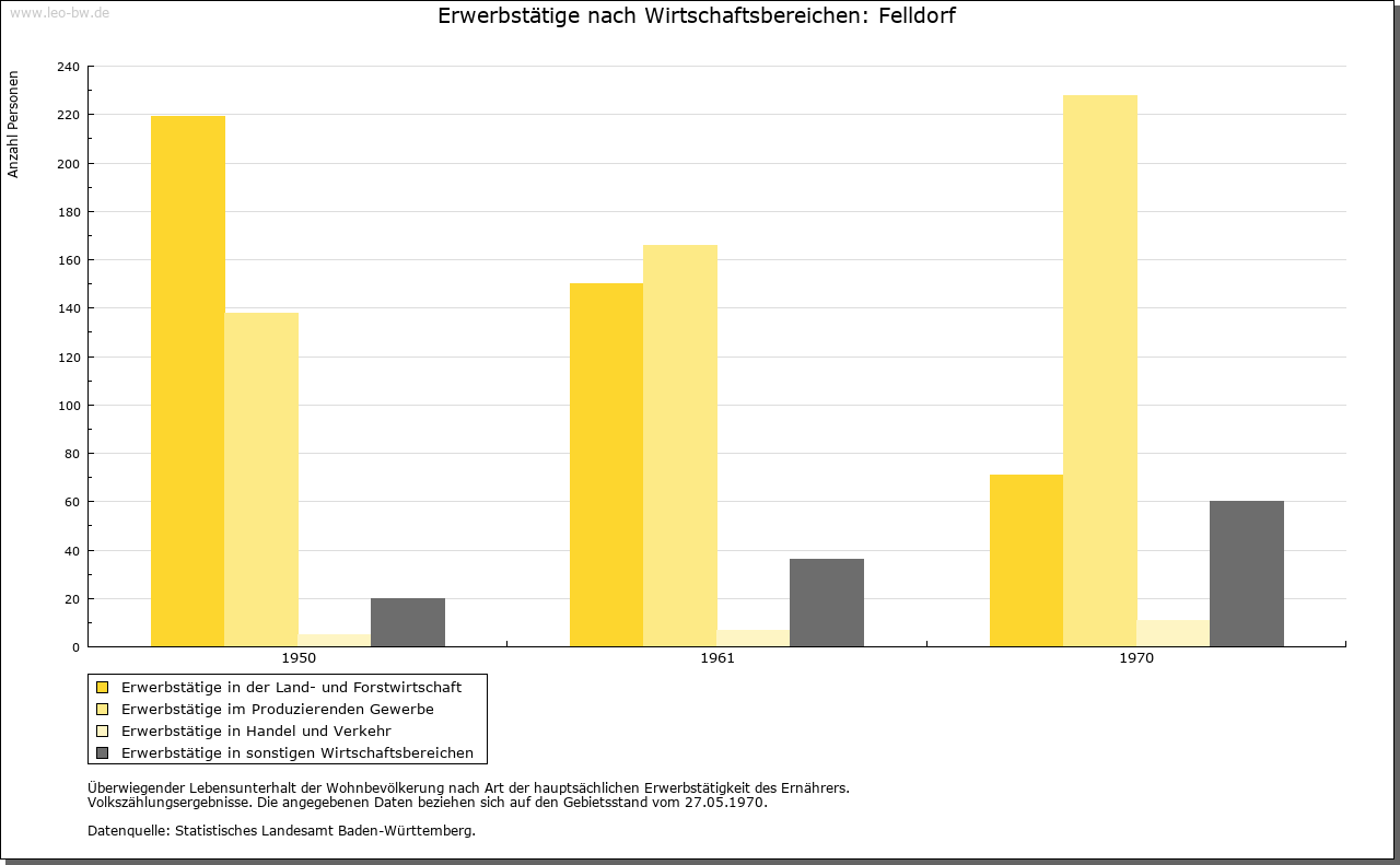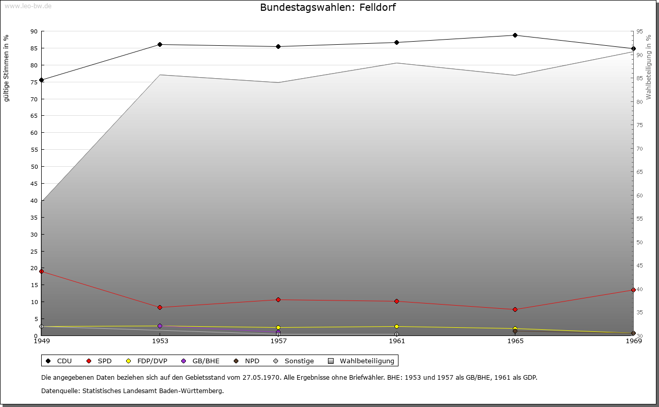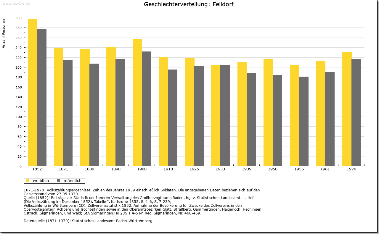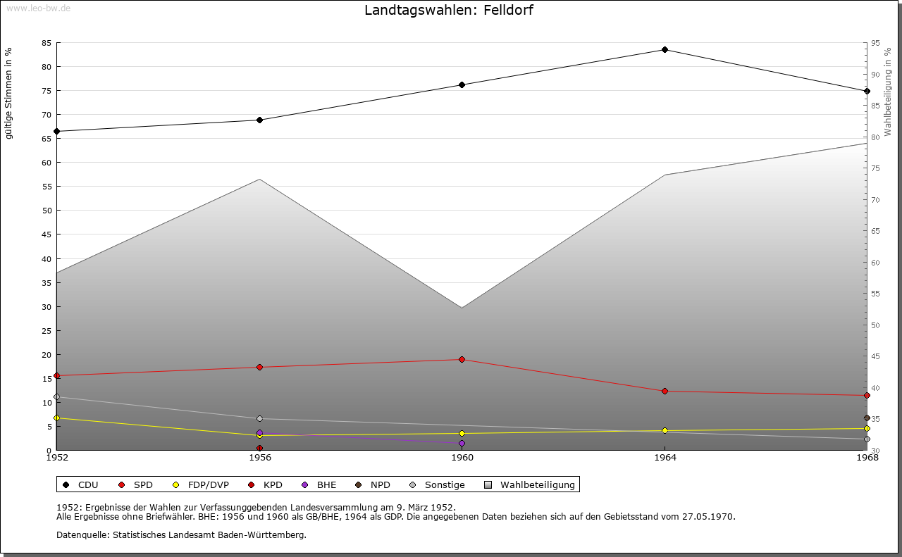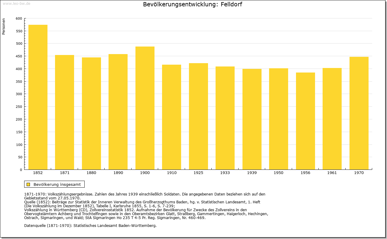 | Geschichte: | 1324 Veldorf. Siedlung des älteren Landausbaus, alemannische Reihengräber nördlich der Kirche. Nach dem Ort nannten sich seit dem 14. Jahrhundert die niederadeligen Megenzer. Weitere Sitze hatten diese in Killer (bei Hechingen) und Mössingen, später auch in Wurmlingen, Rottenburg, Tübingen und Egelstal bei Horb. Das Geschlecht erlosch im Mannesstamm 1695. Abgegangene »Alte Burg« über dem Eyachtal, ebenso Burg im »Großen Hag« sowie Burg und Schloss im Dorf (1886 abgebrochen). Der Ort war mit hoher und niederer Gerichtsbarkeit Eigengut der Ortsherren, im 13. und 14. Jahrhundert der Megenzer und der Herren von Ow. Anfang 14. Jahrhundert je zur Hälfte an die Böcklin von Eutingertal und die Schenken von Stauffenberg. Nach 1414 bis um 1433 Erwerb durch die Herren von Ow, die später auch mit dem Blutbann belehnt wurden und mit dem Rittergut dem Ritterkanton Neckar und Schwarzwald angehörten. Das Obervogteiamt Felldorf kam 1805 samt Neuhaus und Ahldorf unter württembergische Staatshoheit, 1807 zum Oberamt (1938 Landkreis) Horb. |