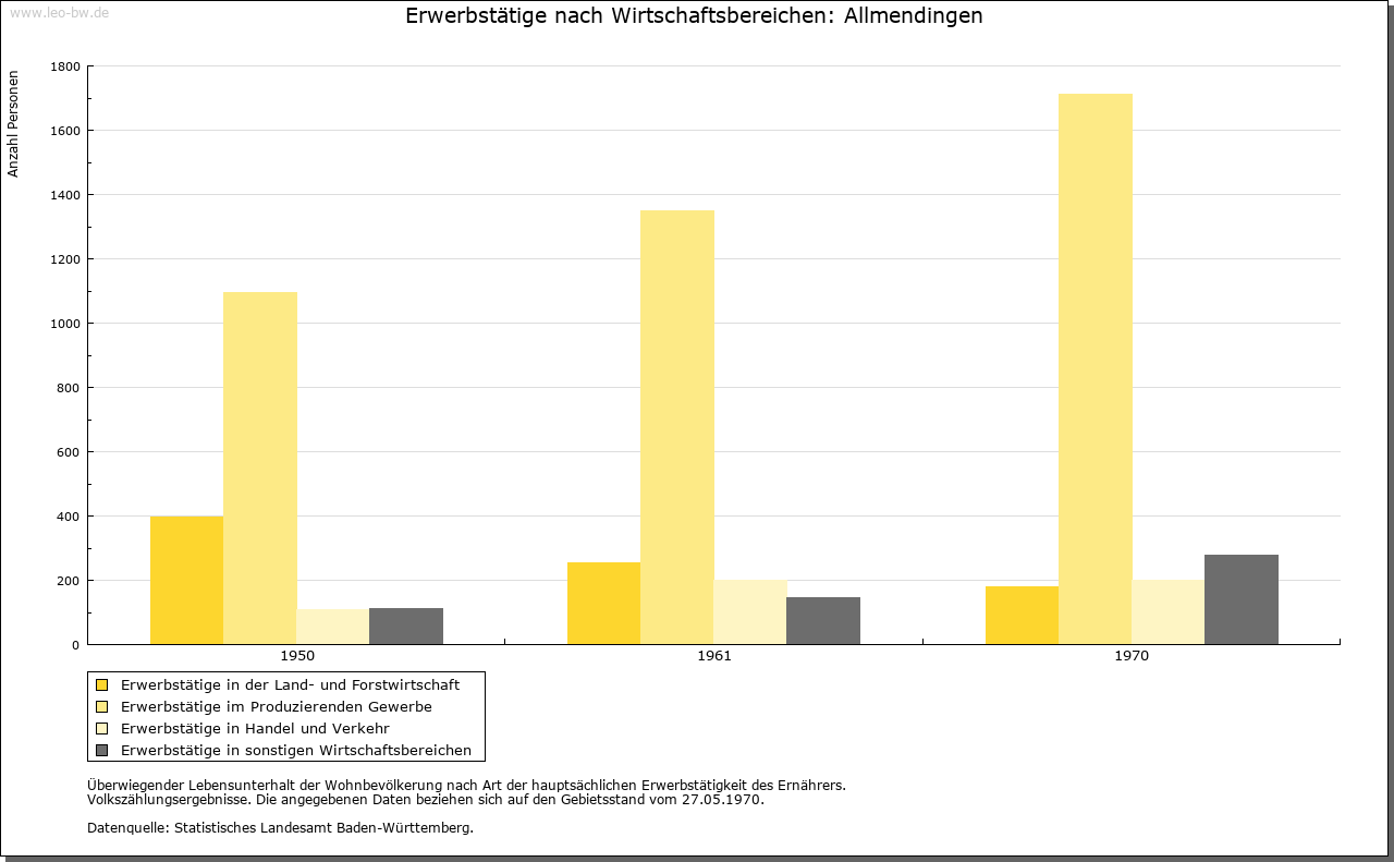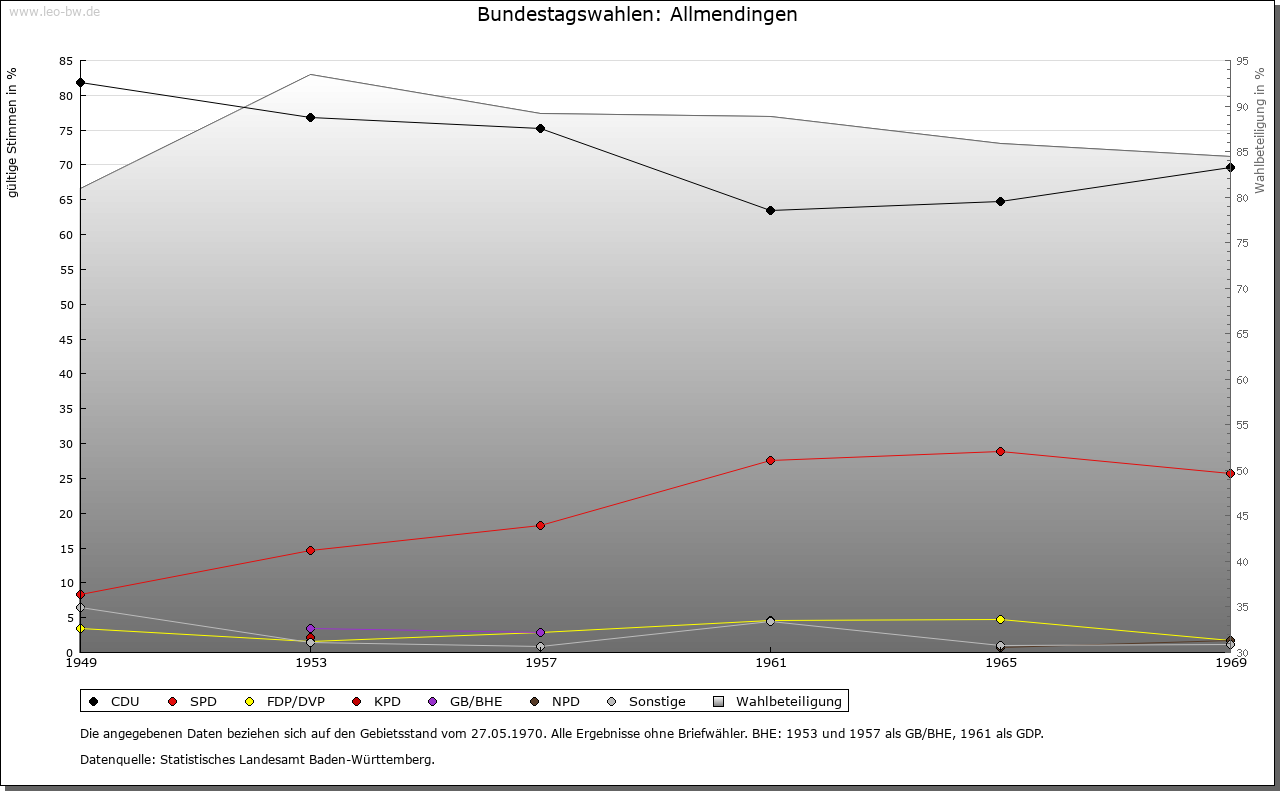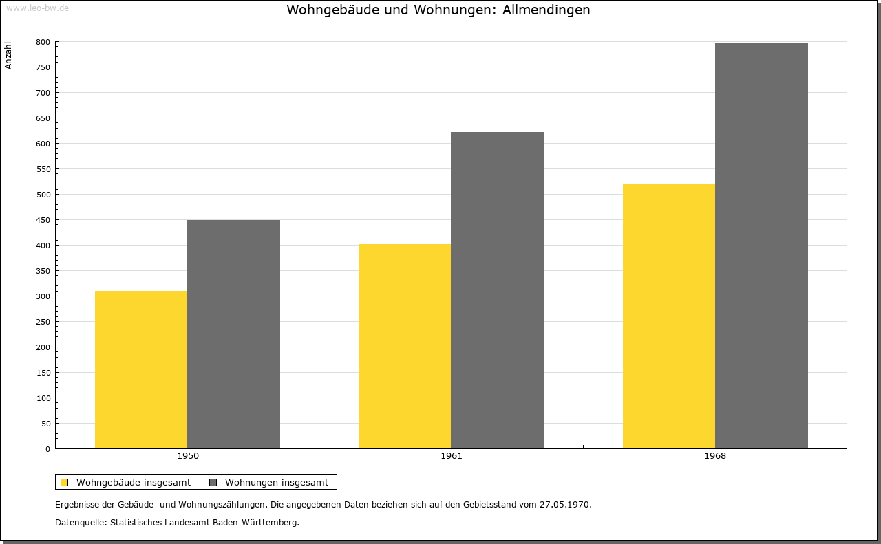 | Ortslage und Siedlung (bis 1970): | Der Ort ist aus zwei Siedlungen zusammengewachsen, aus Großallmendingen am Ostrand und Kleinallmendingen am Westrand der Talaue. Während dieses noch länger dörflich blieb, entwickelte sich Großallmendingen seit dem Aufkommen der Zementindustrie um 1880 zum Arbeiterwohnort. 1938 Arbeitersiedlung Schwenksweiler. Starke Bautätigkeit vor allem seit 1958. Neubaugebiete Hinter den Höfen auf der Talsohle im Norden, Büchel am Talhang im Westen (mit 2 Punkthochhäusern) und an der Straße nach Altheim. 1964 Ortsumgehungsstraße im Zuge der Вundesstraße 492. |