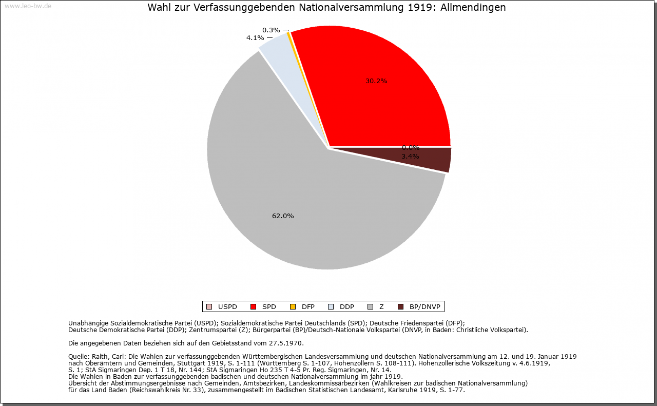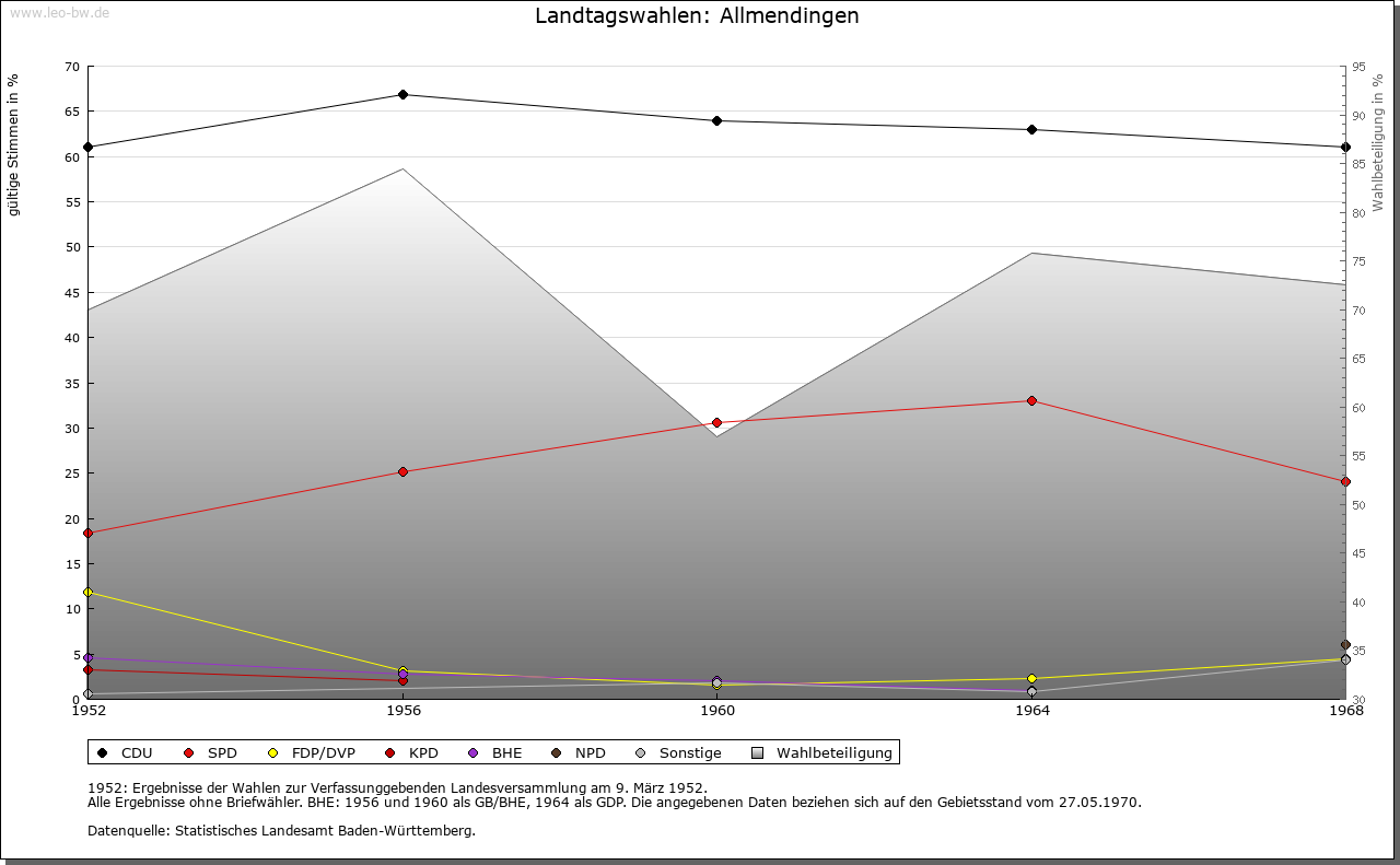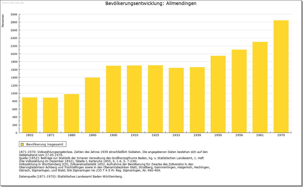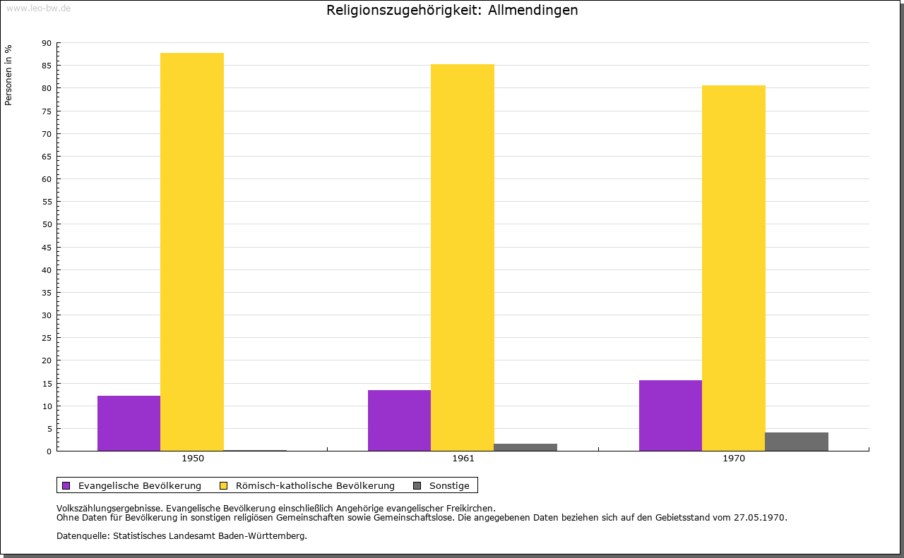 | Ortslage und Siedlung (bis 1970): | Der Ort ist aus zwei Siedlungen zusammengewachsen, aus Großallmendingen am Ostrand und Kleinallmendingen am Westrand der Talaue. Während dieses noch länger dörflich blieb, entwickelte sich Großallmendingen seit dem Aufkommen der Zementindustrie um 1880 zum Arbeiterwohnort. 1938 Arbeitersiedlung Schwenksweiler. Starke Bautätigkeit vor allem seit 1958. Neubaugebiete Hinter den Höfen auf der Talsohle im Norden, Büchel am Talhang im Westen (mit 2 Punkthochhäusern) und an der Straße nach Altheim. 1964 Ortsumgehungsstraße im Zuge der Вundesstraße 492. |