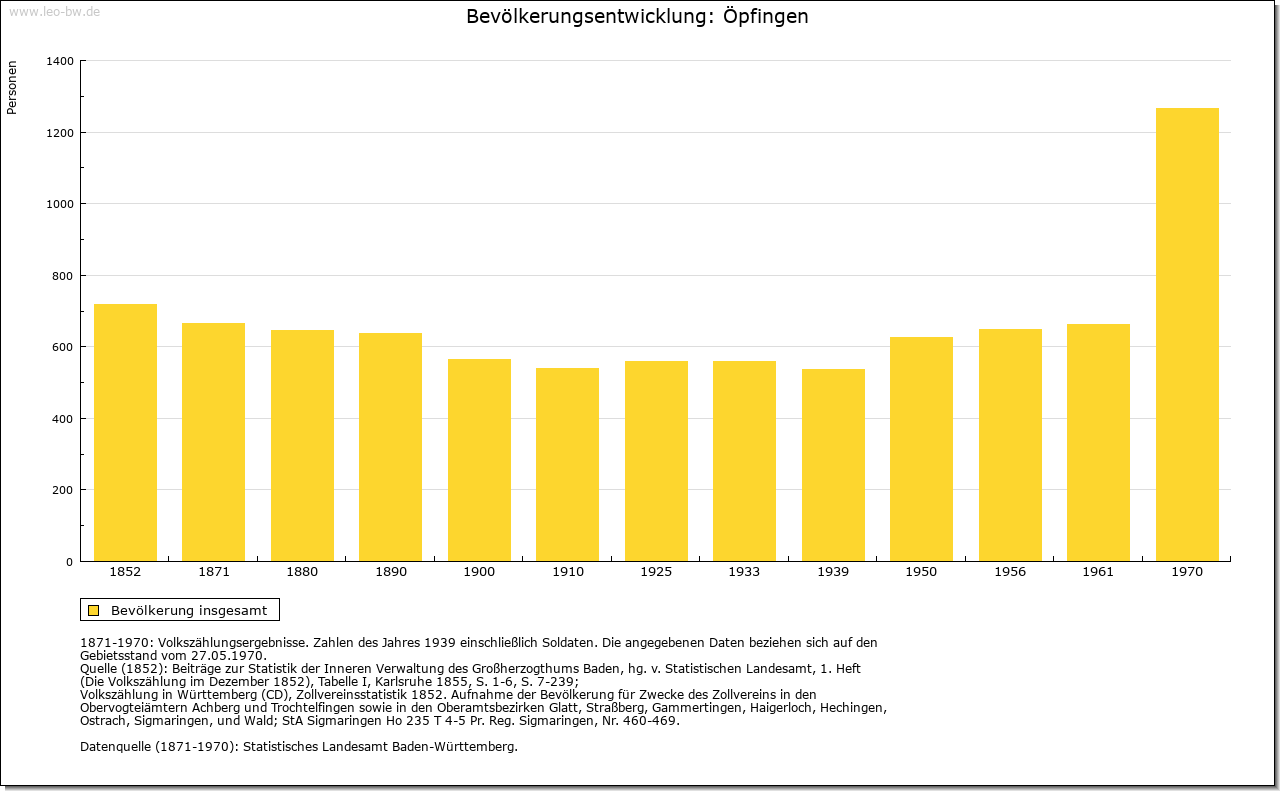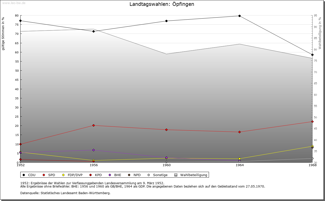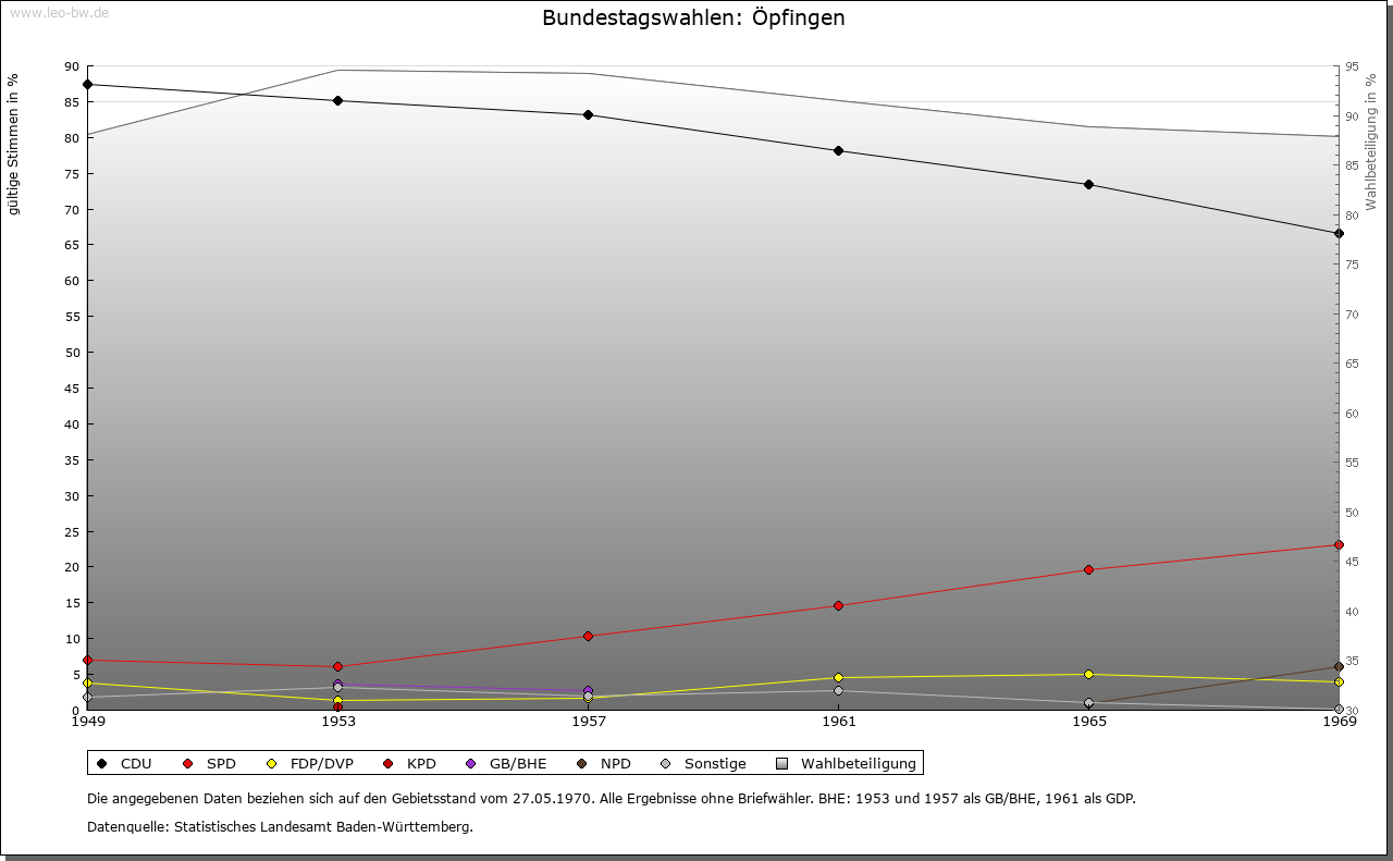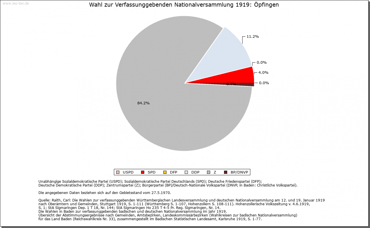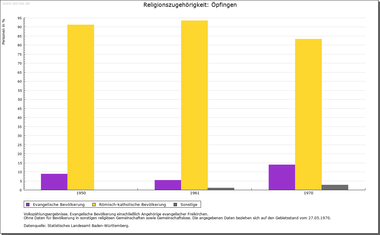 | Kirche und Schule: | Kirche und Pfarrei 1275, Sankt Martin 1675. Patronat der Ortsherrschaft. Die von Freyberg reformierten nach 1534 im lutherischen, nach 1545 im Sinne des längere Zeit im Justinger Schloss wohnenden Mystikers Kaspar Schwenckfeld. Der Widerstand Österreichs und der Stadt Ehingen führte zu teils blutigen Auseinandersetzungen 1545/47 (Schwenckfeidischer Krieg) und von um 1605 bis in den 30jährigen Krieg hinein (Öpfinger Krieg, Griesinger Scharmützel). Die endgültige Gegenreformation erfolgte spätestens 1660. Die katholische Pfarrkirche erhielt ihre heutige Form im 18. Jahrhundert, Schiff 1862 durch Anbau erweitert. Friedhofskapelle um 1860. Evangelische nach Erbach-Ersingen. |