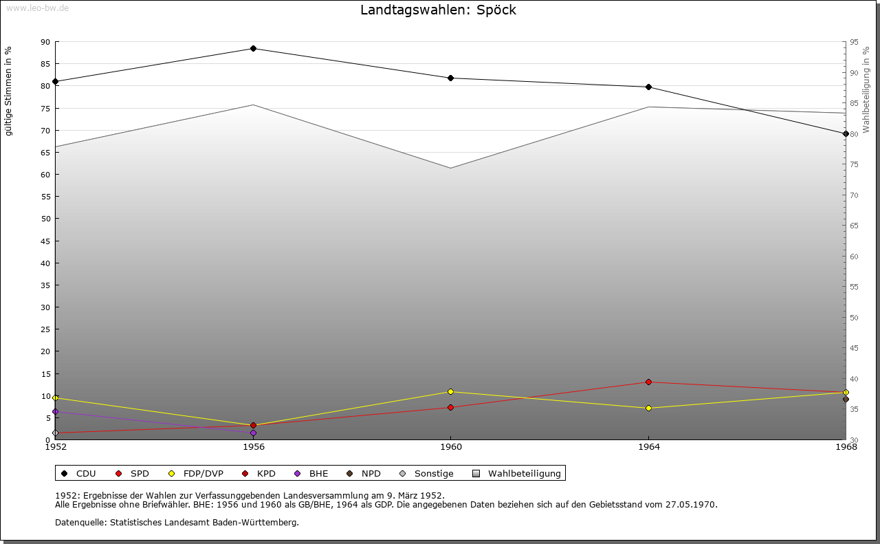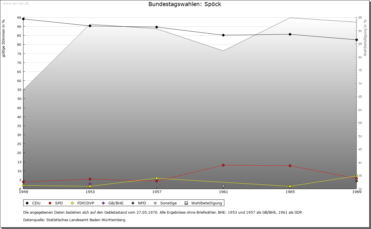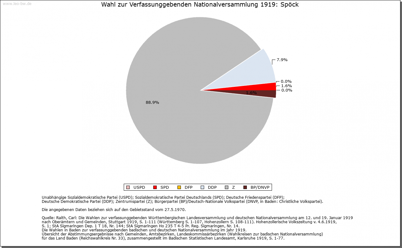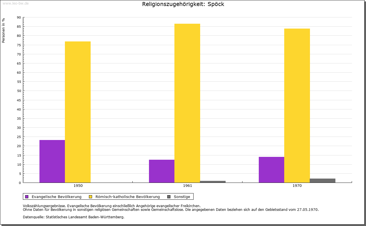 | Geschichte: | 1244 (Tradition 13. Jahrhundert), 1248 de Specke. Der niederadlige Ritter Eggehart von Spöck ist um 1244 bis 1248 als Lehensmann der Herren von Bittelschieß erwähnt. Güter der Herren von Gundelfingen gingen 1265 und 1279 an Kloster Salem über. Nachweislich 1324 gehörte der Ort zur Grafschaft Sigmaringen, die auch später stets die Hochgerichtsbarkeit ausübte. Im übrigen gehörte er zum salemischen Amt Ostrach, schied mit diesem 1611 aus der Grafschaft aus und fiel 1803 an die Fürsten von Thurn und Taxis. 1806 unter die Staatshoheit von Hohenzollern-Sigmaringen, 1850 an Preußen. Bis 1862 beim standesherrlichen Oberamt Ostrach, dann Oberamt (1925 Landkreis) Sigmaringen. |