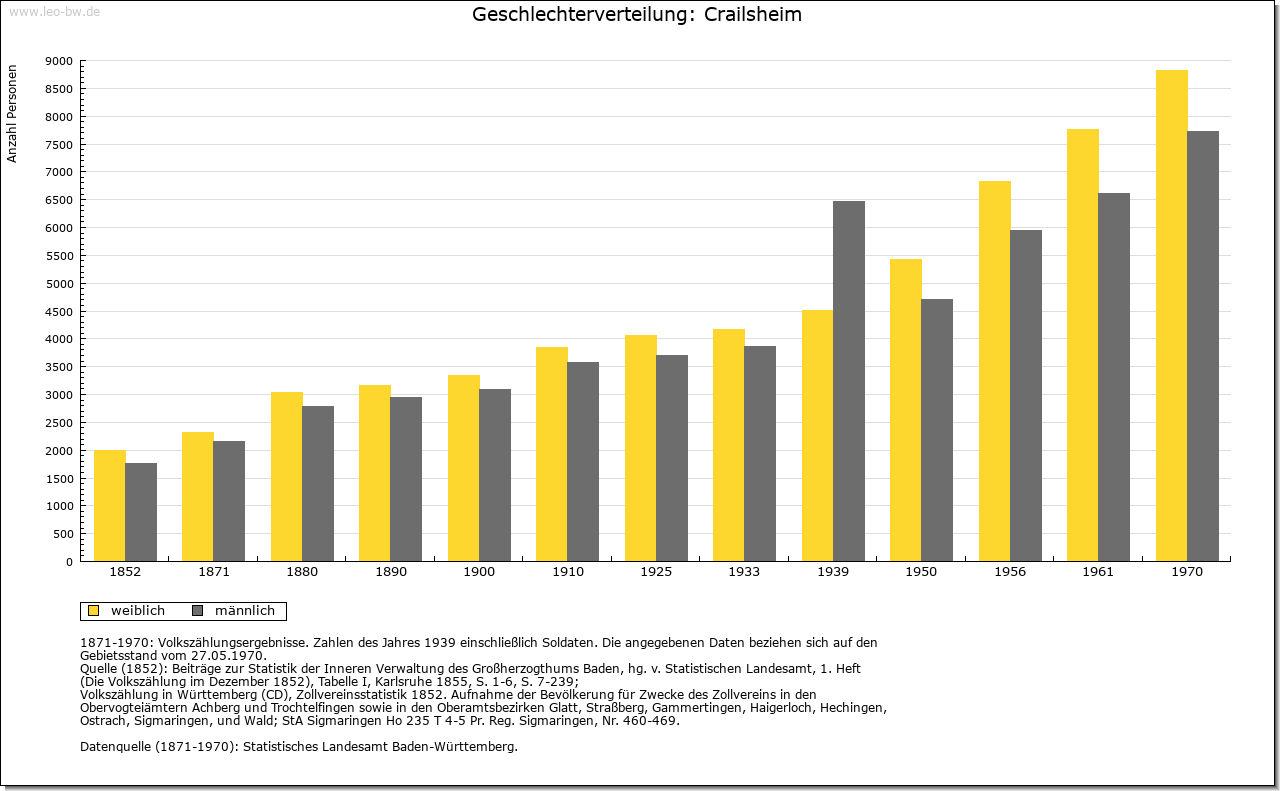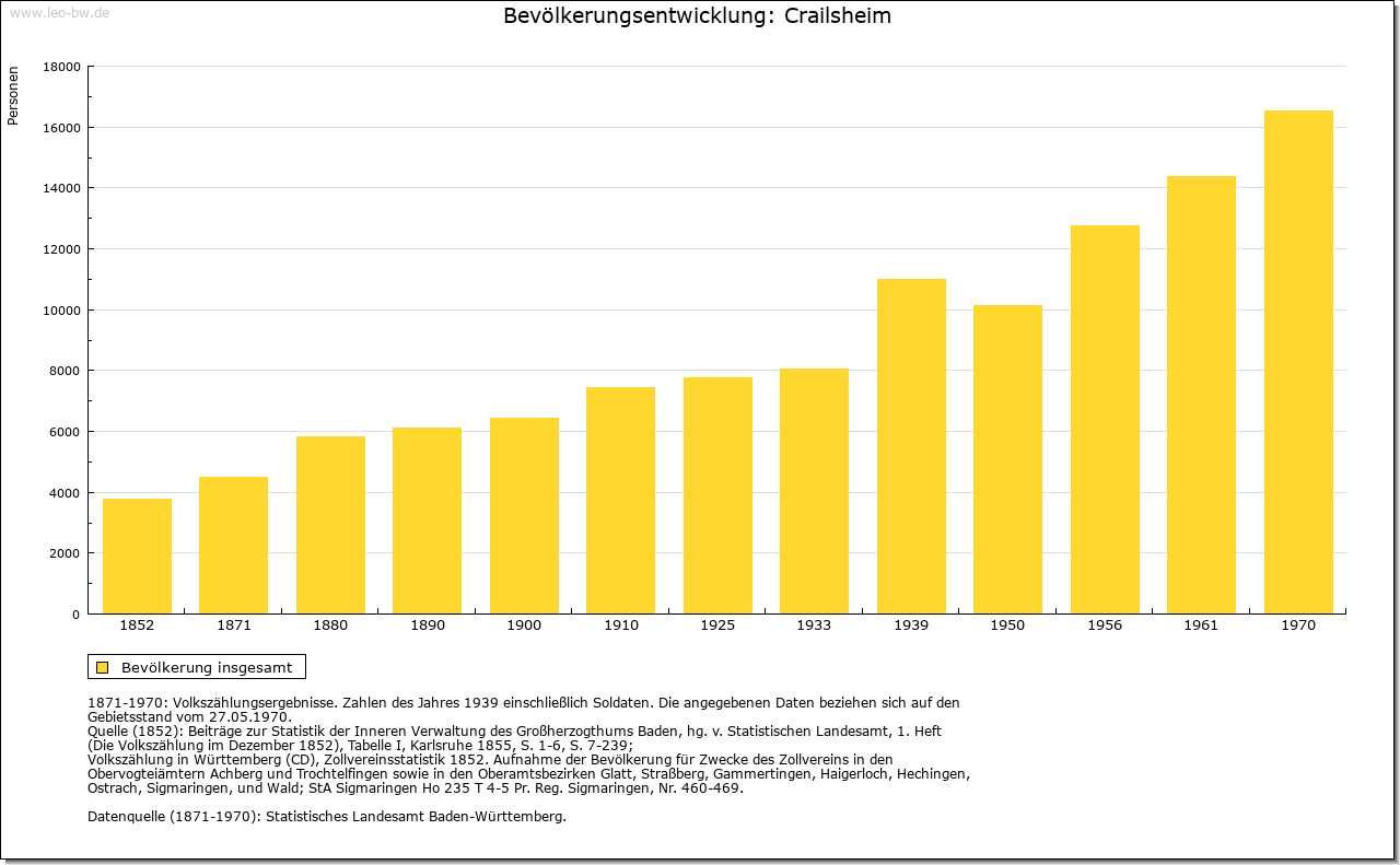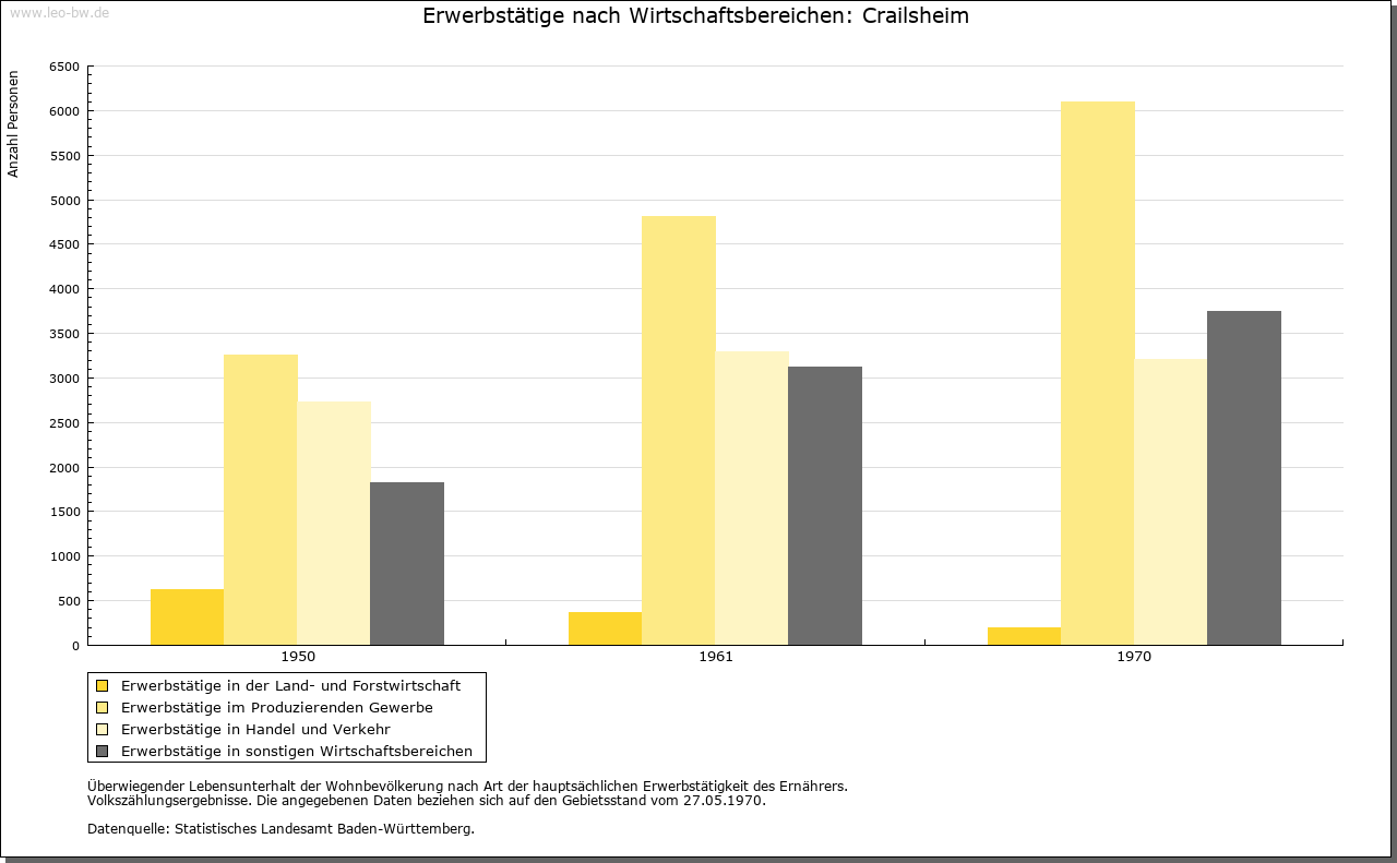 | Wirtschaft und Bevölkerung: | Die Einwohnerzahl Crailsheims ist erst 1497 aus dem Register für die Reichssteuer mit etwa 1100–1200 Personen zu erschließen. Immerhin gibt das Urbar von 1434 einige Auskünfte über das Crailsheimer Handwerk: Im Rathaus waren damals je acht Fleischbänke und Brotbecken einquartiert. Weiter gab es in der Stadt fünf Gewandschneider, sechs Kramläden, vier Gerber und 20 Schuster. Außerdem werden ein Kalkofen und die Ziegelhütte genannt sowie drei Badhäuser. Das Lagerbuch von 1532 gibt Auskunft über die Ackerbürger der Stadt: 26 Städter hatten mit drei Onolzheimern die 29 Feldlehen des Markgrafen inne, dazu kamen noch fünf Feldlehen, die von Ellwangen vergeben wurden, und ein Eigengut. Vorübergehend gab es in Crailsheim auch Weinbau, ausdrücklich 1396 vom Landgraf von Leuchtenberg angeregt. Die soziale Schichtung der Bevölkerung lässt sich ebenfalls aus dem Reichssteuerregister ablesen, insofern von den 219 Vollbürgern 16 ein Vermögen über 500 Gulden und sieben über 1000 Gulden hatten, das heißt circa 10 Prozent der Bürger konnten als reich gelten. Diese Bürger besaßen ihrerseits im Umland circa 120 Untertanen, wozu noch die von den Bürgern verwalteten kirchlichen Einrichtungen mit etwa gleichem Güterumfang kamen. Eine nahezu vollständige Übersicht über die Gewerbe in der Stadt erlaubt die Legende zum Stadtplan von 1738. Danach diente Crailsheim umfassend dem Bedarf der umwohnenden Bevölkerung, zumal die sieben Jahrmärkte zusätzliche Angebote schufen. Auf die Bedeutung als Marktort, seit 1689 als Poststation, weist die große Zahl von 16 Wirtschaften, wozu noch zwei Bierbrauer kamen. Umgekehrt verarbeitete Crailsheim Rohstoffe des Umlandes, ablesbar etwa an den Gerbern, Schustern, Kürschnern, Säcklern, Sattlern und Gürtlern einerseits und Mehlhändlern und wohl Juden für den (Vieh)handel andererseits. Gewebt wurde dagegen offenbar auf dem Bauernhof selbst, während in der Stadt sieben Weber, sechs Hutmacher, fünf Tuchmacher, vier Bortenwirker, je drei Seiler und Strumpfstricker sowie zwei Zeugmacher Spezialanfertigungen lieferten. Dazu gab es vier Färber, die auch für die Gerbereien arbeiten mochten, und einen Tuchscherer sowie sieben Strumpfhändler, die in merkwürdigem Missverhältnis zu den drei Strumpfstrickern stehen. Einen weiteren Schwerpunkt stellte das Metallhandwerk dar mit zwölf Schmieden, sechs Schlossern, zwei Rot- und Zinngießern, zwei Uhrmachern und einem Büchsenmacher. Gerade diese Metallhandwerker stellten nach der Bruderschaft der Schneider von 1452 denn auch die zweitälteste bekannte Zunft Crailsheims dar mit ihrer Elegiusbruderschaft von 1472. Weitere Zunftordnungen sind vom 16. bis 18. Jahrhundert belegt. Im 18. Jahrhundert traten zu den Handwerksbetrieben auch Manufakturen, beginnend mit der Fayencemanufaktur der ehemaligen Häfnerei Weiß und 1755 mit der Glockengießerei Lösch, die 1754 ein Privileg für die gesamte Markgrafschaft erhalten hatte und 1782 eine Dependance in Ansbach eröffnete. Dann folgten circa 1760 eine Färbereifabrik, eine Baumwollweberei, aus der 1788 eine Manchesterfabrik hervorging, und eine Spinnerei sowie seit 1766 das von Markgraf Alexander gegründete Bergwerk, das aus Lettenkohle Vitriol und Alaun gewinnen sollte. Dazu passte die Gründung einer Messe 1777, die ausdrücklich die erlahmten Umsätze in Crailsheim fördern sollte, und die Privilegierung einiger Manufakturen. 1792 wurde ein Kaffeehaus (mit Billardbetrieb) eröffnet (Wilhelmstraße 19). Eine Apotheke bestand seit 1561, einen Stadtmedicus gab es seit 1594. Die eigentliche medizinische Versorgung leisteten die drei Bader und Hebammen, für die bereits 1480 Pfarrer Sattler eine Ordnung samt Anweisung für einen Kaiserschnitt aufschrieb. Seit 1702 gab es zudem ein Badhaus mit Kurbetrieb (Sauerbrunnen). Als herrschaftliche Verwaltungsposten wies der Stadtplan je einen Amtsschreiber, Kastner, Überreiter und Zolleinnehmer neben Oberamtmann und dessen Gesinde aus; die Stadt selbst hatte je einen Stadtschreiber, Torschließer und Torwart, dazu sind ein oder mehr Hirten anzunehmen; die Kirche beschäftigte den Dekan, je einen Mesner und Organisten, ferner zwei Kapläne und drei Lehrer an der Lateinschule und zwei an den beiden deutschen Schulen. Der Übergang an Württemberg beeinträchtigte die Bedeutung von Crailsheim nicht, sie wurde durch Zuzug neuer Behörden eher noch gehoben, die Verkehrsverhältnisse verbesserten sich vor allem durch den Bau der Eisenbahn seit Mitte des 19. Jahrhunderts. Die Landwirtschaft verlor schon im 19. Jahrhunderts an Bedeutung, doch herrschten noch lange Handel und Kleingewerbe vor. Stärkere Ansiedlung von Industrie erfolgte erst in neuester Zeit. |