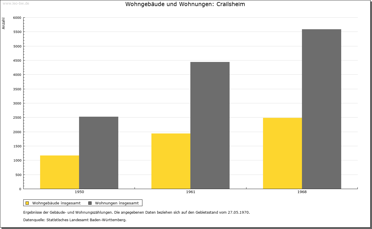 Ortslage und Siedlung (bis 1970): | Der Reihengräberfriedhof unter der Johanneskirche legt nahe, die ursprüngliche Siedlung am Trutenbach zu suchen. Das spätere Stadtgelände war jedenfalls bis 1000 Ackerland. Erst der Bau der Kirche zog dann die Siedlung an, vielleicht zunächst nur entlang der heutigen Adam-Weiß-Straße. Spätestens im 13. Jahrhundert wurde dann mit der Langen Straße eine Marktstraße mit zwei Toren angelegt. An dieser Straße entstand im 14. Jahrhundert das herrschaftliche Rathaus und in dessen Schutz wohl ein jüdisches Ghetto, das im Zuge der Pestpogrome zerstört wurde. Offenbar wurde nun an dessen Stelle Ende des 14. Jahrhunderts als Sühne die Liebfrauenkapelle errichtet. Die so genannte Fronveste übernahm die Sicherung des Nordtores, der Goldbacher Freihof die des Südtores, und ein weiterer Freihof in der Schulstraße die Deckung der Südostecke, das Bauhaus am Mittelabschnitt der Westmauer die Sicherung der darunter gelegenen Herrenmühle. Ein entsprechender Schutz im Nordosten war der heutige Diebsturm vor der damaligen Stadtmauer, wahrscheinlich Bergfried einer dortigen Burg. Vom Diebsturm nach Süden erstreckte sich der Breitsee, der diese am stärksten gefährdete Mauerpartie sicherte. Gegenstück auf der Südwestecke war eine Wasserburg unterhalb der Johanneskirche, vielleicht auch der im Stadtmuseum enthaltene Steinturm innerhalb der Ursiedlung am Trutenbach. Spätestens im 14. Jahrhundert entstand im Breitsee die Wasserburg des Landesherrn. Ende des 14. Jahrhunderts wurde das Gelände der Innenstadt um Geschosshöhe aufgefüllt und zugleich der Breitsee zugeschüttet. Die Stadt wurde nun in der Weise erweitert, dass die Stadtmauer zwischen die beiden Burgen im Osten gelegt und vom Diebsturm nach Westen eine neue Partie vorverlegt wurde. Dabei entstanden zwei neue Tore: Jagsttor und Ziegeltor, benannt nach der davor gelegenen Ziegelei. Zur Aufsiedlung dieser etwa verdoppelten Stadtfläche wurden offenbar einige bisherige Orte im Umkreis der Stadt aufgelassen, womit Crailsheim wohl die Markung erhielt, die 1835 mit 1025 Hektar landwirtschaftlicher Fläche, dazu circa 800 Hektar Wald angegeben wird. Auch die Pfarrkirche wurde ab 1398 erweitert. Ein 1400 gestiftetes Spital beim Rathaus wurde ab 1423 in die Spitalvorstadt verlegt, wo es mit der Südmauer und dem davor gelegenen Spitalsee eine zusätzliche Vorbefestigung darstellte. Hier lagen auch das älteste, bis heute noch betriebene Crailsheimer Wirtshaus Zum Stern sowie einige feuergefährliche Handwerksbetriebe und ein Bauernhof. Eine ähnliche Besetzung bietet später auch die Jagstvorstadt mit Häfnerei, Glockenschmiede, den seit 1425 belegten Gerberhäusern und einem Wirtshaus. Jenseits der Jagstbrücke von 1497 stand die Brechhütte und seit mindestens 1463 das Feldsiechenhaus mit Wolfgangskapelle. An der Jagst selbst lagen bereits 1357 die Velweiden- oder Kuppelesmühle, die Herrenmühle und die Kalkofenmühle bei einem Kalkofen. Auf der durch den Mühlkanal der Herrenmühle gebildeten Insel war die Bleiche mit entsprechendem Waschhaus, eine weitere Bleiche lag am Trutenbach oberhalb des Spitalsees. Auf der Brücke wurde in einem Zollhaus Brückenzoll erhoben. 1737 ordnete der Markgraf an, die am Ziegeltor gelegenen öden Hausplätze zu bebauen. Möglicherweise gehörte dahin auch eine Förderung der jüdischen Ansiedlung, für die in Crailsheim 1783 eine eigene Synagoge gebaut wurde. 1754 wurden die Stadtgräben zugeschüttet und zu Gärten umgewandelt. In der Bergwerkstraße wurde 1766 von den Weißgerbern Leiberich eine Walkmühle eingerichtet. Auf dem heutigen Karlsberg stand der Galgen, dahinter hatte der Abdecker sein Haus. Der Trutenbach betrieb eine Schleifmühle und eine Lohmühle und bot mit dem Spitalsee einen großen Fischteich. Jenseits auf dem Kreuzberg wurde wohl über einem Pestfriedhof 1418 die namengebende Kreuzkapelle geweiht. 1768 wurde hierher das Schießhaus vom Schießberg verlegt; die Mooswiese wurde seit 1777 betrieben, nachdem Crailsheim 1769 durch Chausseebau von Feuchtwangen her an ein modernes Fernstraßennetz angeschlossen war, das sich bis zur Landesgrenze bei Saurach fortsetzte. Die Stadt liegt beiderseits der Jagst am Eingang zur »Crailsheimer Keuperstufenrand-Bucht«, der älteste Siedlungskern auf dem rechten Hochufer des Flusses. Erst im 18. Jahrhundert griff sie mit kleinen Vorstädten längs der Ausfallstraßen über die noch 1828 mit allen Toren erhaltene Stadtmauer hinaus. Der Grundriß der Altstadt bildete ein verschobenes Viereck. Von der bis Kriegsende großenteils unzerstörten Befestigung haben einige Reste, namentlich der sogenannte Diebsturm im Nordosten, die Verwüstung der Stadt von 1945 überstanden. Anfang des 20. Jahrhunderts führte erst die Anlage des Bahnhofs zu einer wesentlichen Ortserweiterung links der Jagst durch Industrieanlagen und Wohnviertel. Der Bau des Militärflugplatzes nach 1935 hatte die Erschließung weiteren Baugeländes gebracht. Nach dem zweiten Weltkrieg erfolgte durch Auflockerung beim Wiederaufbau der Altstadt eine starke Ausdehnung nach Westen und Nordwesten in Richtung Tiefenbach und gegen Roßfeld hin, in jüngerer Zeit auch nach Оsten entlang den Straßen nach Goldbach und Mariäkappel. In diesem Zusammenhang sind die neuen Wohnsiedlungen zu nennen: im Westen außer »Sauerbrunnen« (seit 1945) »Spitalfeld«, »Riedwiesen«, »Lehenbusch«, im Оsten »Mittlerer Weg« (seit 1945), im Norden »Schießberg«, »Am Karlsberg« (1955/65), im Nordwesten »Roter Buck« (1945/65), im Nordosten »Kerzenwiesen« (seit 1965), im Südosten »Kreuzberg« (seit 1945, auch Hochhäuser), im Südwesten Baugebiete in Altenmünster (seit 1955, auch Hochhäuser) und im Süden Ingersheim »im Feldle« (seit 1965). Vorwiegend nahe der Eisenbahnanlagen ließ sich die Industrie nieder. So entstanden die Industriegebiete »Strunk« (seit 1945) im Norden, Fliegerhorst (1945), »Hofwiesen« (1965) im Westen, im Stadtteil »Türkei« (