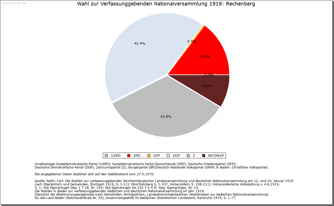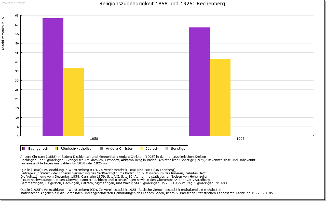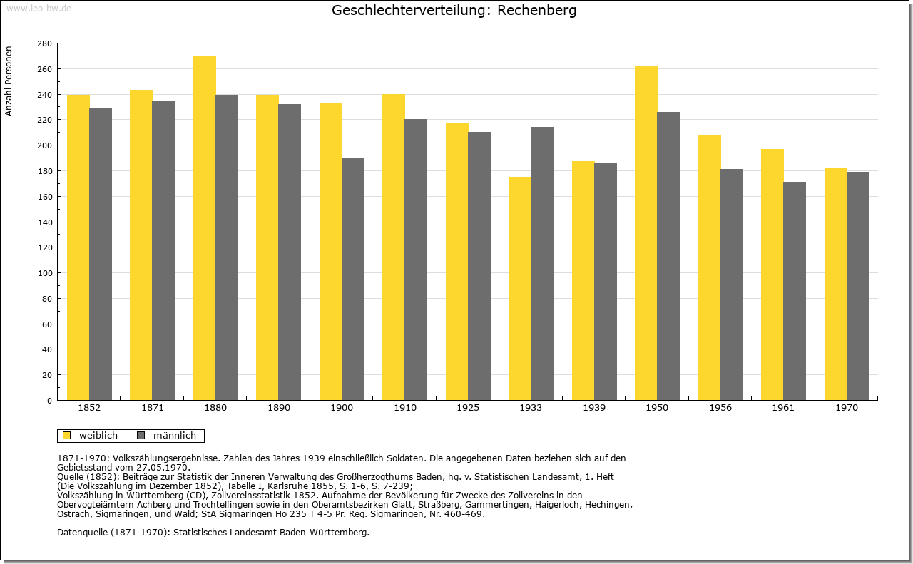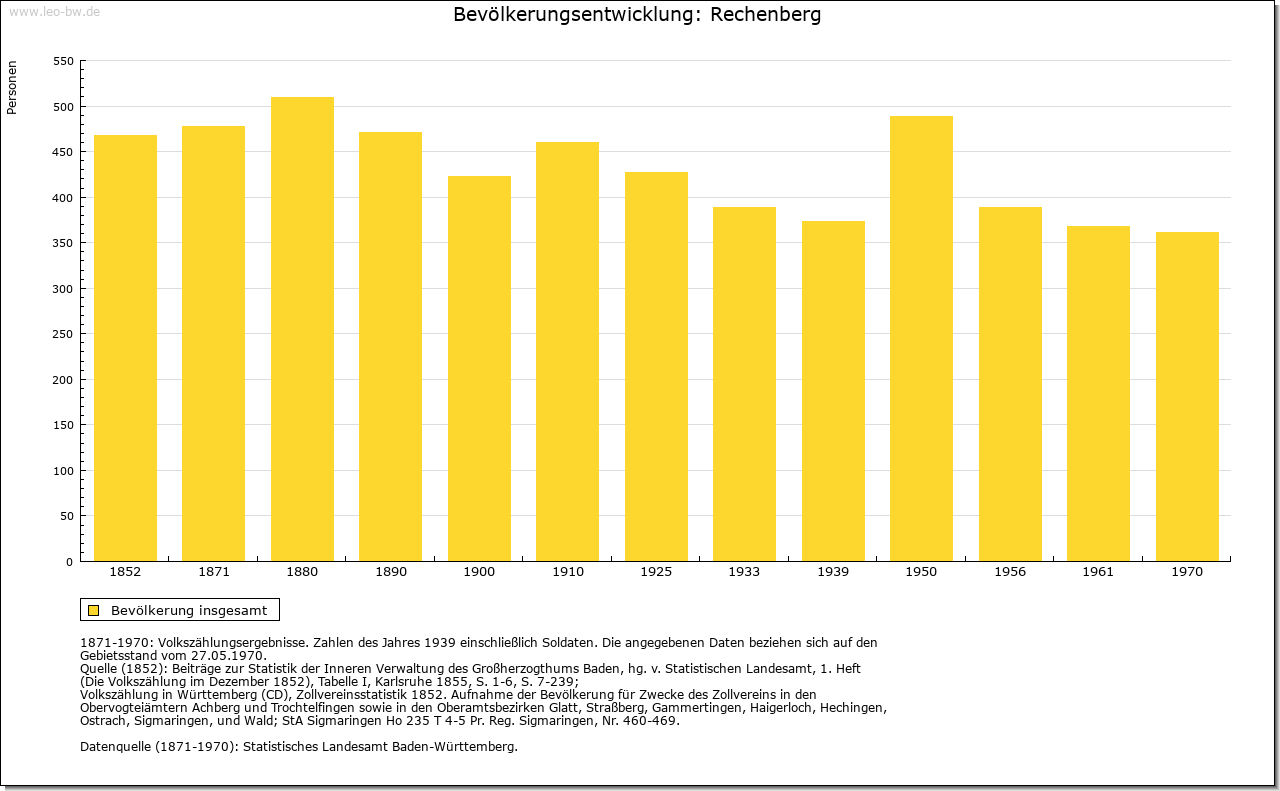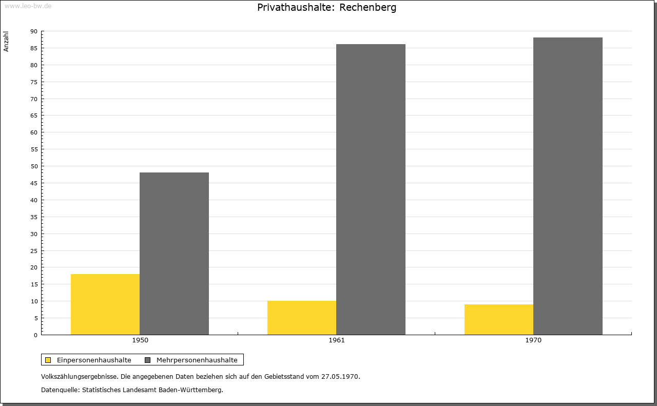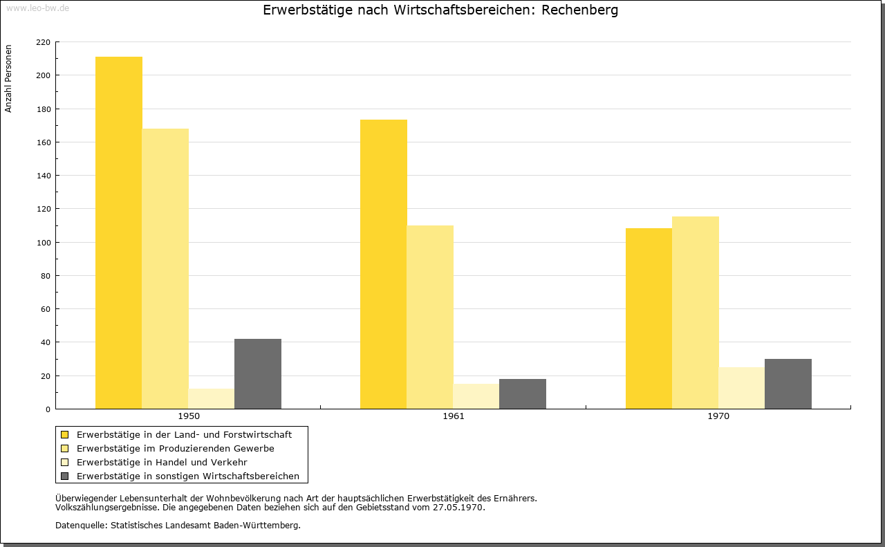 | Wirtschaft und Bevölkerung: | 1526 werden zu Rechenberg eine Schankstätte, eine Badestube, eine Hufschmiede, ein Eisenhammer und ein Gut des Müllers genannt. Zum Schlossbau gehörten 45 Tagwerk Wiesen und Gärten und 60 Morgen Ackerland, die mit den Frondiensten der Untertanen bewirtschaftet wurden. 1665 wurden je ein Zimmermann, Wirt, Schreiner, Hufschmied und Holzwart, 1759 je ein Schuhmacher, ein Müller und ein Wirt als Inhaber einer Taverne mit Braugerechtigkeit sowie je ein Bäcker, ein Tagelöhner und ein Schmied genannt, hinzu kamen zwei Schneider. Nur der Wirt (6 Morgen) und der Schmied (6 Morgen) besaßen 1759 Äcker in allen drei Feldern. Damals wurden insgesamt 13 Morgen Ackerland, 13 Tagwerk Wiesen und 3 Tagwerk Gärten, 46 Morgen gemeine Viehweide und 3 Morgen Gemeinholz zur Steuer veranlagt. 1807 hatte Rechenberg 162 Einwohner. Zu Connenweiler wurden Mitte des 18. Jahrhunderts ein Bauer, zwei Halbbauern, zwei Seldner und drei Häusler gezählt und an steuerbarer Nutzfläche 49 Morgen Ackerland, 29 Tagwerk Wiesen und 5 Tagwerk Gärten erfasst. 1759 gehörten zum Blindhof 6 Morgen Ackerland und 3 Tagwerk Wiesen, zum Klingenhof 22 Morgen Ackerland, 12 Tagwerk Wiesen und 3 Tagwerk Gärten. Mitte des 18. Jahrhunderts betrug die steuerbare Nutzfläche auf dem Bautzenhof (2 Halbbauern) 30 Morgen Ackerland, 19 Tagwerk Wiesen, 1 Tagwerk Gärten, 4 Tagwerk Viehweide, auf dem Eichishof (1 Halbbauer, 1759 erblehenbares Hofgut) 18 Morgen Ackerland, 9 Tagwerk Wiesen, 1 Tagwerk Gärten, 2 Morgen Holz und 3 Morgen Viehweide, auf dem Hübnershof (1 halber Hof, zinsbare Eigengüter) 30 Morgen Ackerland, 21 Tagwerk Wiesen, 1 Tagwerk Gärten und 8 Morgen Weide und zu Kressbronn (1 Bauer) 30 Morgen Ackerland, 12 Tagwerk Wiesen, 2 Tagwerk Garten, 1 Morgen Holz und 12 Morgen Viehweide. Die Höfe besaßen die Schäfereigerechtigkeit. 1807 wurden auf dem Bautzenhof 13, auf dem Eichishof 55, auf dem Hübnershof acht und zu Kressbronnn 15 Einwohner gezählt. Die nahe am Eichishof gelegene Sägemühle wird erst im 18. Jahrhundert erwähnt. In jüngster Zeit wurde die Mühlanlage abgebrochen. |