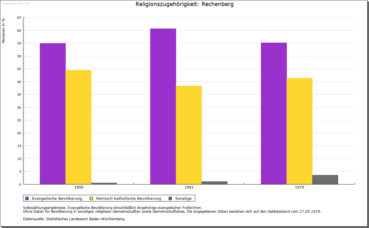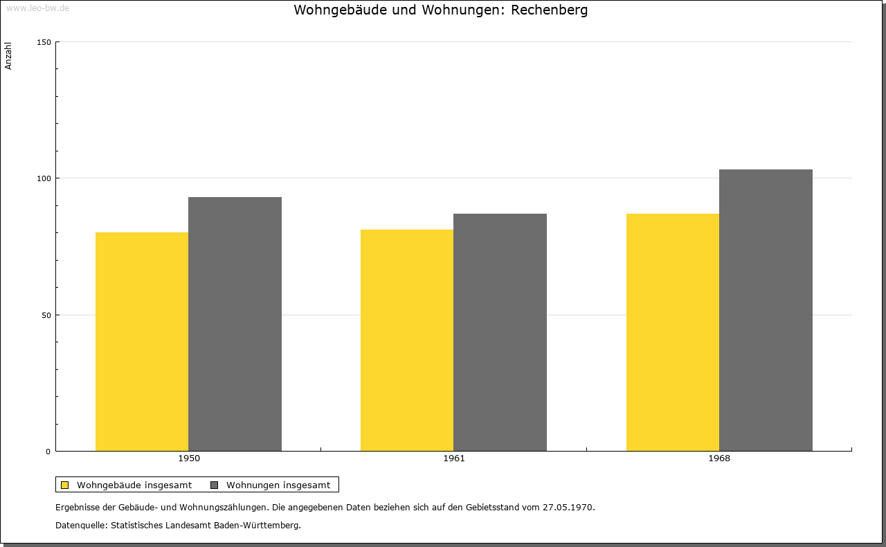 Ortslage und Siedlung (bis 1970): | Die nach den 1229 erstmals bezeugten Rittern genannte Siedlung (Personenname Recho) ist wohl während des hochmittelalterlichen Landesausbaus aus einer Ansiedlung um die Burg entstanden. 1759 wurden zwei Häuser mit getrenntem Stadel, zwei Häuser mit Stadel unter einem Dach, sechs Häuser und ein Hirtenhaus gezählt (1807: 44 Feuerstätten). Nördlich des Orts wurde 1300 die Siedlung Connenweiler als »Kuenewilere« (Personenname Kuono) erstmals erwähnt. 1732 waren fünf Häuser rechenbergisch, neun ellwangisch. Der nordöstlich von Rechenberg gelegene, nach einem Personennamen Blind oder nach einem Blindbach benannte Blindhof hieß 1409 Blendheim. 1429 und 1461 stand bei Connenweiler am Klingenbach der Hof zur Klingen (Klingenhof), der vor 1532 abgegangen ist. 1665 erscheint ein Klingenhof (wohl neu erbaut) im Gültbuch der Berlichingen unter Connenweiler, 1759 wurde ein Klingenhof bei der Steuerbeschreibung aufgeführt. Der Schummenhof auf dem Christfeld, 1461 Hof am Schummen, 1532 Harzholz am Schummen, ist abgegangen. Der nordnordöstlich von Rechenberg liegende Bautzenhof ist 1183 als »Pusonwilare« bezeugt. Der Weiler schrumpfte um 1400 zu einem Hof zusammen und ist 1461 als »Buzenhof« (Personenname Boso, Butzo) belegt. 1807 wurden zwei Feuerstätten gezählt. Der Eichishof wurde 1526/32 »Hof zum Aygen« (Eigengut) genannt und war entweder identisch mit dem Hof zum Langenberg oder er wurde nach dessen Abgang in seinem Bereich nordnordöstlich von Rechenberg errichtet. 1807 waren zehn Feuerstätten belegt. Der 1461 und 1532 nach der Familie Hübner benannte nördlich von Rechenberg gelegene Hübnershof (Waltrichsweiler) hieß 1400 noch »Waltenswiler« (Personenname Waltrich) und 1429 »Waltrichsweyler«, den man »Hubnershof« nannte. 1807 waren zwei Feuerstätten angelegt. Bis um 1700 schrumpfte das nördlich von Rechenberg liegende, 1409 erstmals erwähnte Vorder- und Hinter-Kressbronn zu einem Hof Kressbronn (Kresshof) zusammen. Der Ortsname bezeichnet vielleicht eine Quelle mit Kresse oder Krebsen. 1807 wurden hier zwei Feuerstätten gezählt. Rechenberg, Connenweiler und der Blindhof bildeten zusammen, die anderen Höfe jeweils für sich eine eigene Gemarkung. Die 1409 erstmals erwähnte Blindmühle, die 1807 Eulenmühle genannt wird, gehört heute zu Jagstzell. Aus locker gereihten Häusergruppen, teils auf der Hochfläche an der Straße nach Connenweiler, teils am linken Hang des Rotbachtals um Schloß und Kirche, setzt sich der Ort Rechenberg zusammen (oberhalb davon ist der Bach zu einem Weiher aufgestaut). Mit Errichtung der Neubausiedlung an der Landesstraße 1068 wurde 1962 begonnen, mit der in Connenweiler 1960. |