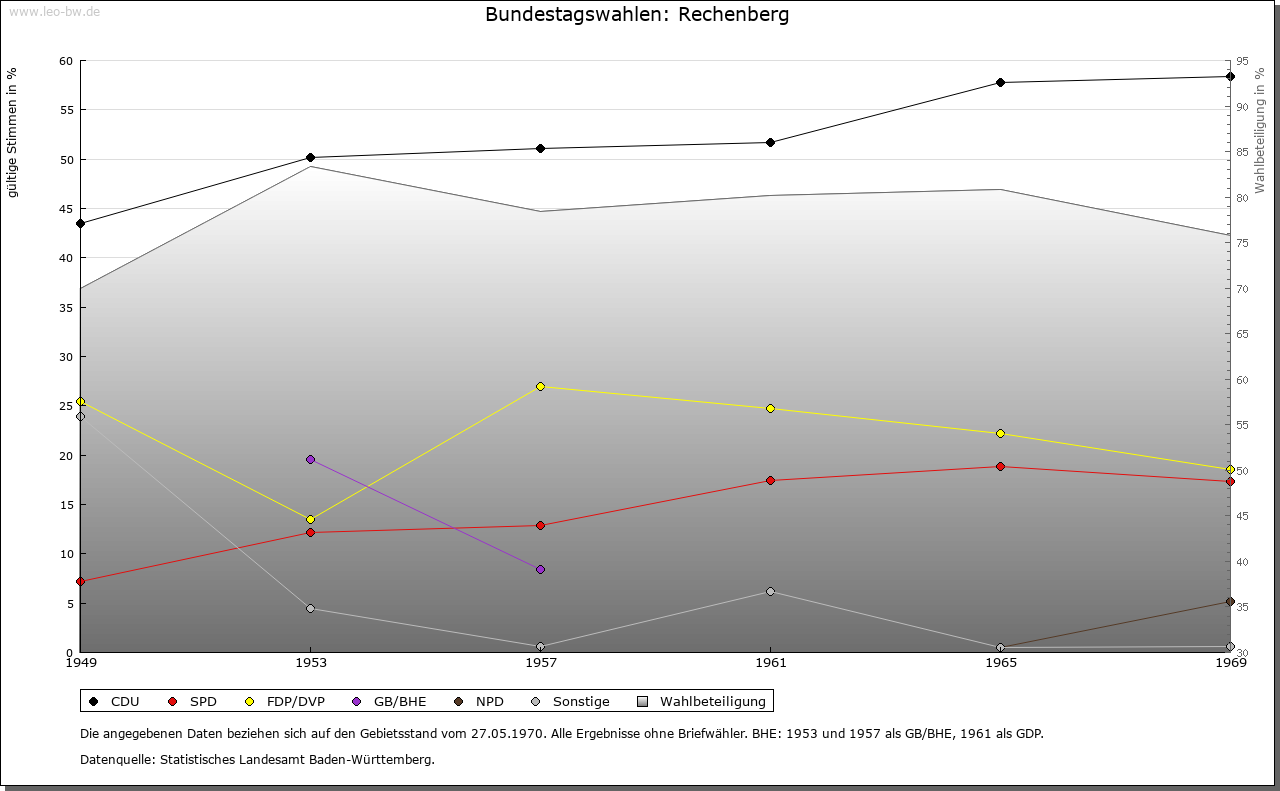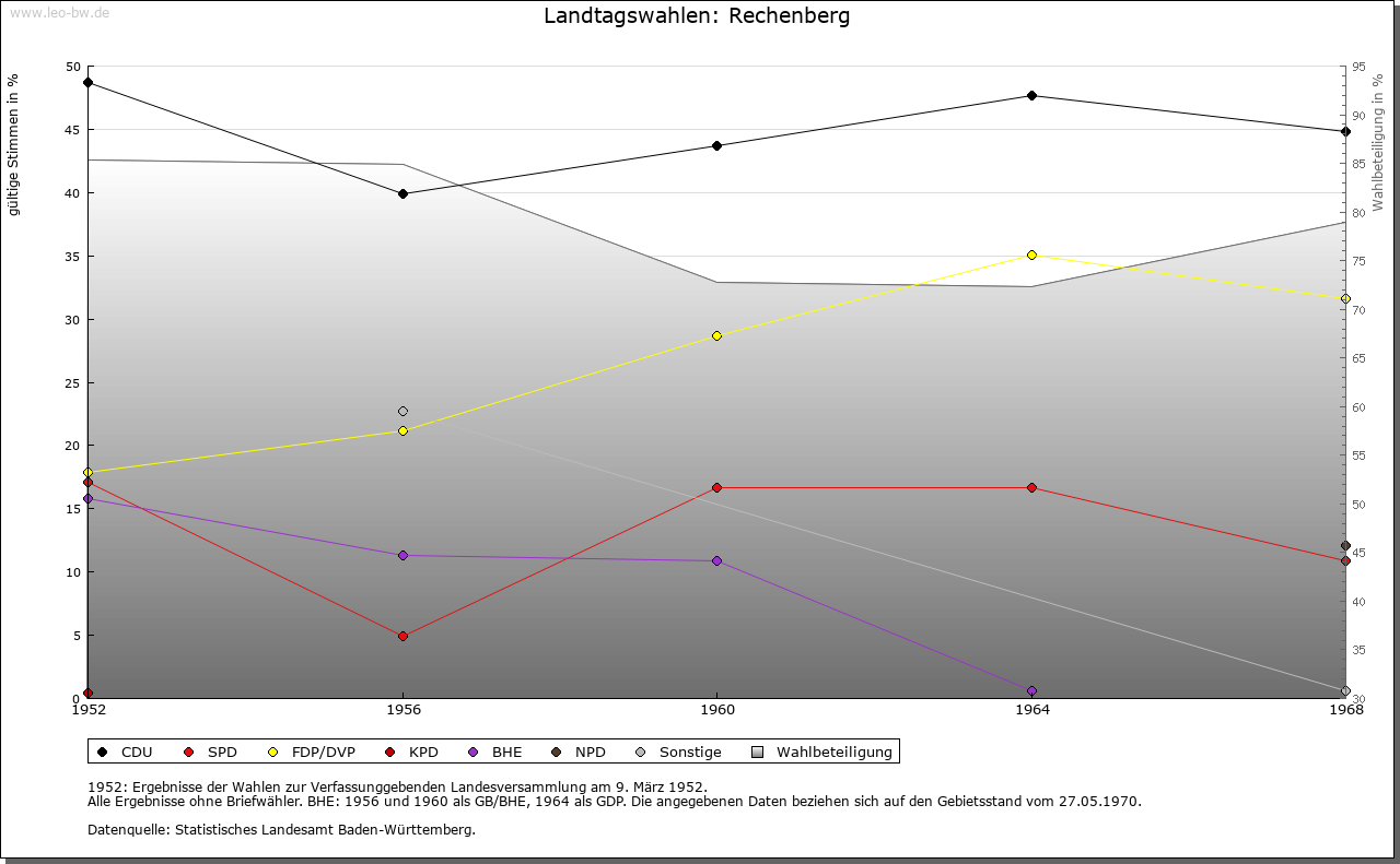 | Geschichte: | Der Ort war Zubehör der gleichnamigen Herrschaft und teilt damit ihre Geschichte. Die 1229 erstmals erwähnten Ritter von Rechenberg sind bis 1405 als Dienstmannen und Truchsessen der Grafen von Oettingen bezeugt. Sie saßen auf den Burgen Wilburgstetten, Rechenberg bei Hohentrüdingen und Rechenberg. Ihre Stammburg ist noch nicht ermittelt. 1368 belehnte Ellwangen drei Brüder Truchsessen von Wilburgstetten mit Rechenberg samt Zubehör. 1401 erhielt Erkinger von Rechenberg »Nuewenrechenberg« zu Lehen. Vier Jahre später wurde der Ort als ellwangisches Lehen an die Burggrafen von Nürnberg veräußert, die Rechenberg 1409 an die Herren von Wollmershausen verkauften, welche 1429 von Ellwangen mit der Herrschaft Rechenberg belehnt wurden. Zwischen 1460 und 1480 ging die Herrschaft an die Adelmann von Adelmannsfelden über und wurde 1526 von Ellwangen zurückerworben. 1532 wurde ein Teil als Freieigen, ein anderer Teil als ellwangisches Lehen an die Steinhäuser von Neidenfels veräußert. Letzterer fiel 1608 an Ellwangen zurück. Das Eigengut gelangte 1617 an die Crailsheim, welche es im gleichen Jahr an die Berlichingen zu Neunstetten käuflich abtraten. Der Grundbesitz der Berlichingen umfasste 1665 insgesamt zwölf Güter (10 Selden/Häuslein und Erblehen, je 1 erblehenbare Badestube und Schankstätte). Das Schloss besteht aus einer zweiflügeligen Anlage. Der alte Teil wurde im 16. Jahrhundert umgebaut und mit einem Fachwerkaufsatz versehen; der neue Bau wurde von Heinrich Steinhäuser 1571 im Anschluss an den Torbau mit Achtecktürmchen und Durchfahrt errichtet. Er wurde 1926 erneuert. Rechenberg war dem Ritterkanton Kocher inkorporiert, der die Steuer- und Wehrhoheit ausübte. Die Hochgerichtsbarkeit hatte zunächst Ellwangen inne; später wurde sie dann von Ansbach beansprucht. 1538 wurden die Steinhäuser vom Kaiser mit dem Blutbann belehnt, was von Ansbach angefochten wurde. Als Ellwangen und Ansbach 1750 ihre gegenseitigen Grenzen festlegten, fiel der Ort in das Ansbacher Gebiet. Erst Preußen konnte 1796 die Landeshoheit durchsetzen. Rechenberg fiel 1806 an Bayern und 1810 an Württemberg (Oberamt Crailsheim). Die Untertanen unterstanden der Rechenberger Vogtei, Gerichtsbarkeit und Verwaltung. Zur Herrschaft Rechenberg gehörte der Blindhof, das ellwangische Lehen Connenweiler, das 1608 teilweise wieder an die Propstei zurückfiel, der Eichishof, der Bautzenhof, der sich 1183 im Besitz des Augsburger Stifts Sankt Moritz befand und dann über Ellwangen zu Rechenberg gelangte, der Hübnershof und der Hof Kressbronn. Vor 1400 wurden Hinterkressbronn und 1429 Vorderkressbronn zur Burg Rechenberg erworben. Rechenberg und Connenweiler bildeten gemeinsam eine Gemeinde. Rechenberg gehörte zum Oberamt (ab 1938 Landkreis) Crailsheim. Zählte bis 1825 zur Gemeinde Weipertshofen. |