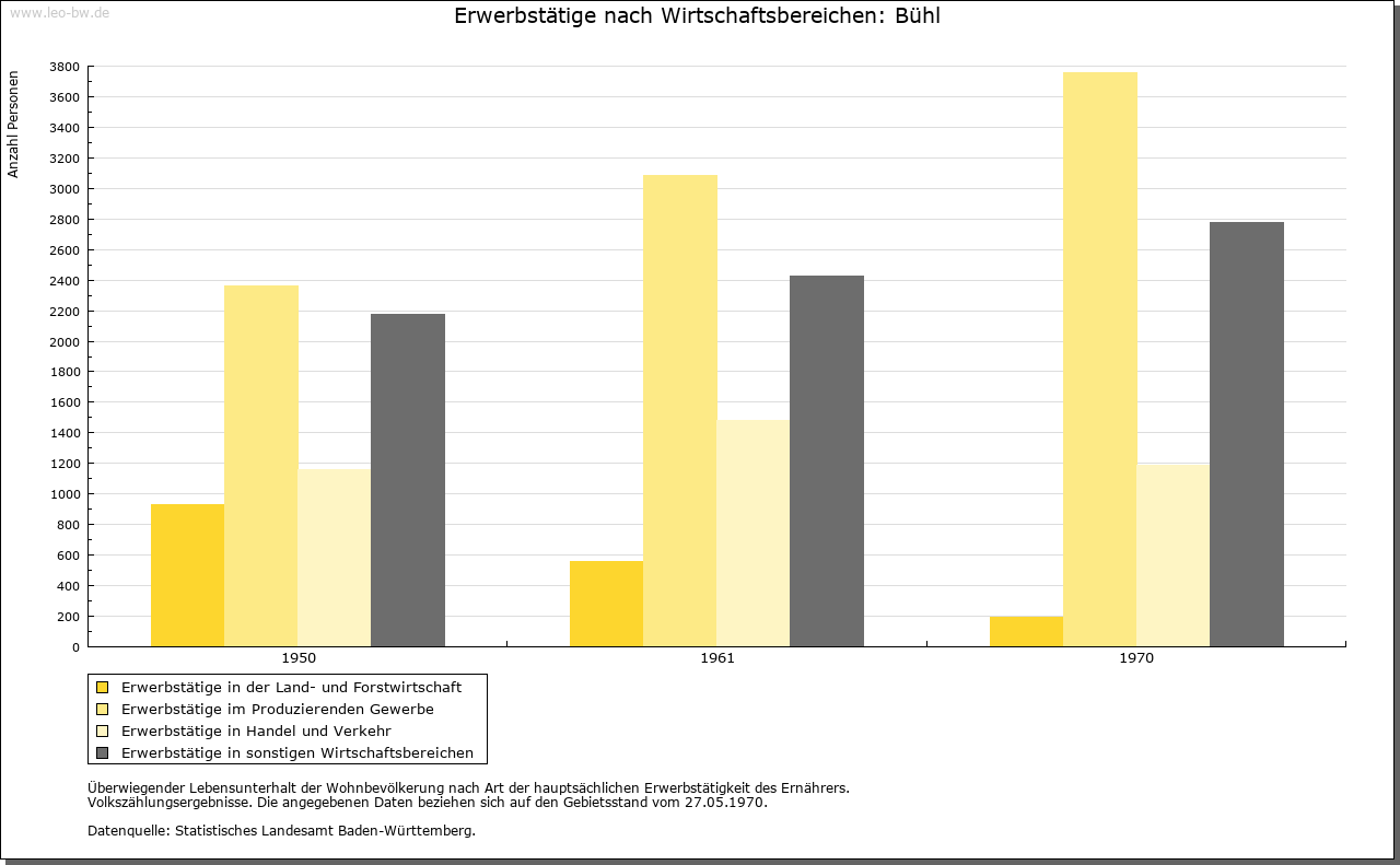 | Ortslage und Siedlung (bis 1970): | Kern der städtischen Siedlung alter Marktflecken, unmittelbar vor dem Hangfuß der Vorberge auf dem Schwemmfächer der Bühlott gelegen, mit der breiten Nord-Süd verlaufenden Hauptstraße (Straßenmarkt, B 3) als Leitlinie, von der Seitenstraßen versetzt nach Osten und Westen abgehen. Erweiterungen des 19. und frühen 20. Jahrhunderts ziehen linienhaft nach Osten hangauf und flächig mit rechtwinkligem Straßennetz nach Westen zum Bahnhof. Einzelhausbebauung überwiegt vor Blockbebauung. Im Süden und Westen entstanden nach dem Krieg größere geschlossene Wohngebiete, auch mit Wohnblöcken, auf teilweise schematischem Grundriss sowie zwei Industriegebiete westlich der Bahnlinie. An den Hängen der Vorberge im Osten hat sich lockere, z. T. villenartige Bebauung ausgebreitet, die die früh eingemeindeten Dörfer und Weiler von Kappelwindeck bis Riegel einbegreift. |