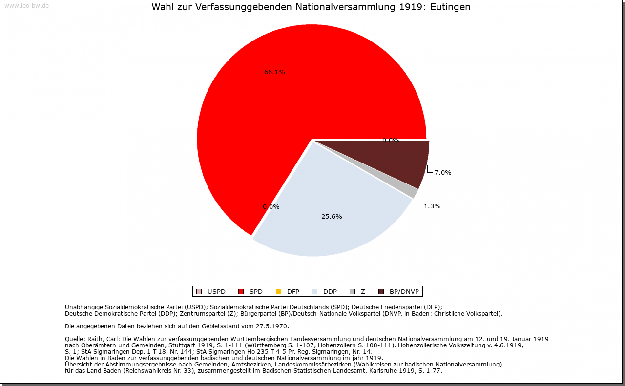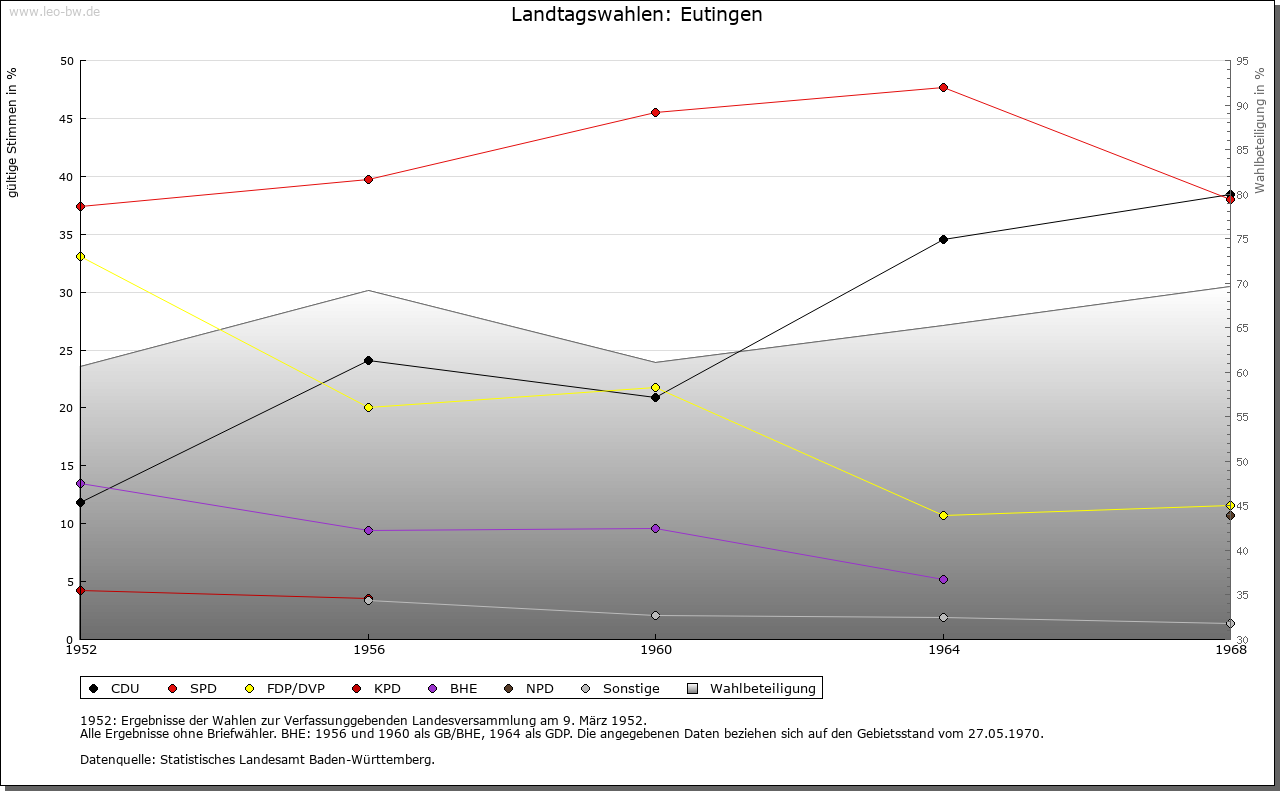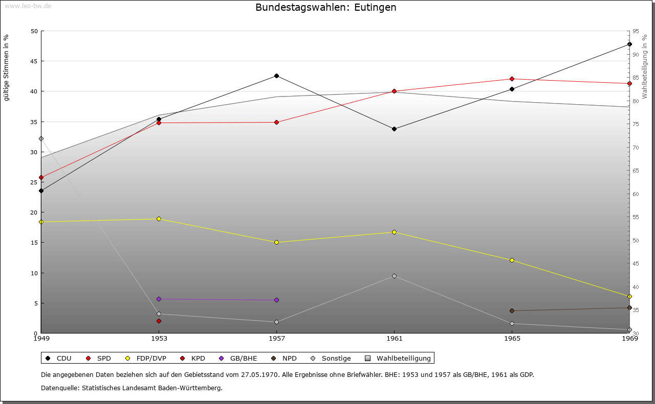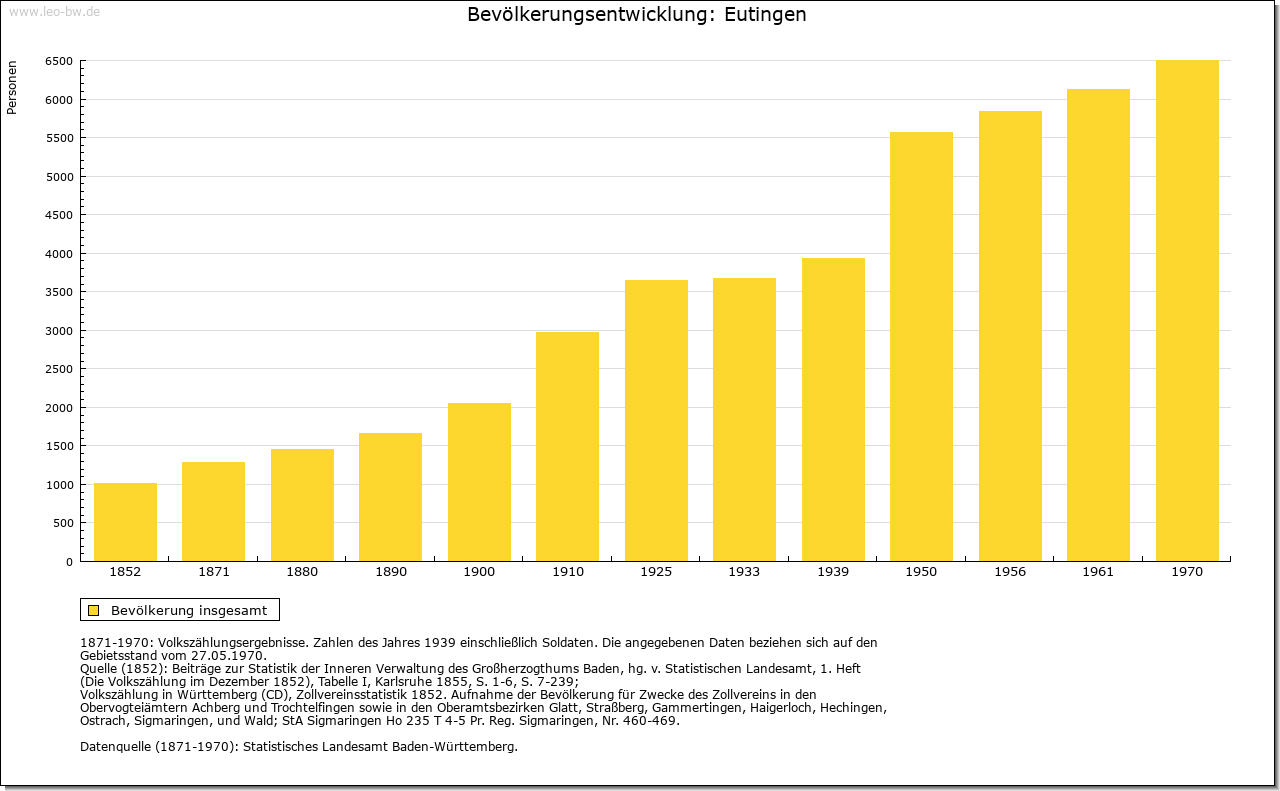 | Geschichte: | 1143 Utingen, vom Personennamen Uto. Eutingen war um 1153 Sitz der Reichsministerialen von Udingen. In der 2. Hälfte des 13. Jahrhunderts besaßen die Herren von Roßwag das Dorf, die es aber an Reinhard und Günther von Pforzheim verkauften, über deren Erben es 1434 und in den Folgejahren zum größten Teil an die Pforzheimer Dominikanerinnen gelangte. Über dieses bestand bereits die Oberhoheit des badischen Markgrafen. Nach Aufhebung des Klosters fiel die Ortsherrschaft 1564 ganz in badische Hände. Pforzheim war stets zuständiger Amtssitz. 1929 erhielt die Gemeinde einen Teil des Hagenschießwaldes. |