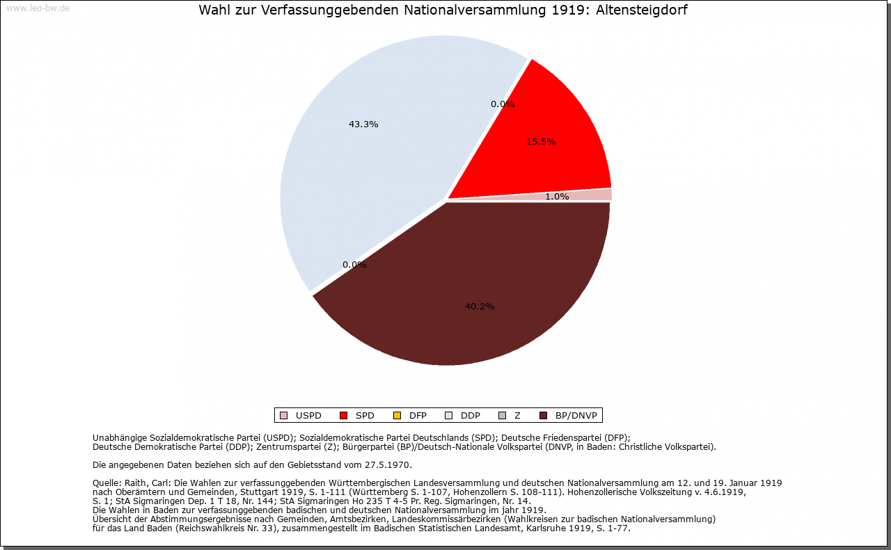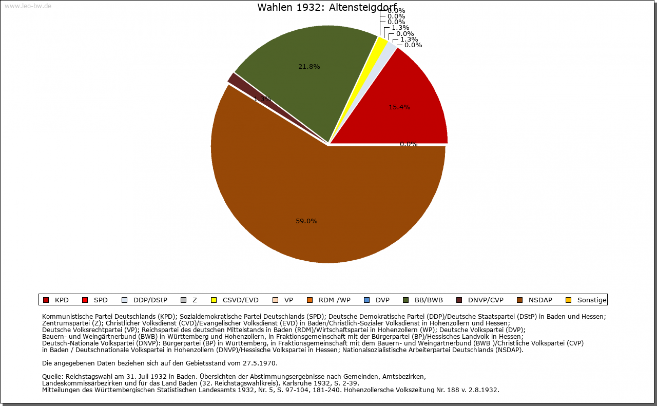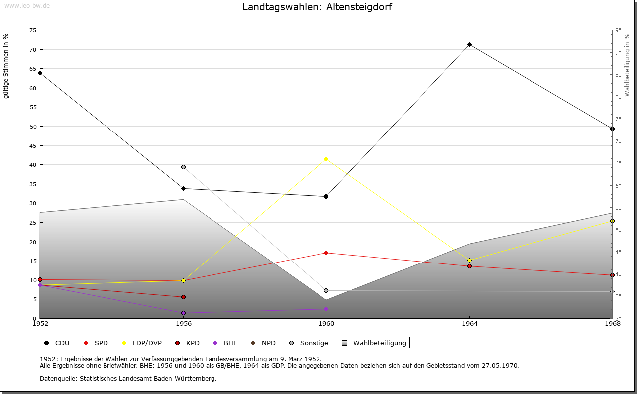 | Geschichte: | Der Ort mit der Burg um 1100 erstbezeugt. Die bäuerliche Siedlung dürfte wohl noch dem 10. Jahrhundert angehören. Sie war Mittelpunkt eines Rodungskirchspiels und einer Waldgenossenschaft, die bis über das obere Enztal hinweg an die Grenzen des Murgschifferschaftswaldes reichten. Bis 1603 stand die Waldgenossenschaft unter badischem und württembergischem, seither ausschließlich unter württembergischem Schirm und wurde 1830 aufgelöst. Das Dorf Altensteigdorf ist wohl von Nagold her angelegt, woraus sich die Ursprünge der Herrschaft über Burg und Stadt erklären. Mit dem Dorf waren zum Teil die Vögte von Altensteig, zum Teil die Herren von Berneck belehnt, ihre Nachfolger, die von Gültlingen, verkauften es ab 1390 an Baden. 1940 wurde das Dorf in die Stadt eingemeindet, 1949 wieder selbständig. |
