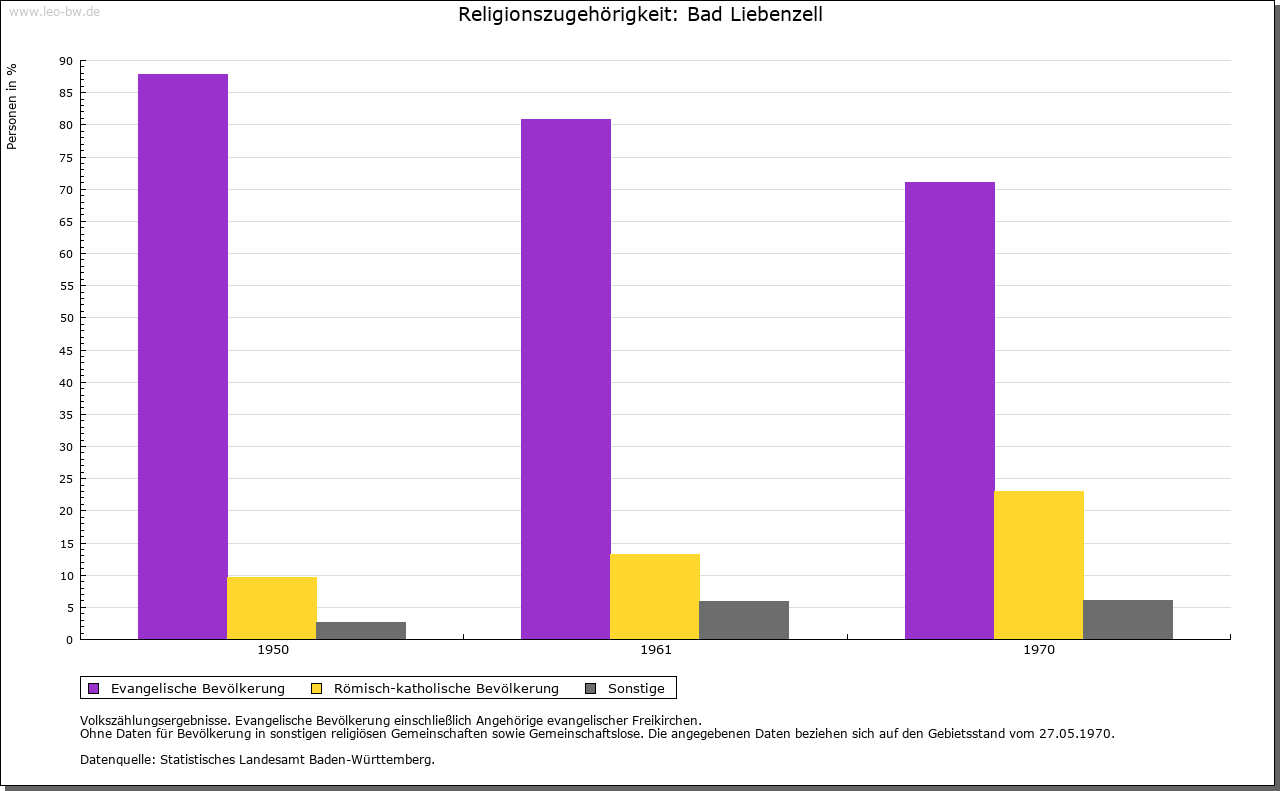 | Kirche und Schule: | Die Kirche, schon in der Schenkung Utas an Hirsau erwähnt, steht außerhalb der Stadtfläche, wie überhaupt die ältere Besiedlung großenteils nicht in die Stadt einbezogen wurde. Patrozinium St. Blasius (1423). Das Patronat trat Hirsau nach der Reformation von 1556 an Baden ab, von 1603 an war es württembergisch. Der alte Pfarrsprengel, vielleicht selbst ursprünglich von Möttlingen abhängig, aber wohl noch im Hochmittelalter selbständig, reichte bis Monakam, Dennjächt, Unterreichenbach, Bieselsberg, Schwarzenberg, Schömberg, Höfen, Calmbach, Wildbad, Igelsloch, Unterkollbach und Ernstmühl. Zur evangelischen Pfarrei gehört heute lediglich die Stadt. Die Kirche hat noch einen frühgotischen Chor, einen spätromanischen Turm und ist sonst ein Bau von 1891. Seit 1902 ist Liebenzell Sitz einer evangelischen Missionsgesellschaft. Seit 1963 katholische Pfarrei St. Lioba mit Kirche von 1961, auf unregelmäßigem polygonalem Grundriß mit tief heruntergezogenem Satteldach und Dachreiter. Zum Pfarrsprengel gehören Beinberg, Bieselsberg, Hirsau, Kapfenhardt, Möttlingen, Monakam, Ottenbronn, Unterhaugstett, Unterlengenhardt und Unterreichenbach. |