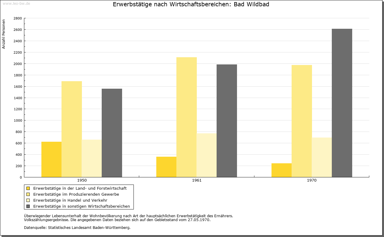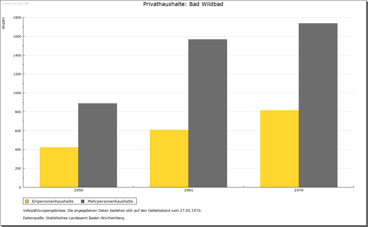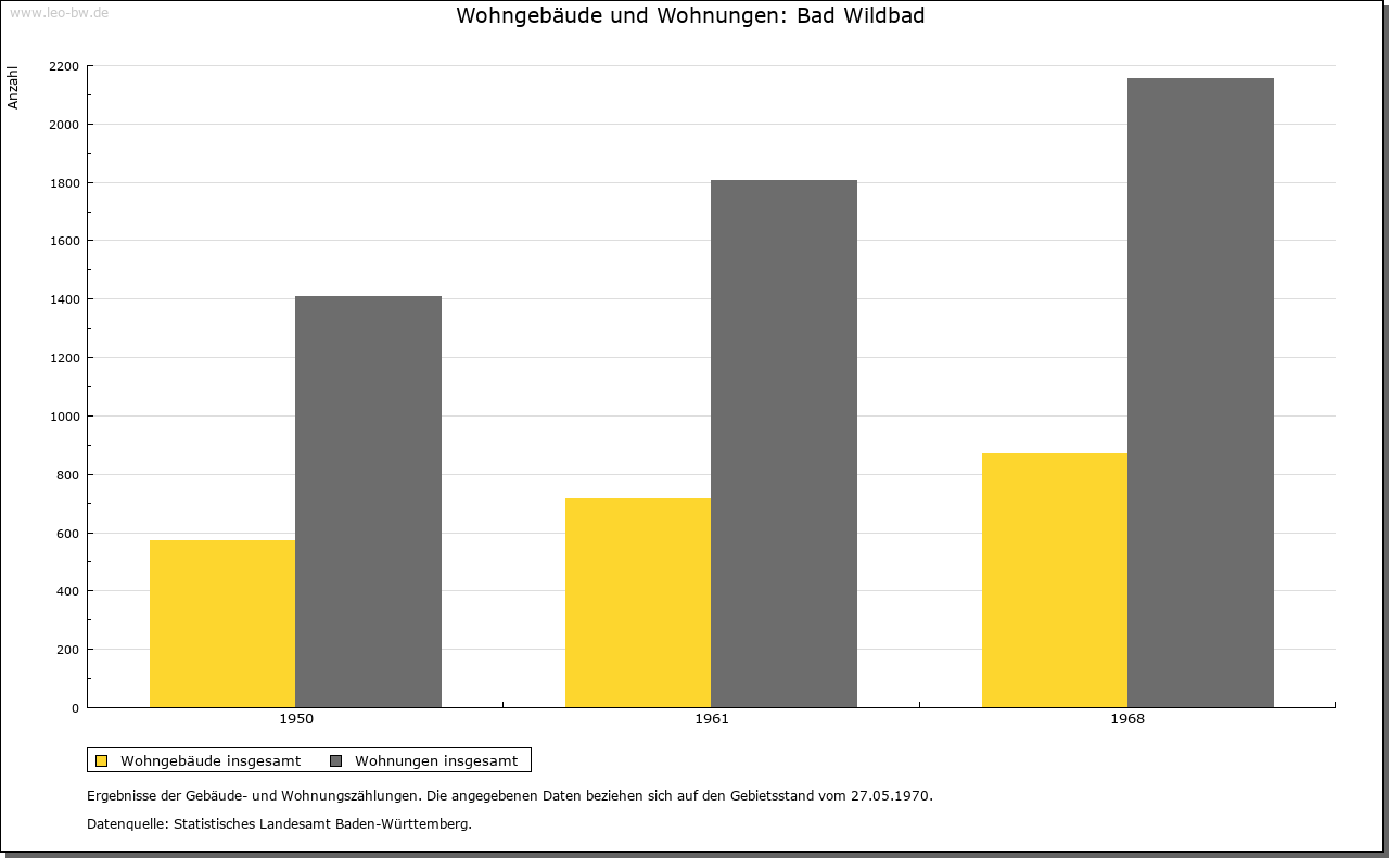 | Ortslage und Siedlung (bis 1970): | Der dicht bebaute, weitgehend durch hohe Gebäude aus der Zeit vor dem 1. Weltkrieg bestimmte Stadtkern des Heilbades ist mit seinem engen Gittergrundriß der Straßen dem schmalen Tal der Enz angepaßt. Jüngere Stadterweiterungen finden sich im Norden mit dem Bahnhofsviertel und talabwärts mit Anlagen der Stadtwerke und Gewerbebetrieben auf dem Talboden. Auch oberhalb des Stadtkerns und der im Süden teils im Tal, teils am linken Hang des Enztals anschließenden Kuranlagen setzte die heute bis zum Windhof reichende geschlossene Bebauung noch vor dem 2. Weltkrieg ein, wenn auch die Mehrzahl der Häuser an beiden Talhängen aus der Nachkriegszeit stammt. Eine bereits ältere Stadterweiterung liegt im westlichen Seitental des Rennbächles, Neubauten überziehen den rechten Talhang oberhalb des Stadtkerns. Individuell gestaltete Ein- und Mehrfamilienhäuser, zum Teil in steiler Hanglage, bestimmen das Bild dieser jüngsten Stadterweiterungen. |