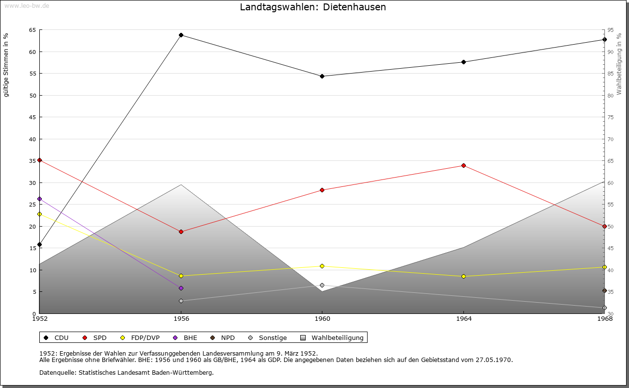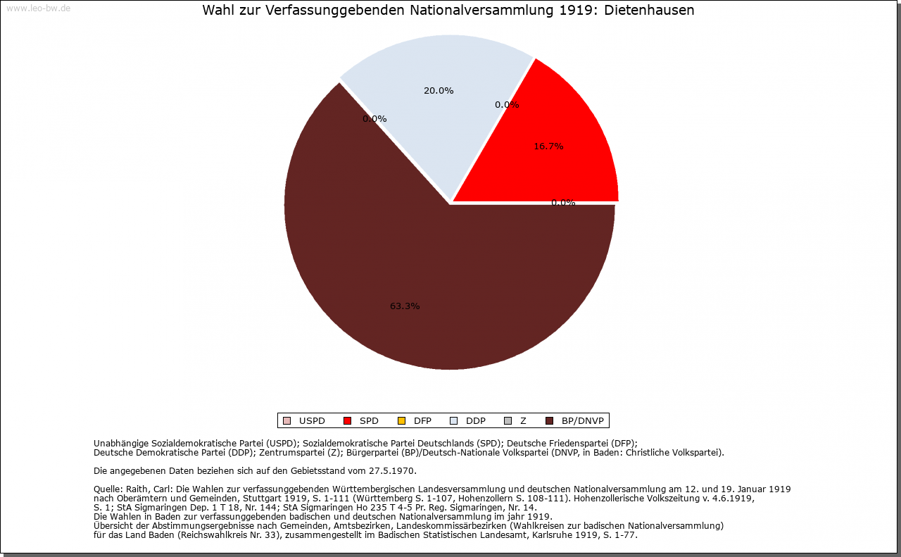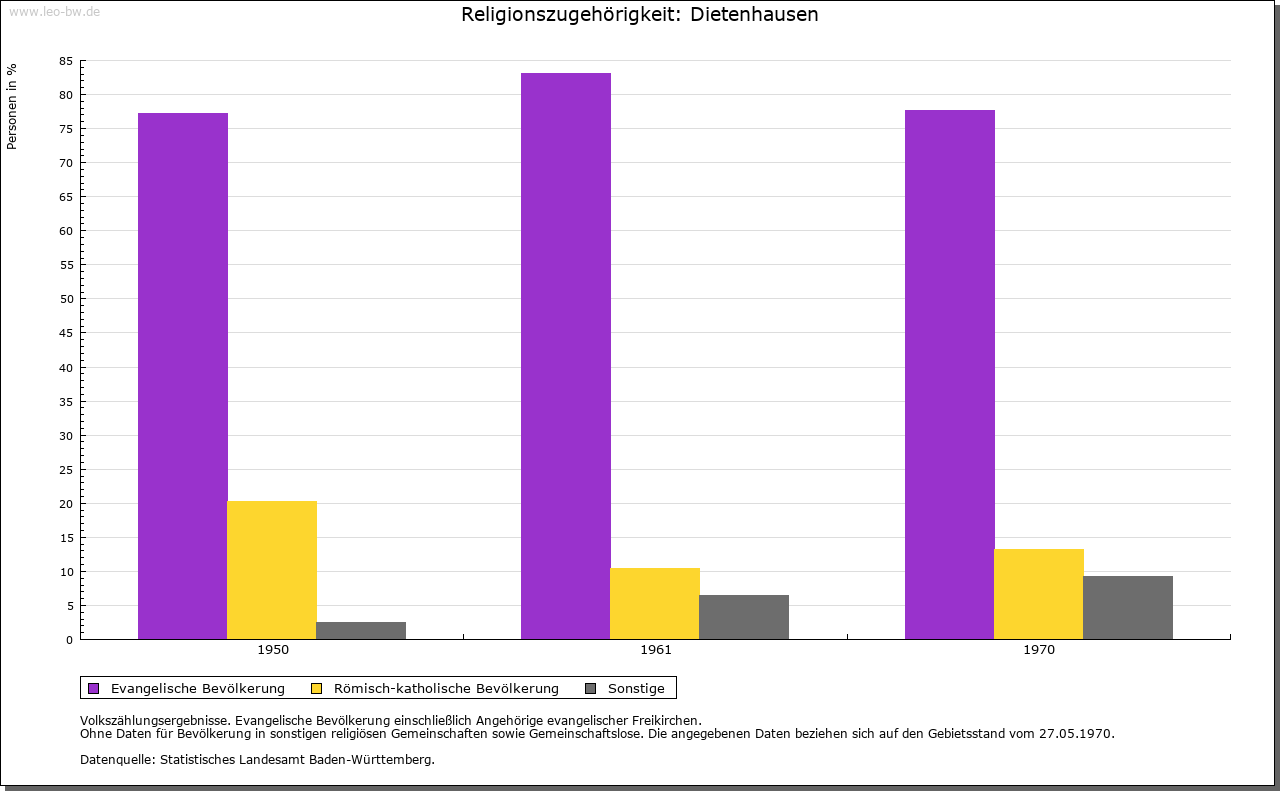 | Geschichte: | 919/34 (Chronik 16. Jahrhundert) Theotelenhusen, vielleicht vom in der Familie Notings vorkommenden Personennamens Theodelinde. Ausbauort von Ellmendingen her, wie dort Schenkungen Bischof Notings an die Reichenau. Um 1100 Sinsheimer Besitz und eventuell im frühen 12. Jahrhundert auch solcher des Kloster Odenheim, also von den Kraichgaugrafen herrührend. 1216 Grangie des Kloster Herrenalb. Dessen Besitz durch die Grafen von Vaihingen vom Vogtsrecht befreit, bald mit Pächtern besetzt und vor 1268 in Huben aufgeteilt. 1332 Besitz und Rechte in Dietenhausen katzenelnbogisches Lehen für die Junker von Enzberg. 1335 die Dorfherrschaft von Baden an Eberstein verpfändet. 1497 unter den badischen Schirmdörfern des Kloster Herrenalb. 1536 durch die Reformation die Ortsherrschaft an Württemberg, 1603 an Baden abgetreten, Amt Langensteinbach, dann Stein. Seit 1803 Pforzheim Sitz der zuständigen Bezirksverwaltung. |