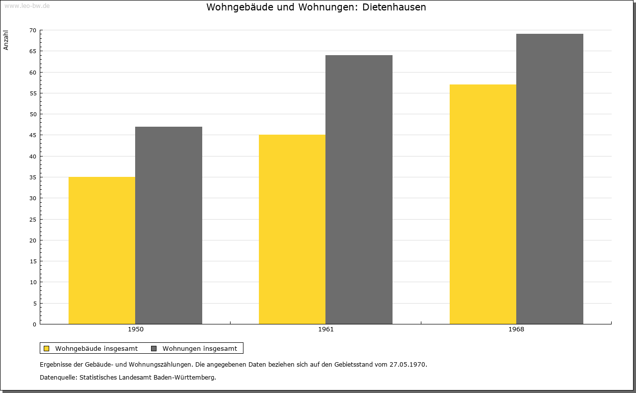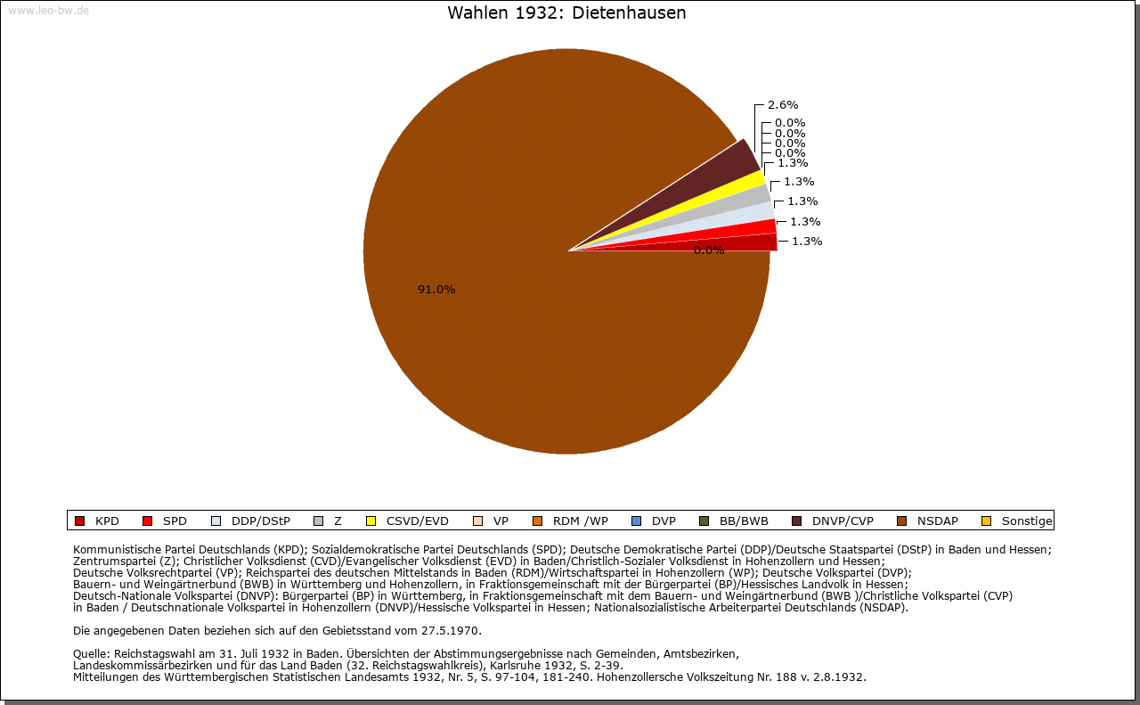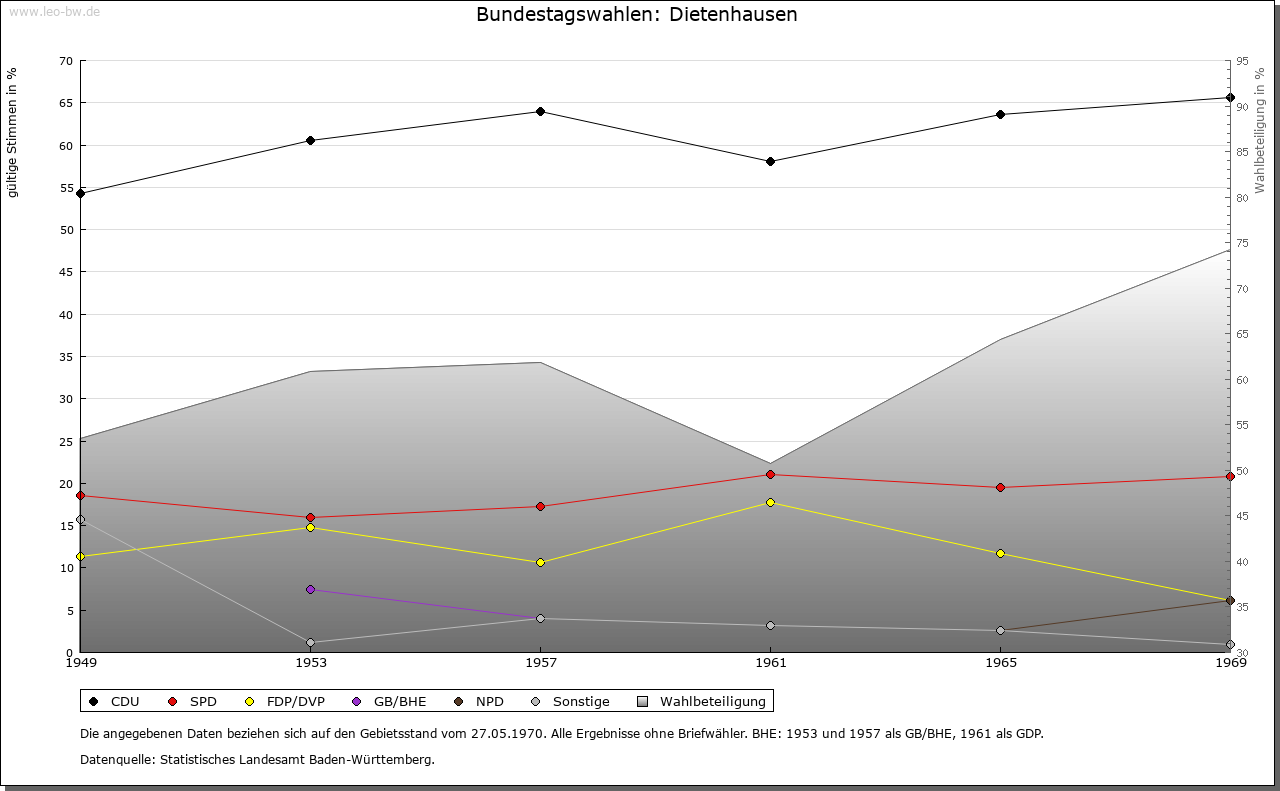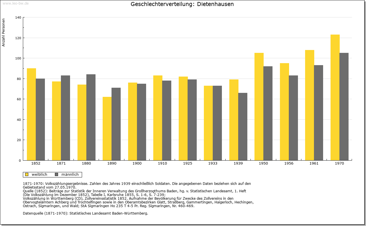 | Geschichte: | 919/34 (Chronik 16. Jahrhundert) Theotelenhusen, vielleicht vom in der Familie Notings vorkommenden Personennamens Theodelinde. Ausbauort von Ellmendingen her, wie dort Schenkungen Bischof Notings an die Reichenau. Um 1100 Sinsheimer Besitz und eventuell im frühen 12. Jahrhundert auch solcher des Kloster Odenheim, also von den Kraichgaugrafen herrührend. 1216 Grangie des Kloster Herrenalb. Dessen Besitz durch die Grafen von Vaihingen vom Vogtsrecht befreit, bald mit Pächtern besetzt und vor 1268 in Huben aufgeteilt. 1332 Besitz und Rechte in Dietenhausen katzenelnbogisches Lehen für die Junker von Enzberg. 1335 die Dorfherrschaft von Baden an Eberstein verpfändet. 1497 unter den badischen Schirmdörfern des Kloster Herrenalb. 1536 durch die Reformation die Ortsherrschaft an Württemberg, 1603 an Baden abgetreten, Amt Langensteinbach, dann Stein. Seit 1803 Pforzheim Sitz der zuständigen Bezirksverwaltung. |