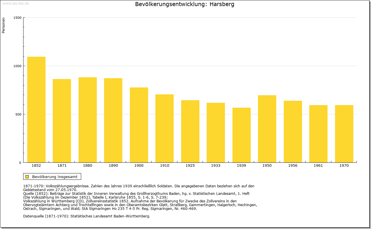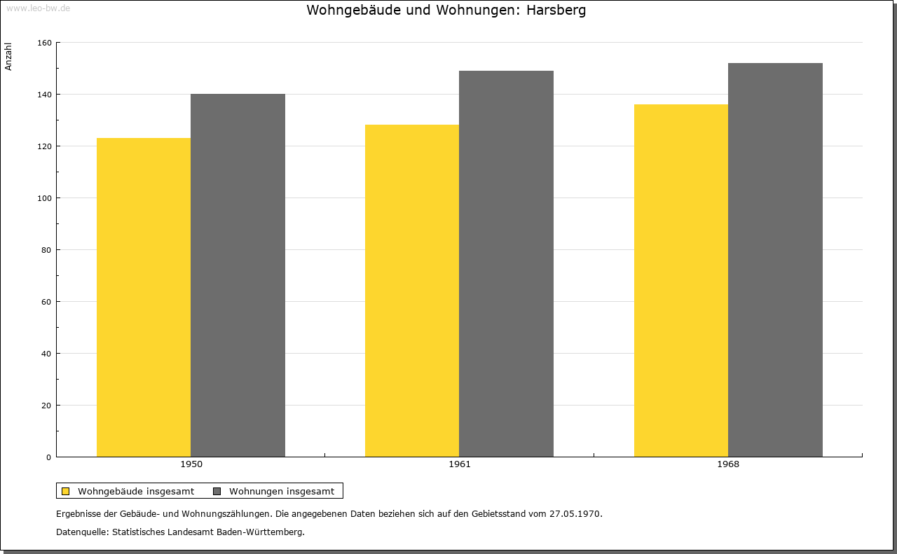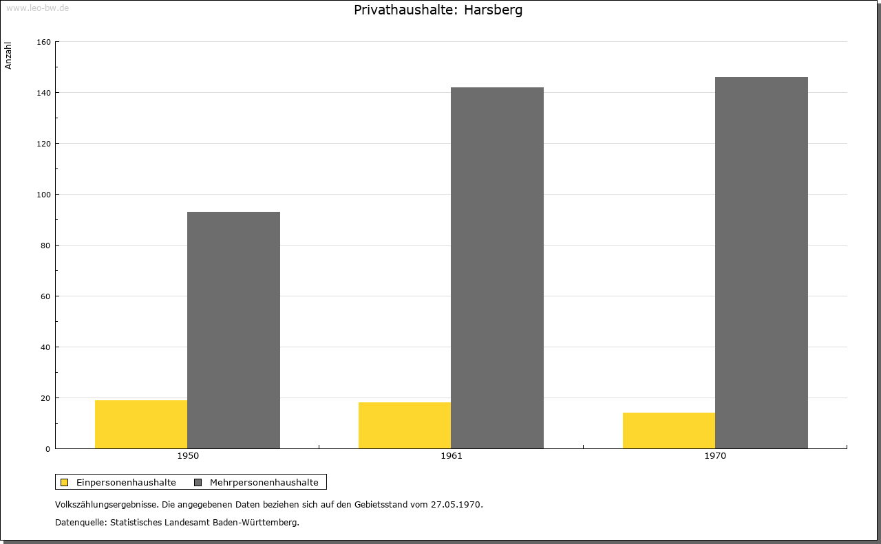 Ortslage und Siedlung (bis 1970): | Der aus einer Ansammlung von vielen Wohnplätzen bestehende Ort ist wohl erst im Zuge des Landesausbaus am Übergang vom hohen zum späten Mittelalter entstanden; darauf deuten nicht allein die Namen der verschiedenen Höfe und Weiler hin, sondern auch deren Siedlungsstruktur. Der heutige Hauptort findet nicht vor 1329 Erwähnung (»Hoersberg«); sein Name bezieht sich vielleicht auf den Anbau von Flachs (mittelhochdeutsch »har«). Über die Gemarkung verlief in römischer Zeit der Obergermanische Limes, mitten durch das heutige Baierbach und westlich vorbei an Unter- beziehungsweise Oberhöfen, Harsberg und Renzen; die letzten Reste wurden bereits vor längerer Zeit im Zuge von Straßenbauarbeiten beseitigt. Von den verschiedenen Ortsteilen finden Ober- und Unterhöfen bereits 1314 Erwähnung (»zu den Höfen«, 1365 »Obernhöfen«, 1410 »Undernhofen«), Rohrmühle 1329, Baierbach 1362, Renzen beziehungsweise Altrenzen 1366 (»Reintze in der Oren«), Heuholz 1416 und Beingasse 1417 (»zu der Baumgassen«). Die Höfe Braunenberg, Eichhornshof (1680 »Aychern«), Gänsberg (1796 »Gänshof«), Hasenberg (1680 »Heslach«), Herbenberg, Schmidshof und Strohberg scheinen einer frühneuzeitlichen Ausbauphase anzugehören. Schon seit längerem wüstgefallen sind die Wohnplätze Beckinger Hof und Weihen. Der eine ist zwischen 1384 (genannt »Bokinger«) und 1680 bezeugt und lag vermutlich unmittelbar im Südwesten von Harsberg, der andere begegnet in den Quellen von 1410 (»zum Wehen«) bis ins späte 17. Jahrhundert und ist wohl bei Altrenzen zu suchen. Im Jahr 1680 hatten die größeren Ortsteile folgende Umfänge: Harsberg 17 Häuser, 13 Scheunen; Baierbach 18 Häuser, 11 Scheunen; Heuholz 7 Häuser, 5 Scheunen; Oberhöfen und Beingasse 19 Häuser, 11 Scheunen; Renzen 18 Häuser und 17 Scheunen. |