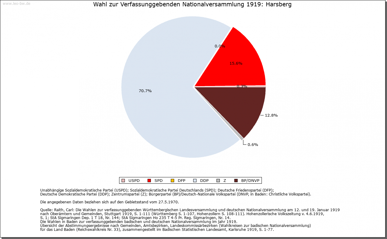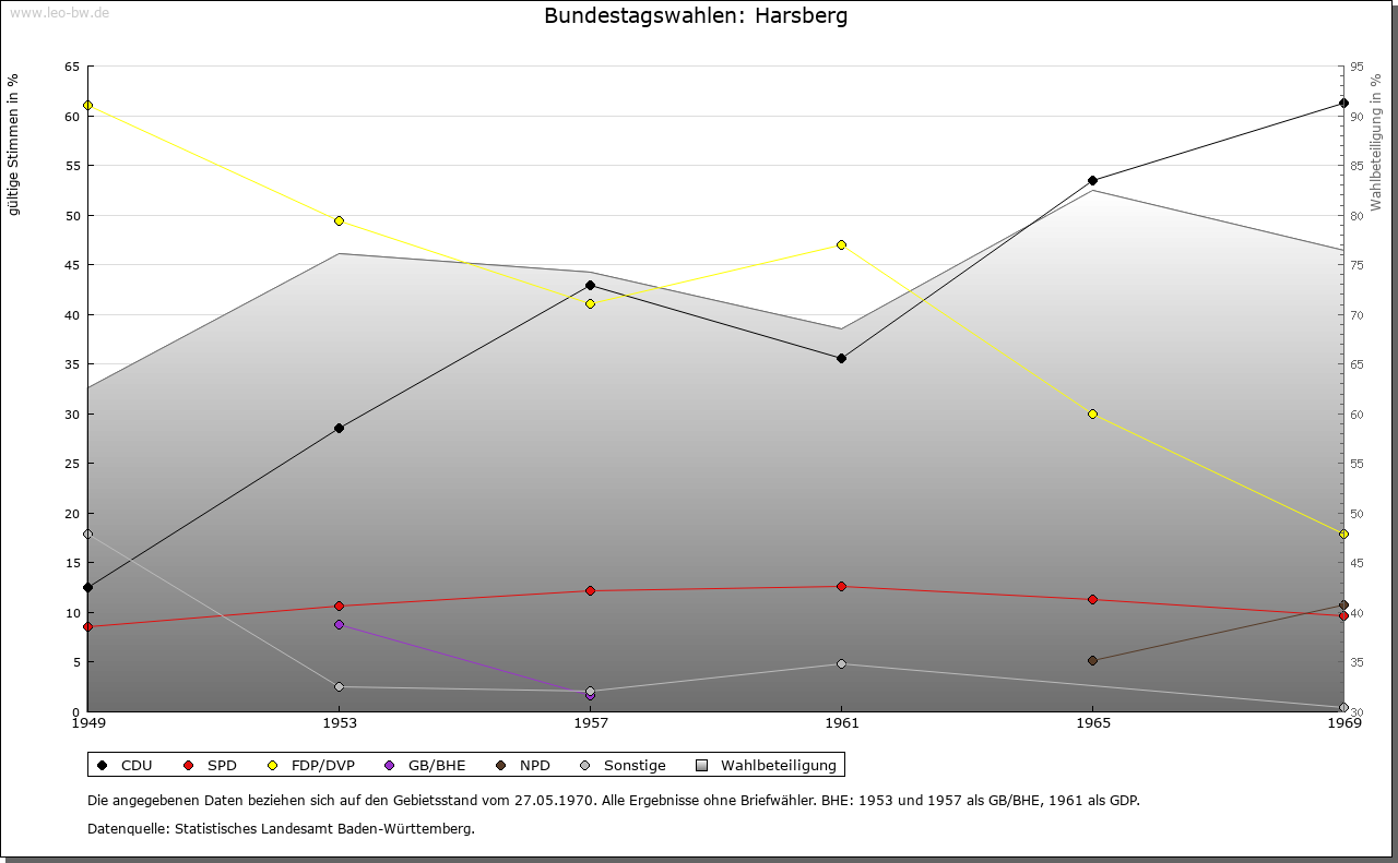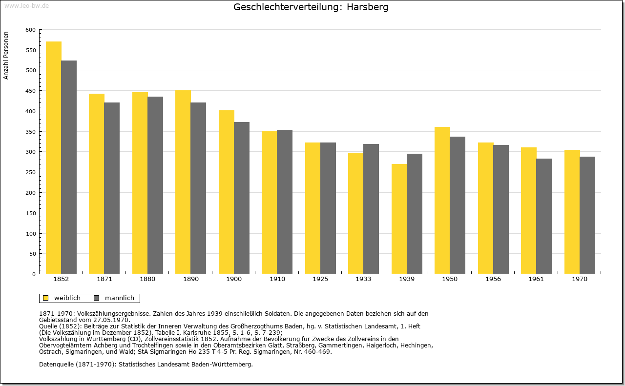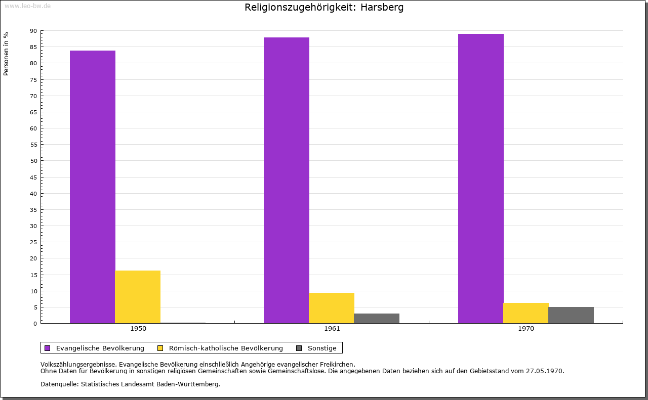 Ortslage und Siedlung (bis 1970): | Der aus einer Ansammlung von vielen Wohnplätzen bestehende Ort ist wohl erst im Zuge des Landesausbaus am Übergang vom hohen zum späten Mittelalter entstanden; darauf deuten nicht allein die Namen der verschiedenen Höfe und Weiler hin, sondern auch deren Siedlungsstruktur. Der heutige Hauptort findet nicht vor 1329 Erwähnung (»Hoersberg«); sein Name bezieht sich vielleicht auf den Anbau von Flachs (mittelhochdeutsch »har«). Über die Gemarkung verlief in römischer Zeit der Obergermanische Limes, mitten durch das heutige Baierbach und westlich vorbei an Unter- beziehungsweise Oberhöfen, Harsberg und Renzen; die letzten Reste wurden bereits vor längerer Zeit im Zuge von Straßenbauarbeiten beseitigt. Von den verschiedenen Ortsteilen finden Ober- und Unterhöfen bereits 1314 Erwähnung (»zu den Höfen«, 1365 »Obernhöfen«, 1410 »Undernhofen«), Rohrmühle 1329, Baierbach 1362, Renzen beziehungsweise Altrenzen 1366 (»Reintze in der Oren«), Heuholz 1416 und Beingasse 1417 (»zu der Baumgassen«). Die Höfe Braunenberg, Eichhornshof (1680 »Aychern«), Gänsberg (1796 »Gänshof«), Hasenberg (1680 »Heslach«), Herbenberg, Schmidshof und Strohberg scheinen einer frühneuzeitlichen Ausbauphase anzugehören. Schon seit längerem wüstgefallen sind die Wohnplätze Beckinger Hof und Weihen. Der eine ist zwischen 1384 (genannt »Bokinger«) und 1680 bezeugt und lag vermutlich unmittelbar im Südwesten von Harsberg, der andere begegnet in den Quellen von 1410 (»zum Wehen«) bis ins späte 17. Jahrhundert und ist wohl bei Altrenzen zu suchen. Im Jahr 1680 hatten die größeren Ortsteile folgende Umfänge: Harsberg 17 Häuser, 13 Scheunen; Baierbach 18 Häuser, 11 Scheunen; Heuholz 7 Häuser, 5 Scheunen; Oberhöfen und Beingasse 19 Häuser, 11 Scheunen; Renzen 18 Häuser und 17 Scheunen. |