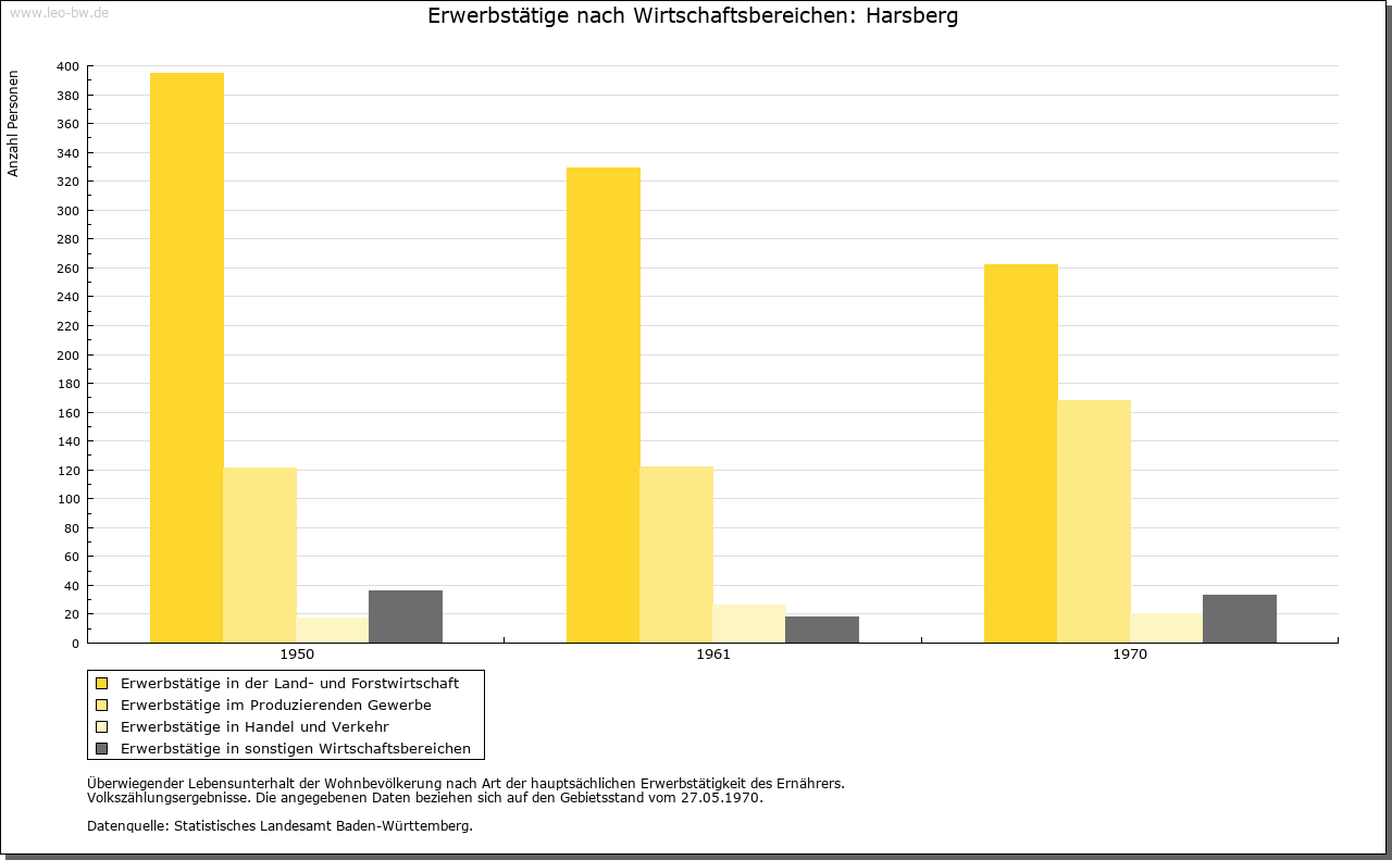 | Wirtschaft und Bevölkerung: | Auf der Basis der überlieferten Häuser- und Untertanenzahlen lassen sich für das frühere und spätere 17. Jahrhundert ungefähre Einwohnerzahlen errechnen, wobei der vom Dreißigjährigen Krieg verursachte Bevölkerungsverlust deutlich erkennbar wird. Harsberg hatte 1612 etwa 140 Einwohner, 1680 nur noch knapp hundert; in Baierbach halbierte sich die Zahl von etwa zweihundert auf hundert und in Oberhöfen (mit Beingasse) von etwa 150 auf hundert. In Renzen lebten um 1680 ungefähr achtzig bis neunzig Menschen, in Heuholz etwa dreißig. Im Lauf des 18. Jahrhunderts nahm die Zahl der Seelen wieder allgemein zu, jedoch von Ortsteil zu Ortsteil in ganz unterschiedlichem Maß. Die landwirtschaftlich genutzte Fläche bestand am Ende des 17. Jahrhunderts in Harsberg, Heuholz und Renzen annähernd zu gleichen Teilen aus Acker- und Wiesen- beziehungsweise Weideland, in Baierbach, Ober- und Unterhöfen jeweils zu etwa drei Vierteln aus Äckern und nur zu einem Viertel aus Wiesen und Gärten. Zur gleichen Zeit spielte der Weinbau in Harsberg (31 Morgen), Heuholz (26 ½ Morgen) und Renzen (25 Morgen) eine relativ große Rolle; in Baierbach gab es immerhin noch 13 Morgen Weingärten, während die Rebfläche in den übrigen Ortsteilen zu vernachlässigen ist. Im 18. Jahrhundert expandierte der Weinbau auf der Gemarkung weiter. In Heuholz und Renzen bestanden gemeinschaftliche Keltern der Herrschaften Hohenlohe-Waldenburg und -Neuenstein, in Harsberg und Renzen gab es Keltern, die Waldenburg allein gehörten. In Unterhöfen bestand von alters her eine Erbschenke. Die Rohrmühle findet bereits 1329 Erwähnung. |