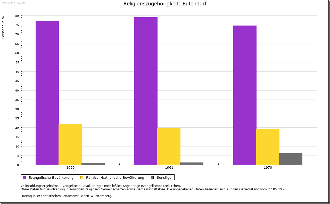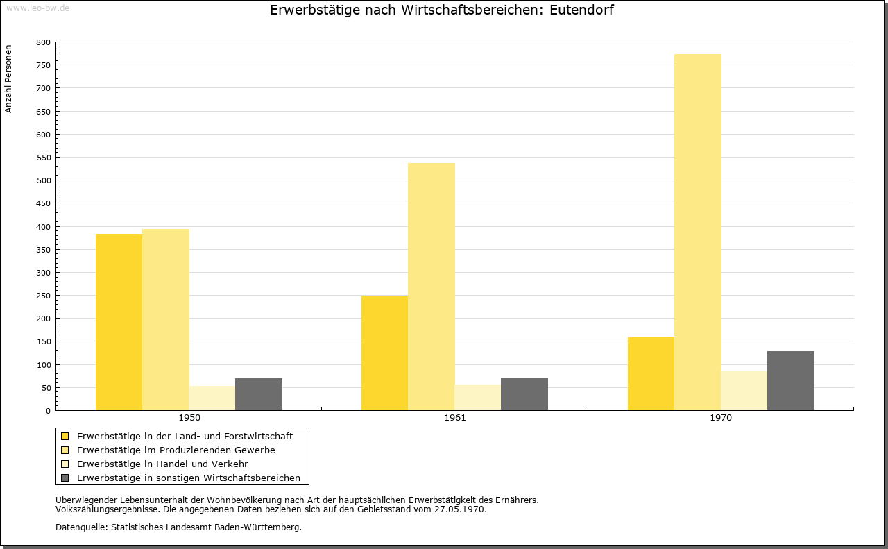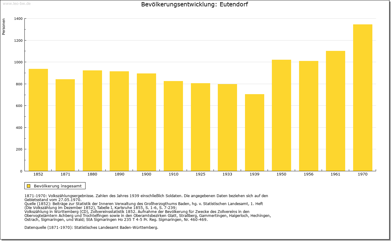 | Wirtschaft und Bevölkerung: | Aufgrund der Kriegsfolgen sank die Zahl der erwachsenen Einwohner in Eutendorf von 60 (1634) auf 38 (1637). Allein 1635 starben 63 Personen in der Pfarrei Eutendorf an Seuchen. Auch in Großaltdorf sank die Zahl der erwachsenen Bewohner von 18 (1634) auf 13 (1637). 1789 zählte Eutendorf mit Schweizerhalde 385, Großaltdorf 141, Kleinaltdorf 103, der Schleifrain zehn und Steigenhaus neun Einwohner. Bis 1807 stieg die Einwohnerzahl dieser Wohnplätze auf 661. Die Feldflur in Eutendorf, Groß- und Kleinaltdorf wurde in der Dreizelgenwirtschaft bebaut (1657). Weinbau und Kelter in Eutendorf sind für 1478 bezeugt (Anbaufläche 1570: 90 Morgen). Die Weinberge lagen am Schneitberg, in der Sandhalde, den Ebenäckern, am Linsenberg und am Zipfrain, die Großaltdorfer am Zipfrain. 1766 soll der letzte Weinberg aufgelassen worden sein. 1634 betrug der Viehbestand in Eutendorf 250 Rinder sowie 100 Schweine, 500 Schafe und 100 Geißen (Schmalvieh). In Großaltdorf gab es damals 50 Rinder sowie 150 Stück Schmalvieh. An Gewerbe sind für Großaltdorf möglicherweise für 1248 eine Mühle beziehungsweise für 1582 sicher eine Mahl- und Sägemühle nachweisbar. Eine Rolle spielte auch die Waldwirtschaft, wovon Regelungen zur Harzgewinnung in der Dorfordnung (1602), die 1731 erwähnte Rußbrenne in Eutendorf und der 1754 erwähnte Wohnplatz Aschenhütte bei Winzenweiler Zeugnis ablegen. 1790 werden ein Wirtshaus und eine Mostschenke in Eutendorf erwähnt. |