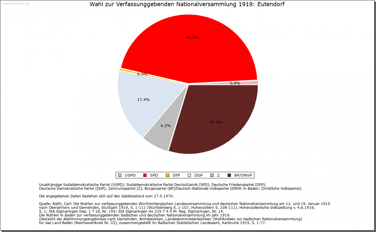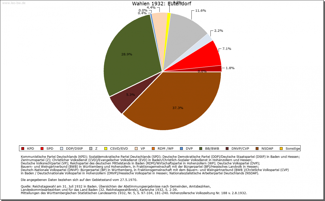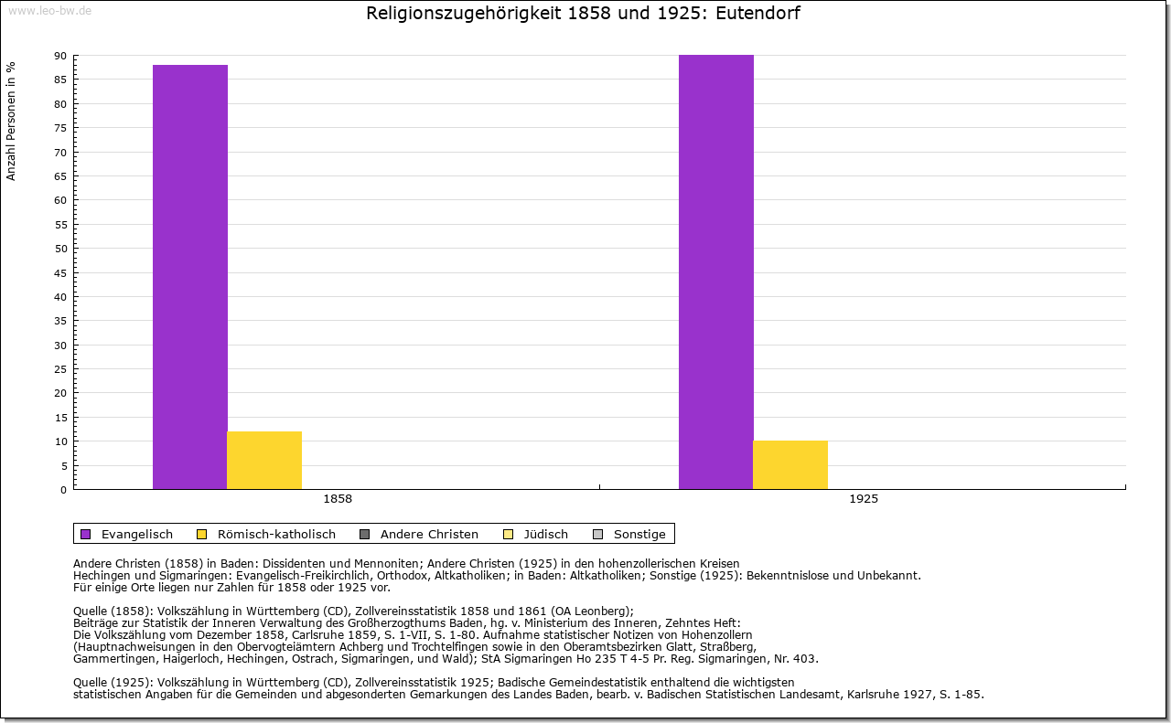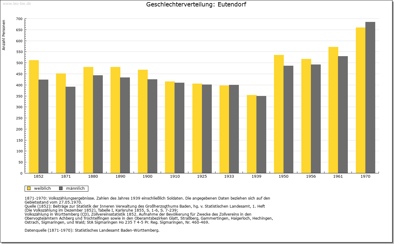 | Wirtschaft und Bevölkerung: | Aufgrund der Kriegsfolgen sank die Zahl der erwachsenen Einwohner in Eutendorf von 60 (1634) auf 38 (1637). Allein 1635 starben 63 Personen in der Pfarrei Eutendorf an Seuchen. Auch in Großaltdorf sank die Zahl der erwachsenen Bewohner von 18 (1634) auf 13 (1637). 1789 zählte Eutendorf mit Schweizerhalde 385, Großaltdorf 141, Kleinaltdorf 103, der Schleifrain zehn und Steigenhaus neun Einwohner. Bis 1807 stieg die Einwohnerzahl dieser Wohnplätze auf 661. Die Feldflur in Eutendorf, Groß- und Kleinaltdorf wurde in der Dreizelgenwirtschaft bebaut (1657). Weinbau und Kelter in Eutendorf sind für 1478 bezeugt (Anbaufläche 1570: 90 Morgen). Die Weinberge lagen am Schneitberg, in der Sandhalde, den Ebenäckern, am Linsenberg und am Zipfrain, die Großaltdorfer am Zipfrain. 1766 soll der letzte Weinberg aufgelassen worden sein. 1634 betrug der Viehbestand in Eutendorf 250 Rinder sowie 100 Schweine, 500 Schafe und 100 Geißen (Schmalvieh). In Großaltdorf gab es damals 50 Rinder sowie 150 Stück Schmalvieh. An Gewerbe sind für Großaltdorf möglicherweise für 1248 eine Mühle beziehungsweise für 1582 sicher eine Mahl- und Sägemühle nachweisbar. Eine Rolle spielte auch die Waldwirtschaft, wovon Regelungen zur Harzgewinnung in der Dorfordnung (1602), die 1731 erwähnte Rußbrenne in Eutendorf und der 1754 erwähnte Wohnplatz Aschenhütte bei Winzenweiler Zeugnis ablegen. 1790 werden ein Wirtshaus und eine Mostschenke in Eutendorf erwähnt. |