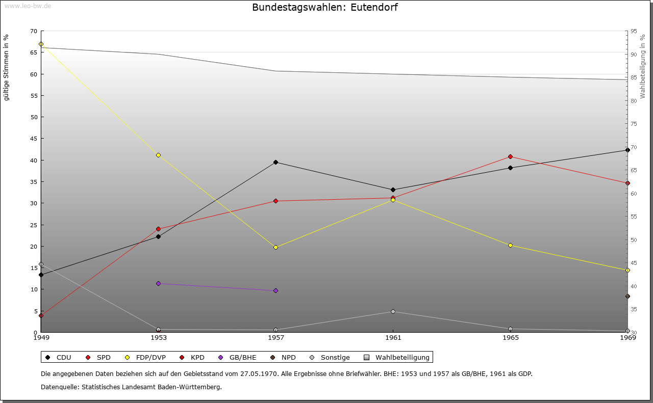 | Geschichte: | Bei der Erstnennung Eutendorfs (»Uodendorf«) 1091 wurde mit Bischof Emhard von Würzburg aus dem Comburger Grafengeschlecht als Inhaber des Zehnten auch der erste Grundherr erwähnt. Der Zehnt ging damals an die edelfreien Brüder »Winitherus« und »Richizo« von »Altorf«. Die ursprüngliche Schreibweise des Ortsnamens erschwert eine genaue Abgrenzung von Ottendorf. Der erstmals 1371 nachweisbaren Grundherrschaft Limpurgs gehörten 1582 drei Höfe, 18 Häuser, 19 Güter, fünf Lehen, zwei Selden und eine Hube. Das 1460 als Grundherr nachweisbare Comburg besaß 1478 drei Lehen und zwei Selden. Daneben hatten die Herren von Rot (1371) sowie Haller Bürger (1405) Besitz. Die Schenken waren auch in Groß- und Kleinaltdorf (1374) begütert. 1248 werden comburgische Höfe in »Altdorf« erwähnt. Comburg war auch in Winzenweiler begütert (1248), wo später die Herren von Crailsheim gleichfalls Besitzrechte (1350) hatten. Die Zehntrechte in Groß- und Kleinaltdorf sowie Winzenweiler gingen 1091–1120 an Comburg. 1462 gehörten dann dem Kloster in Winzenweiler und Kleinaltdorf zwei Drittel des Großzehnts. Auch der Eutendorfer Zehnt kam nach 1091 zum Teil an Comburg, denn 1384 gehörte dem Kloster neben der Pfarrei Eutendorf und dem Haller Geschlecht Rudolf ein Drittel desselben. 1669 verkaufte Comburg sein Drittel des Wein- und Fruchtzehnten und den halben Kleinzehnt in Eutendorf und Kleinaltdorf sowie ein Drittel des Großzehnten und den ganzen Kleinzehnten in Winzenweiler an Limpurg. Ein 1299 als Zeuge genannter »Heinricus de Utindorf« deutet auf ein Ortsadelsgeschlecht hin. Bei den 1091 genannten Edelfreien von »Altorf« dürfte es sich um Ortsadlige der Eutendorfer Wohnplätze Groß- und Kleinaltdorf gehandelt haben, da die in der Urkunde aufgezählten übrigen Orte, deren Zehntrechte an die Edelfreien gingen, zweifelsfrei im Umkreis von Eutendorf liegen. Der Ortsadel stand damals den Grafen von Comburg nahe. 1443 hatte Comburg die Vogtei über Eutendorf als Allod inne, das an die Herren von Weinsberg als Lehen vergeben war. Nach Erlangung der Vogtei auch über die comburgischen und murrhardtischen Güter verfügten die Limpurger später 1582 über alle hohe und niedere Gerichtsherrschaft. Auch Großaltdorf unterstand fast vollständig der Herrschaft Limpurgs, das über 17 Gemeinderechte verfügte, während Comburg nur eines besaß (1657). Die Vogtei in Winzenweiler ging von den Herren von Weinsberg über die Berler von Tullau (1363) an Comburg (1364) über, das seine Herrschaft dann bis zum Übergang an Württemberg 1802 wahren konnte. Erste Strukturen kommunaler Selbstverwaltung werden mit der Erwähnung von Gemeinden erkennbar (Eutendorf: 1478; Großaltdorf: 1582). 1602 erließen die Schenken für Eutendorf eine Gemeindeordnung. Der ursprünglich zum limpurgischen Amt Gaildorf gehörende Ort unterstand Ende des 18. Jahrhunderts dem Gaildorfer Landamt und kam 1807 zum Oberamt Gaildorf. 1807/08 war Eutendorf als Schultheißerei Eutendorf Teil des Gaildorfer beziehungsweise Unteren Amts des Patrimonialamts Gaildorf. Winzenweiler gehörte nach dem Übergang an Württemberg 1802/03 zum Oberamt Vellberg und ab 1808 gleichfalls zum Oberamt Gaildorf. Eutendorf wurde 1938 dem Landkreis Backnang zugeteilt. |