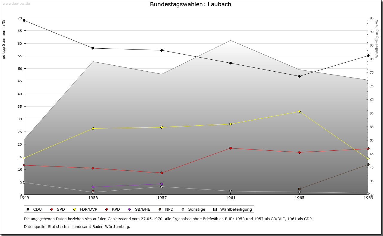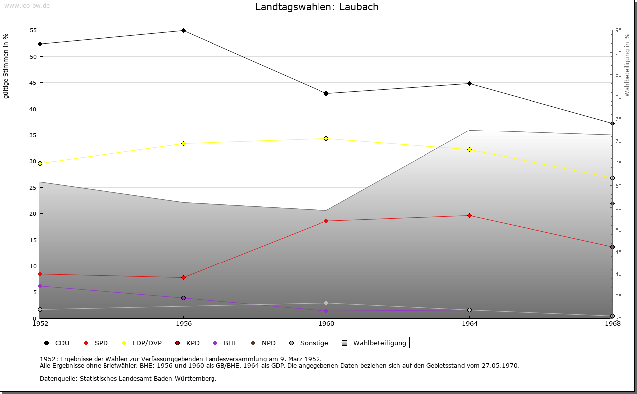 | Geschichte: | 12. Jahrhundert Lauben (ursprünglich entweder Bachname oder Stelle mit Laub und vom Ort auf den Bach übertragen). Das Schloß der Freiherren von Wöllwarth wurde 1599 von Hans Sigmund von Wöllwarth anstelle einer mittelalterlichen Burg erbaut. Es liegt auf einem steilen Hügelvorsprung zwischen Lein und Reichenbach. Das innere Schloß umschließt einen unregelmäßigen Hof, in dessen einem Winkel der Turm steht. Ein viereckiger und zwei runde Ecktürme springen in den Zwinger vor. Abgesehen von der Schenkung eines Mansus durch den Laien Konrad an Kloster Ellwangen und die Erwähnung einer Luitgart von Laubach (beides 12. Jahrhundert), beginnen urkundliche Nachrichten über den Ort erst mit Georg von Wöllwarth (gestorben 1434), dem Stifter der Laubacher Linie des Geschlechts, in deren Besitz das Schloß bis heute gebheben ist. Die Wöllwarth erlangten 1582 für Laubach den Blutbann mit Stock und Galgen. Der beim Ritterkanton Kocher immatrikulierte Ort fiel 1806 an Württemberg und wurde dem Oberamt, seit 1938 Landkreis Aalen zugeteilt. |