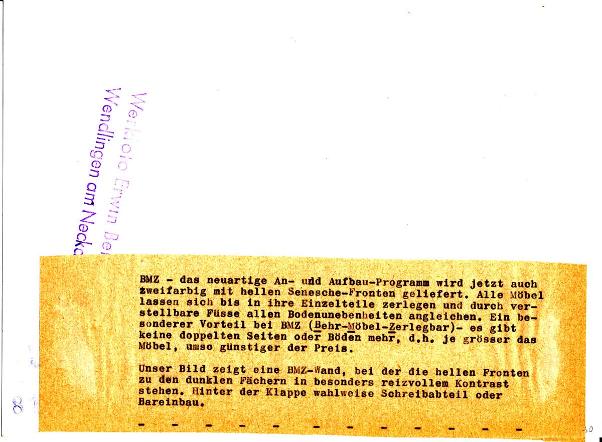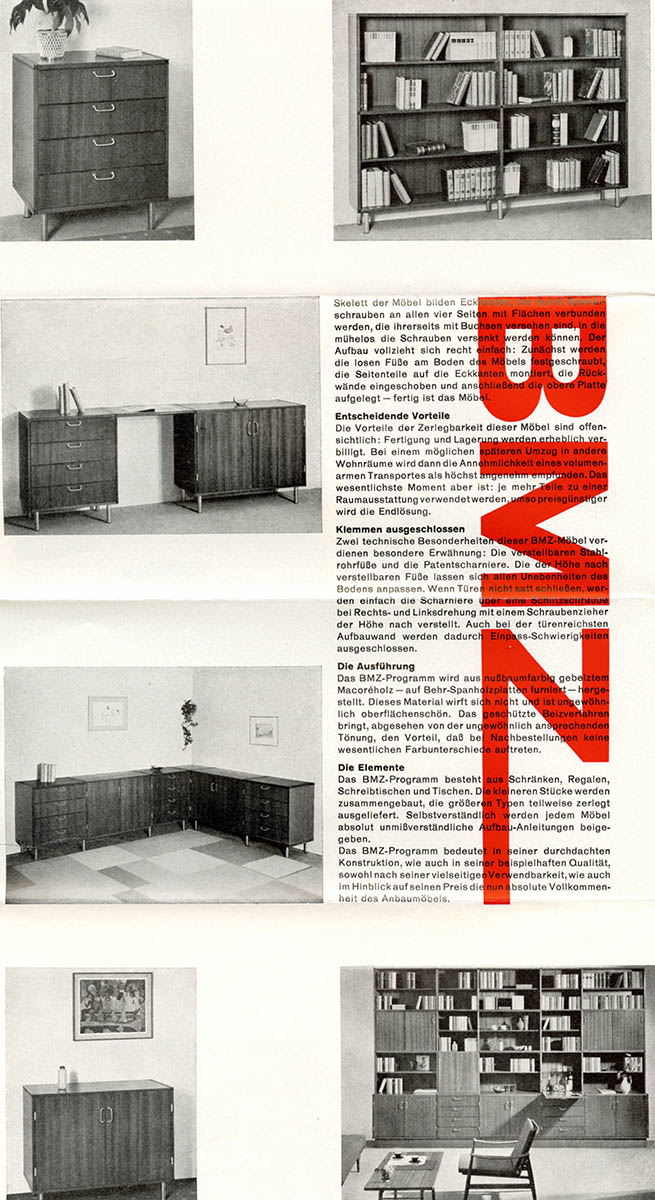 Firmenschrift / Möbelindustrie: Produktfaltblatt zum Möbelprogramm "BMZ" [Copyright: