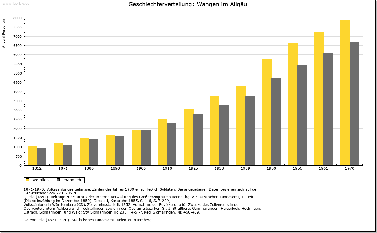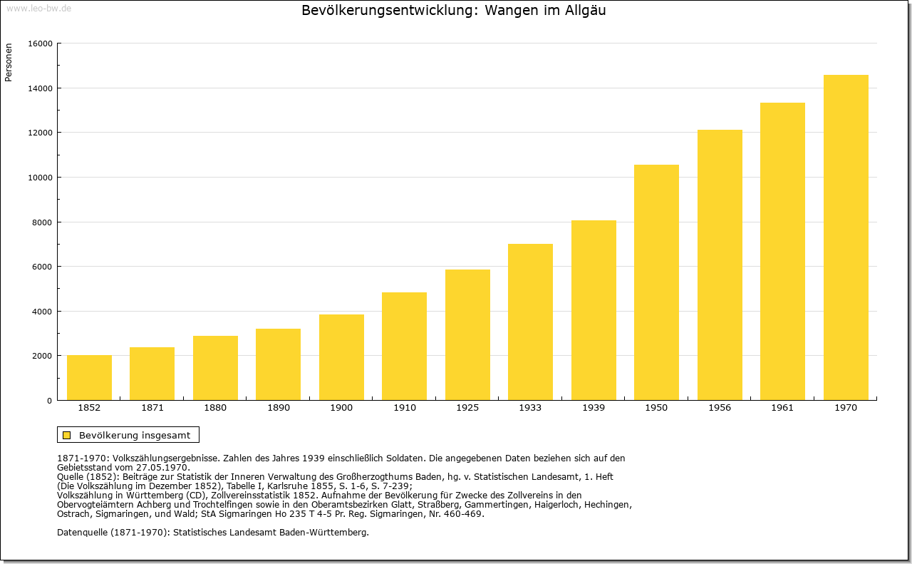 | Ortslage und Siedlung (bis 1970): | Die staufische Stadtgründung umfasste wohl schon die ganze »Oberstadt« mit der breiten Herrenstraße als Hauptachse. Sie schloss damit von Anfang an oder wenigstens sehr früh die am Südrand gelegene Pfarrkirche und den Kelhof in den Mauerring ein (Teile der dörflichen Vorgängersiedlung, die sich im übrigen weiter nach Westen hingezogen hatte). Die Stadtbefestigung folgte auf der Ostseite etwa der natürlichen Geländekante des Abhangs zur Argenniederung. In der 1. Hälfte des 15. Jahrhunderts wurde sie aber an das Flussufer verlegt, so dass sich die Stadtfläche durch Einschluss des rechtsseitigen Talgrundes fast verdoppelte (Unterstadt). Auf dem zugeschütteten alten Graben zwischen beiden Teilen entstand die Spitalstraße. An der Leutkircher, Lindauer und Isnyer Straße bildeten sich in der frühen Neuzeit kleine Vorstädte. Im ganzen ist das mittelalterliche Altstadtbild noch verhältnismäßig ungestört erhalten. Das gilt vor allem für die Oberstadt (Herrenstraße-Markt-Paradiesstraße). Die Altstadt steht deshalb als Gesamtanlage unter Denkmalschutz. Bahnhof 1880, danach allmählicher Ausbau des Bahnhofsviertels, ab 1913 Auflassung des alten Friedhofs (von 1576). Gewerbliche Ansiedlungen nördlich des Bahnhofs sowie an der Argen oberhalb und unterhalb der Stadt. Vor dem 2. Weltkrieg Wohnsiedlungen westlich der Bahnlinie im Gebiet Haslach und am Gehrenberg sowie als damals größte Neuanlage die Praßbergsiedlung. Seit 1950 ausgedehnte Neubautätigkeit. Schon 1949 war der Baubeginn des neuen Wohngebiets Wittwais links der Ravensburger Straße, abgesetzt von der übrigen Stadt. Es folgte die Bebauung des Waltersbühls rechts der Ravensburger Straße (im Anschluss an die Praßbergsiedlung) sowie des westlichen Engelbergs an der Leutkircher Straße und des Atzenbergs an der Isnyer Straße. Zur selben Zeit auch starke Erweiterung der Stadt nach Westen durch das neue Wohngebiet Berger Höhe bis zum Altenheim Sankt Vinzenz in schöner Hanglage. Ab 1970 wurde das Neubaugebiet Waltersbühl rechts der Ravensburger Straße in Nordwestrichtung bis an die Herfatzer Steige ausgedehnt (mit Punkthochhäusern, Einkaufszentrum, an der Ravensburger Straße auch Gewerbeansiedlung). Diese Bebauung ist noch im Gange. Seit 1972 auch das neue Wohngebiet Auwiesen im Süden der Stadt mit zwei Punkthochhäusern im Bau. In der Stadt kreuzen sich die Bundesstraße 18 und Вundesstraße 32. Für die Вundesstraße 32 wird zur Zeit eine Umgehungsstraße im Оsten der Altstadt (mit neuer Argenbrücke) gebaut. |