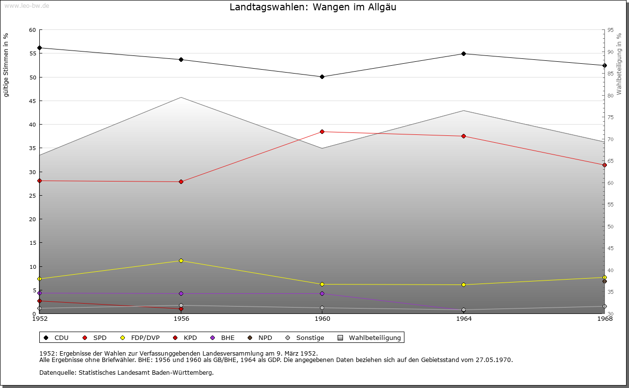 | Geschichte: | 815 Wangun, 1217 Wanga, 1267 Wangen. Keimzelle der Stadt war ein im Niederdorf (westlich des alten Friedhofs) gelegener Maier- oder Kelhof des Klosters Sankt Gallen. Wohl noch in der 2. Hälfte des 12. Jahrhunderts. Gründung eines Marktes durch das Kloster. Dieser wurde von König Friedrich II. vor 1217 zur Stadt erhoben. Das Niederdorf ging bis zum 15. Jahrhundert in der Stadt auf, in die auch der Maierhof verlegt wurde. Die Vogtei über den Markt und den Maierhof lag zunächst bei den Udalrichingern und gelangte spätestens 1191 von den Grafen von Pfullendorf an die Hohenstaufen. Verpfändung im 13. Jahrhundert unter anderem auch an das Kloster Sankt Gallen, spätestens 1286 wieder in der Hand des Königs. 1286 Verleihung des Rechts der Stadt Überlingen und Bestätigung des Wochenmarkts am Freitag (1330 auf Mittwoch verlegt). Erneute Verpfändung der Vogtei an Kloster Sankt Gallen, danach kriegerische Auseinandersetzung mit dem Kloster. Vor 1348 Rückkauf der verpfändeten Vogtei durch die Stadt von den Grafen von Montfort und Übergabe an das Reich. Die letzten Rechte des Klosters Sankt Gallen wurden 1608 abgelöst. Zunächst stand ein vom Kloster eingesetzter Amman an der Spitze der Stadt. 1217 erste Erwähnung eines Bürgers, 1306 eines Rates. Um 1350 Einführung der Zunftverfassung, gewählter Bürgermeister an der Spitze der Stadt. 4 Zünfte: Bäcker (ehemalige Bauernzunft), Schmiede, Weber und Schuhmacher. 1552 neue kaiserliche Rats- und Gerichtsverfassung. Ab 1678 Verfassungsstreitigkeiten, 1718 durch kaiserlichen Schiedsspruch entschieden. Blutbann seit 1402. Malstätte des Landgerichts auf Leutkircher Heide und in der Birs. Sitz der Kanzlei des Ritterkantons Hegau-Bodensee-Allgäu. Das Territorium der Stadt bestand aus dem Gerichtsbezirk Deuchelried (ab dem 14. Jahrhundert erworben), den Hauptmannschaften Niederwangen (ab 1431) und Wohmbrechts-Thann (ab 1497) sowie vorübergehend aus Pfandbesitz der Herrschaft Neuravensburg (1586 bis 1608) und der Grafschaft Eglofs (1516 bis 1582). 1802 kam Wangen zum Kurfürstentum Bayern, 1810 zu Württemberg. Sitz eines Oberamtes (seit 1938 Landkreises). Amtliche Bezeichnung »Wangen im Allgäu« 1936. Von den 4 Toren der Oberstadt stehen noch das Ravensburger oder Frauentor im Norden (1472 Kümpfelstor) und das Lindauer oder Martinstor im Westen (1347 Sweglartor), beide in einer späteren Form von 1608. Auch das vom Markt nach Оsten zur Argen herabführende Pfaffentor blieb erhalten, weil das spätere Rathaus daran angebaut wurde (»Ratloch«). Abgebrochen wurde das Peterstor im Nordosten am Ende der Schmiedgasse. In der Nähe der Argenbrücke stand das Isnyer oder Georgstor, im 19. Jahrhundert ebenso wie mehrere andere Türme der Stadtmauer abgebrochen. Erhalten dagegen an der Nordostecke der Wasserturm (heute fälschlich Pulverturm). Rathaus mit spätromanischem Kern, Mitte des 16. Jahrhunderts um- und ausgebaut, 1620 Anbau des Waaghauses, 1719/21 Vorbau zum Markt mit Barockfassade. Außeninstandsetzung 1976. Hinderofenhaus, 1542 von der Familie Hinderofen erbaut. 1640 bis 1656 Wohnsitz der Kapuziner, dann Stadtkanzlei. 1802 Sitz des bayerischen Landrichters, 1810 des württembergischen Oberamtmanns, 1938 Landratsamt, 1973 Finanzamt. Frühklassizistisches Haus der Ritterschaft von 1789 (Franz A. Bagnato) am Ende der Herrenstraße. In der Unterstadt das Kornhaus von 1595. Spitalmühle aus dem 16. Jahrhundert, Instandsetzung seit 1971 erfolgt (seit 1978 Stadtmuseum). Im Anschluss daran konnte hier ein Stück der Stadtmauer durch Hausabbrüche freigelegt werden. Deutsche Schule 1524 erwähnt. Lateinschule schon 1329, seit 1845 Realschule, seit 1928 Oberschule, jetzt Gymnasium. Industrie- und Handarbeitsschule seit 1820. |